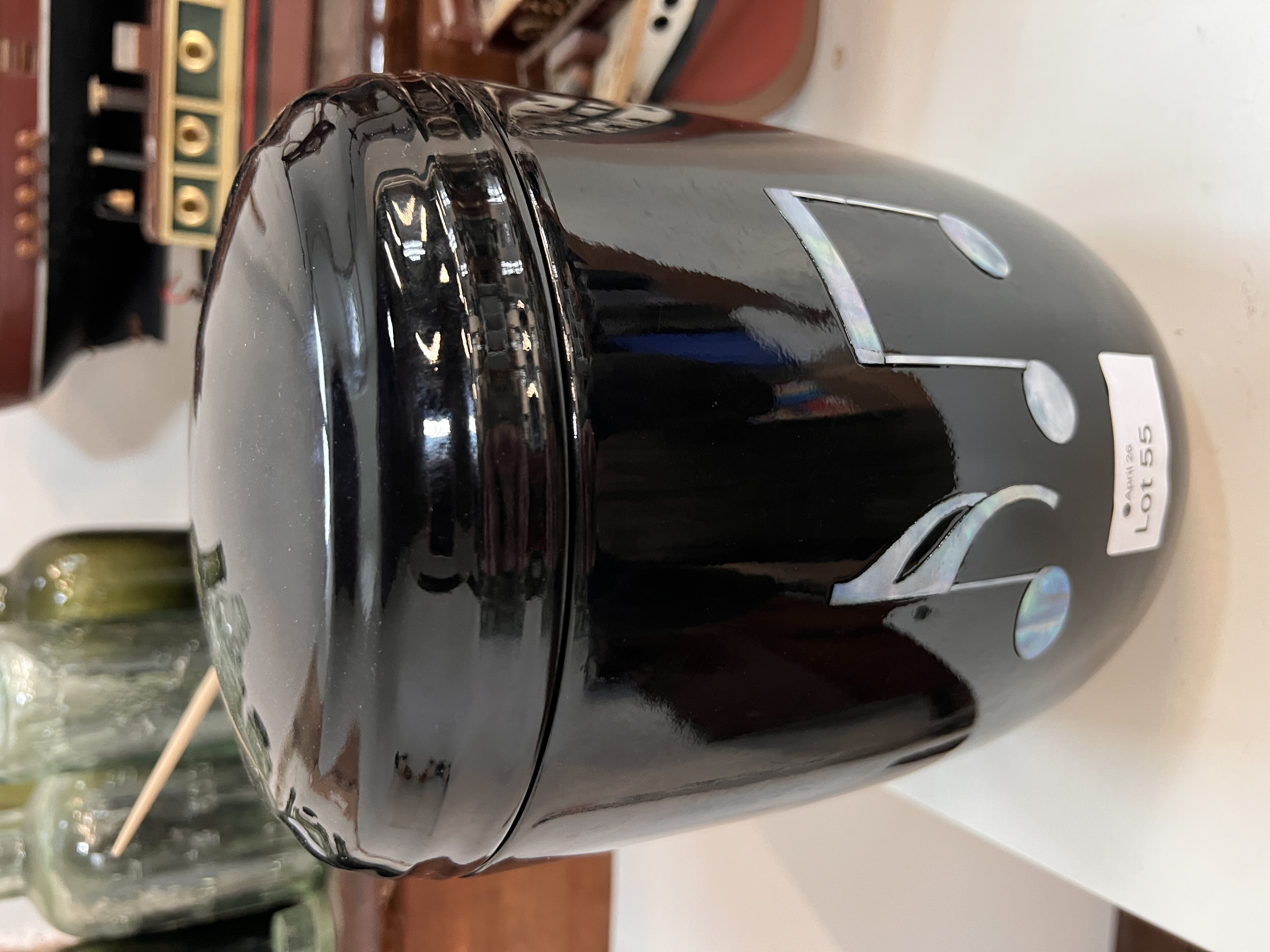 An ice bucket lacquer worked and inlaid with mother of pearl .
