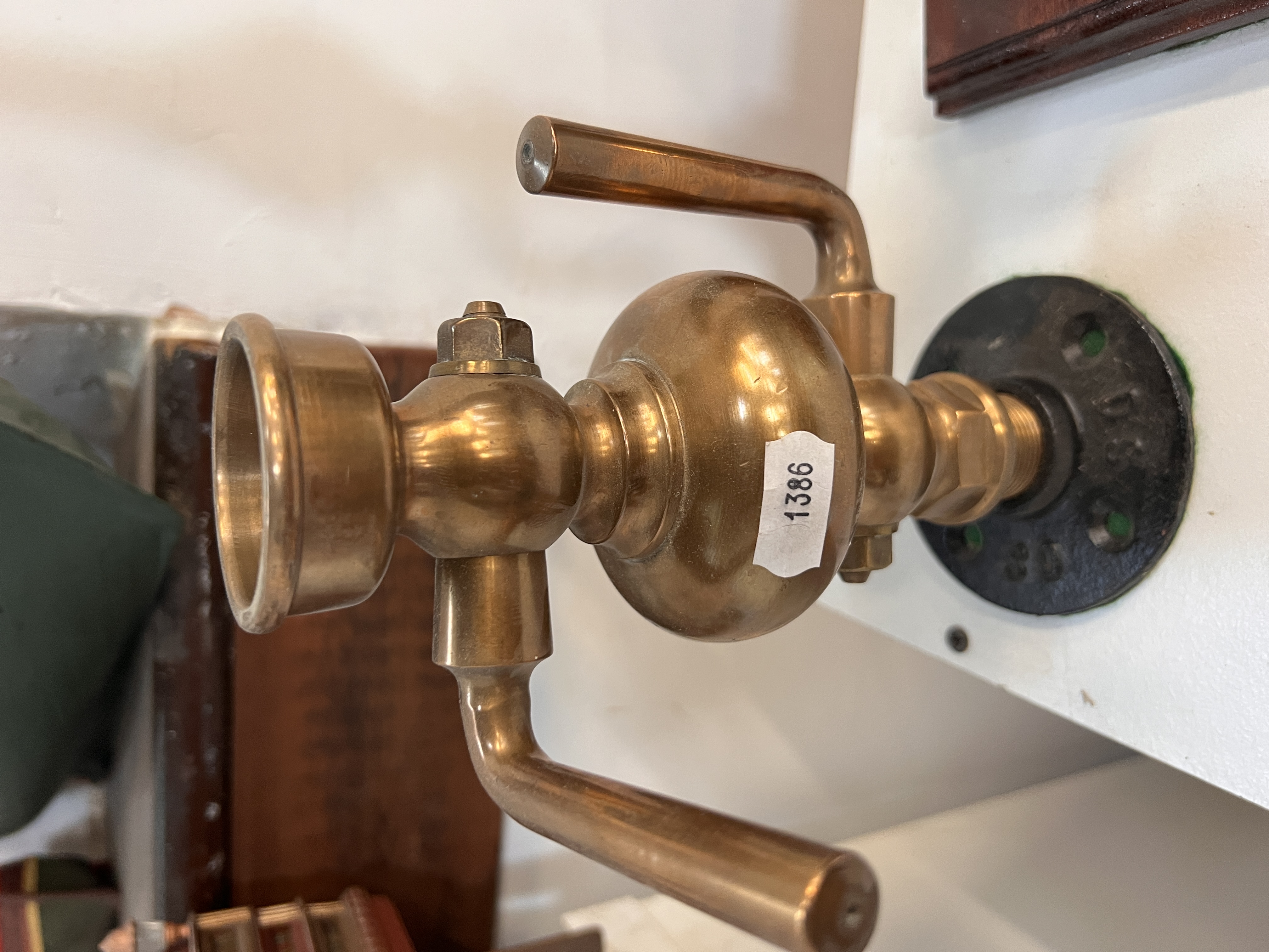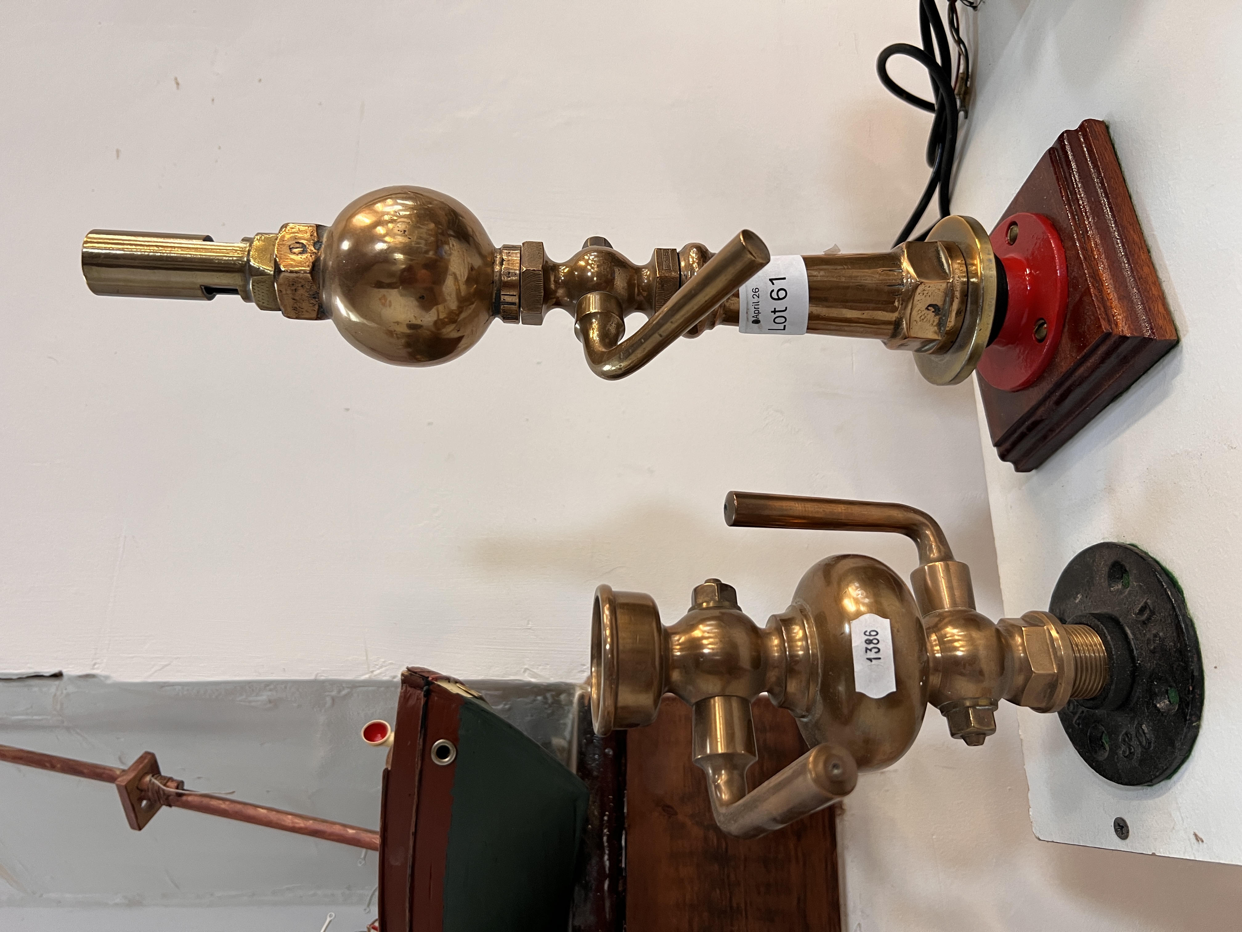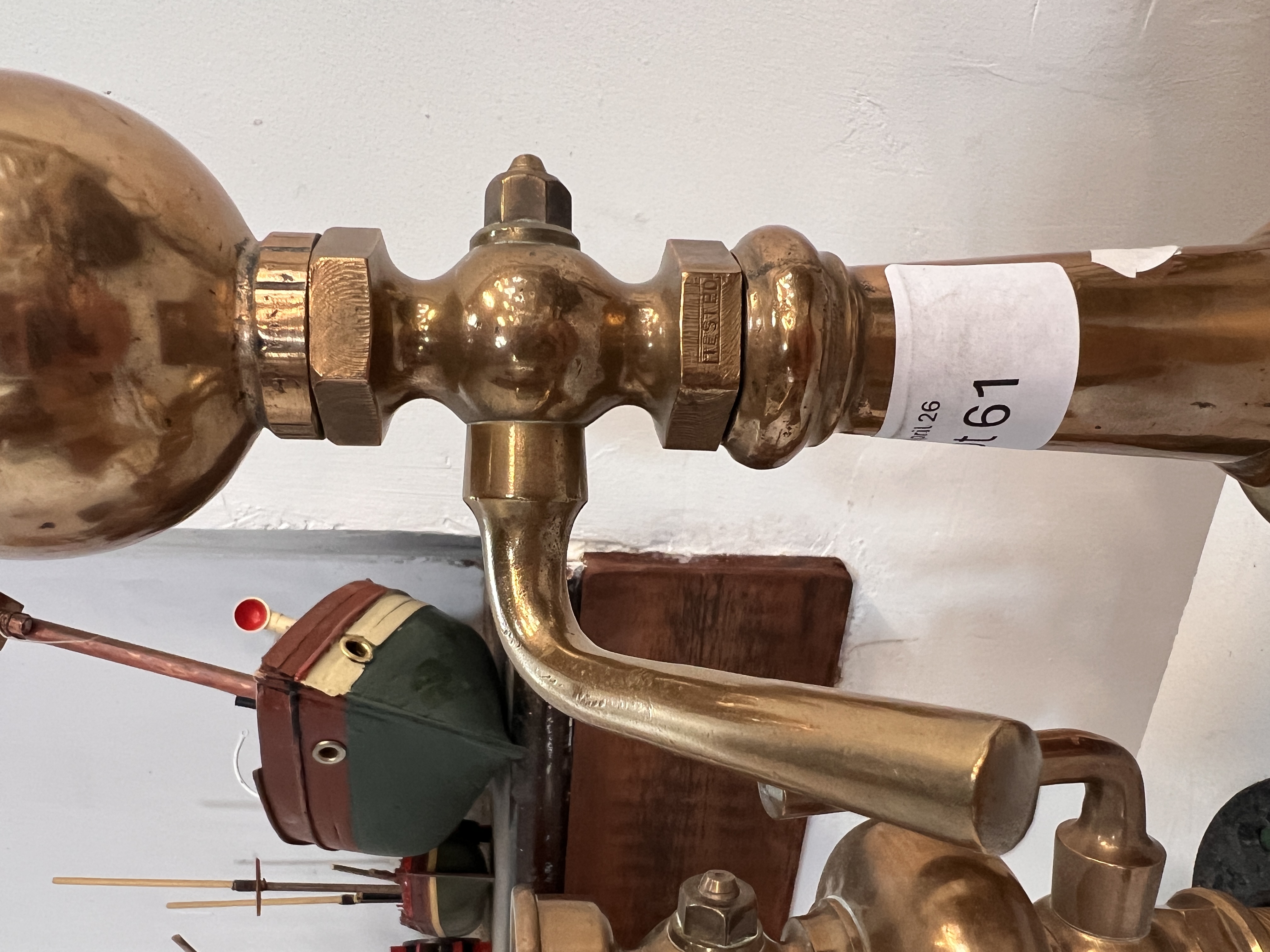 An antique brass locomotive or industrial steam whistle 35cm tall with similar brass valve.