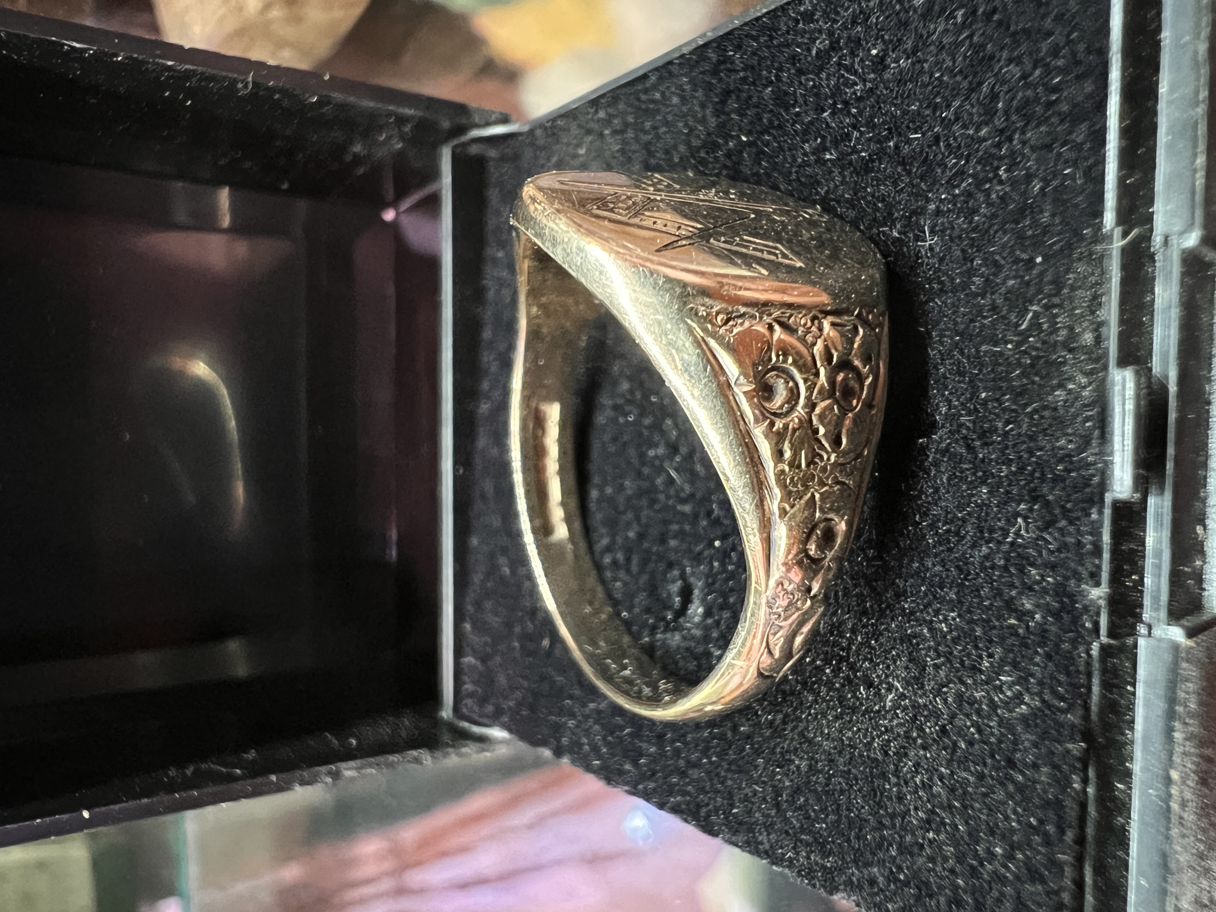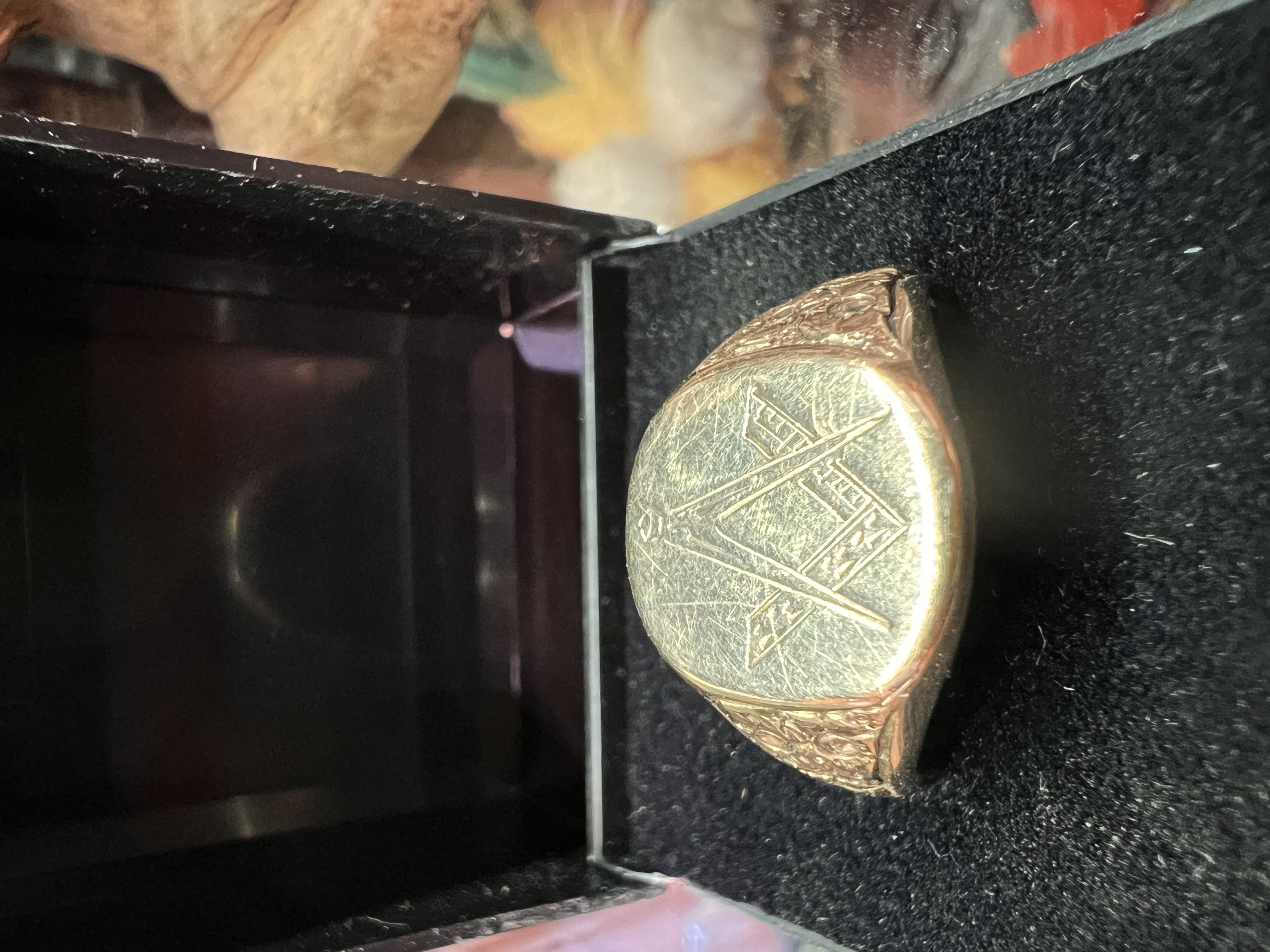 A gents hallmarked 9kt gold signet ring with masonic decoration. 7.65g