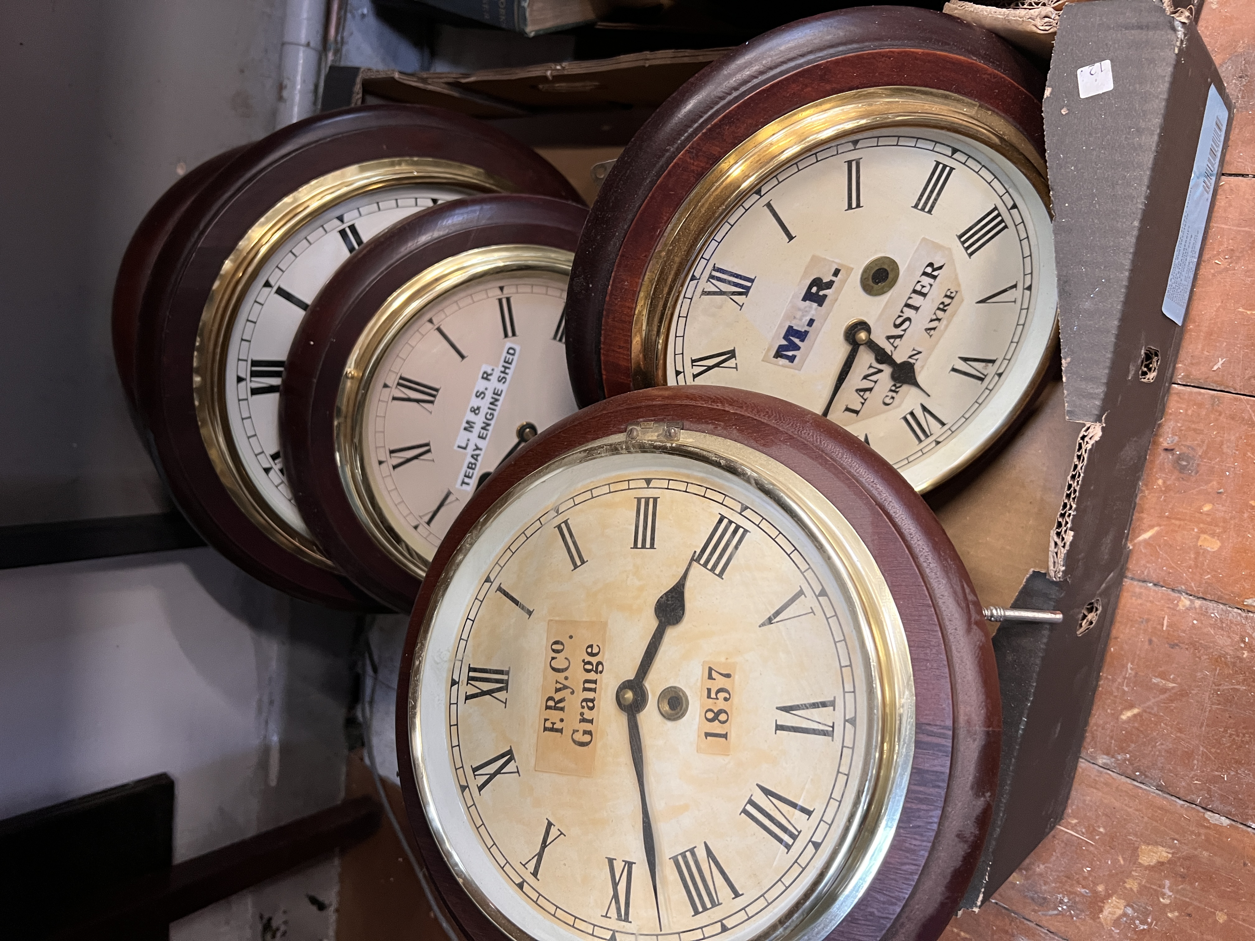 A selection of wooden cased battery operated clocks.