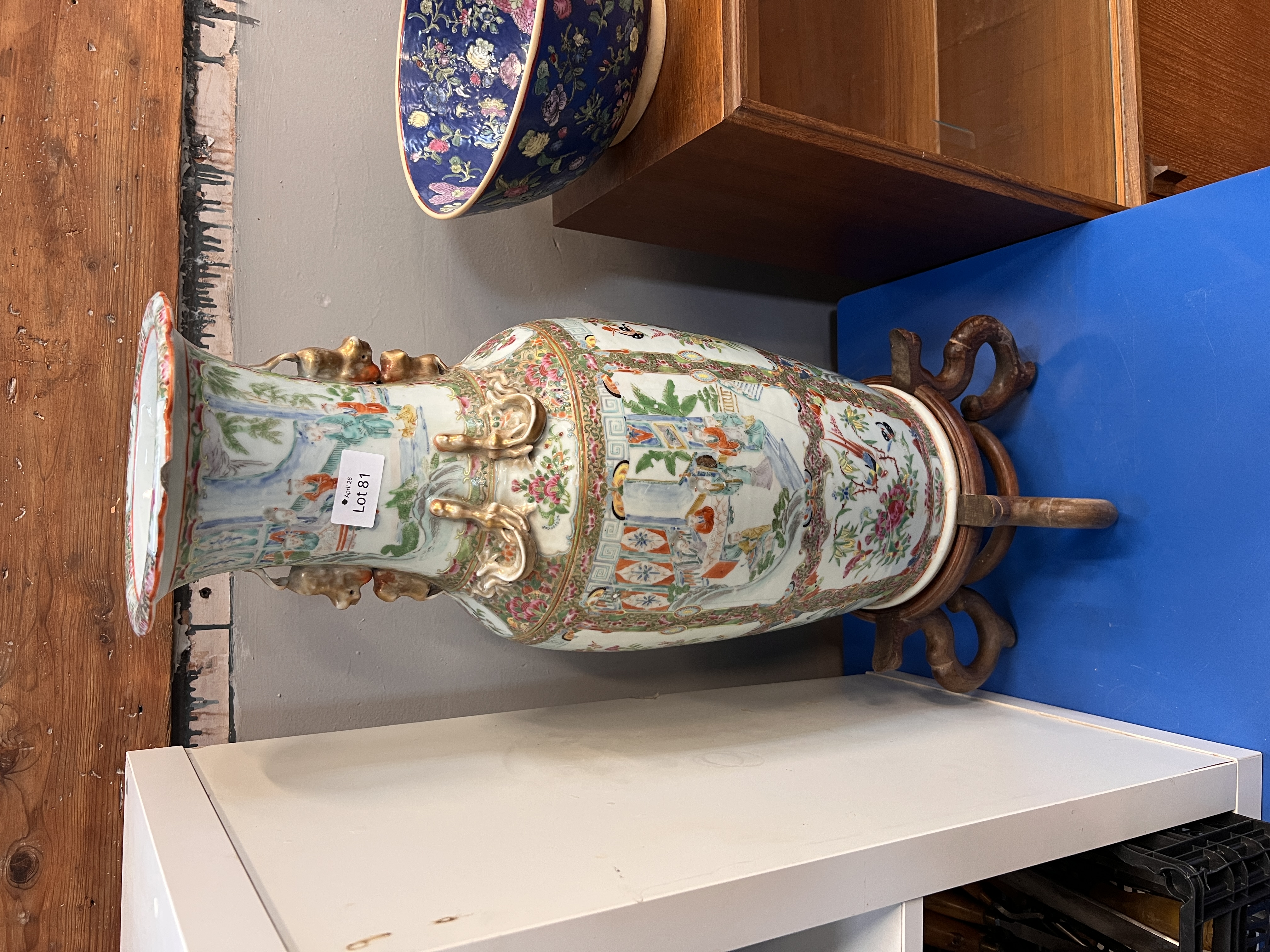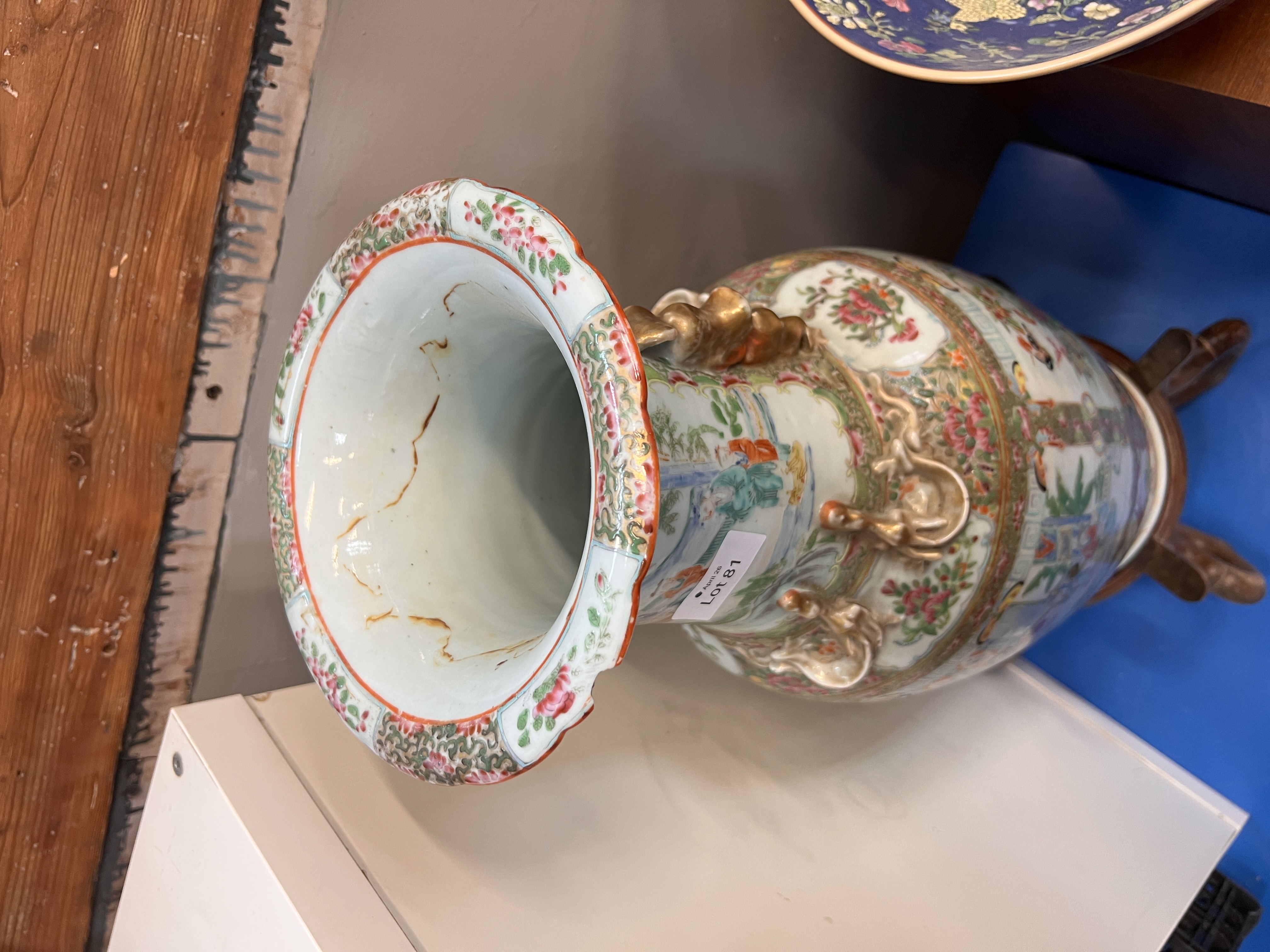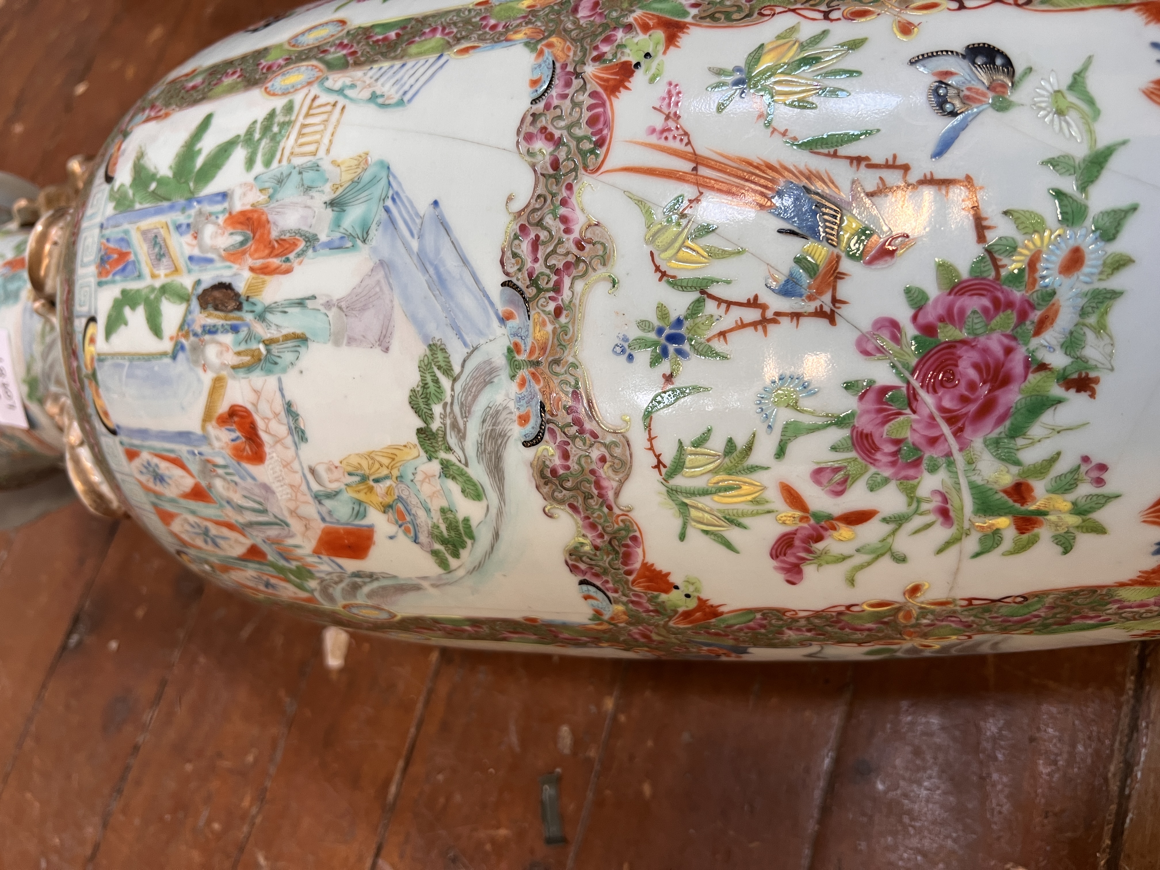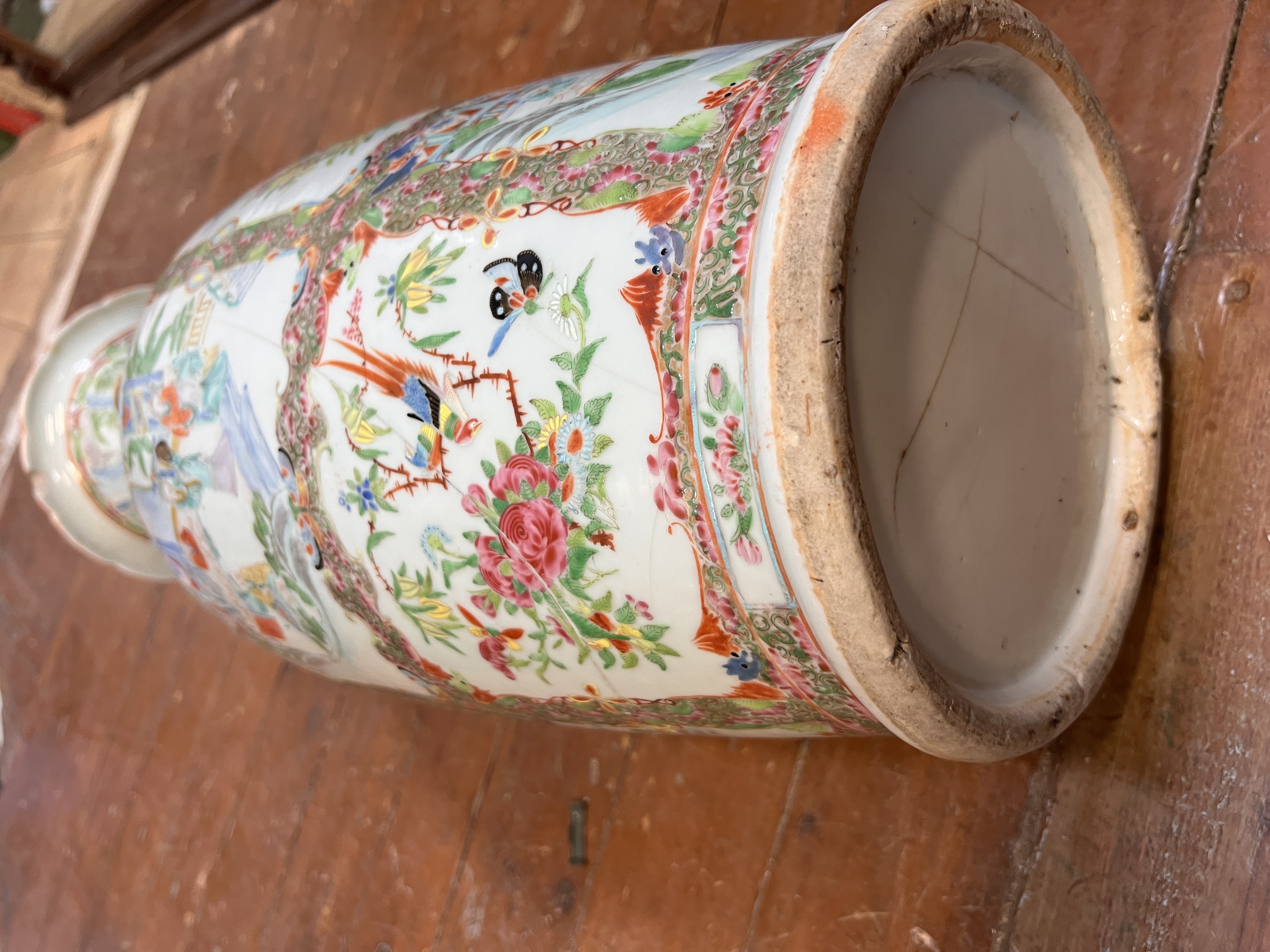 A large Chinese porcelain Tongzhi famille rose vase. Decorated with scenes of scholars and exotic birds. 61cm tall. As found.