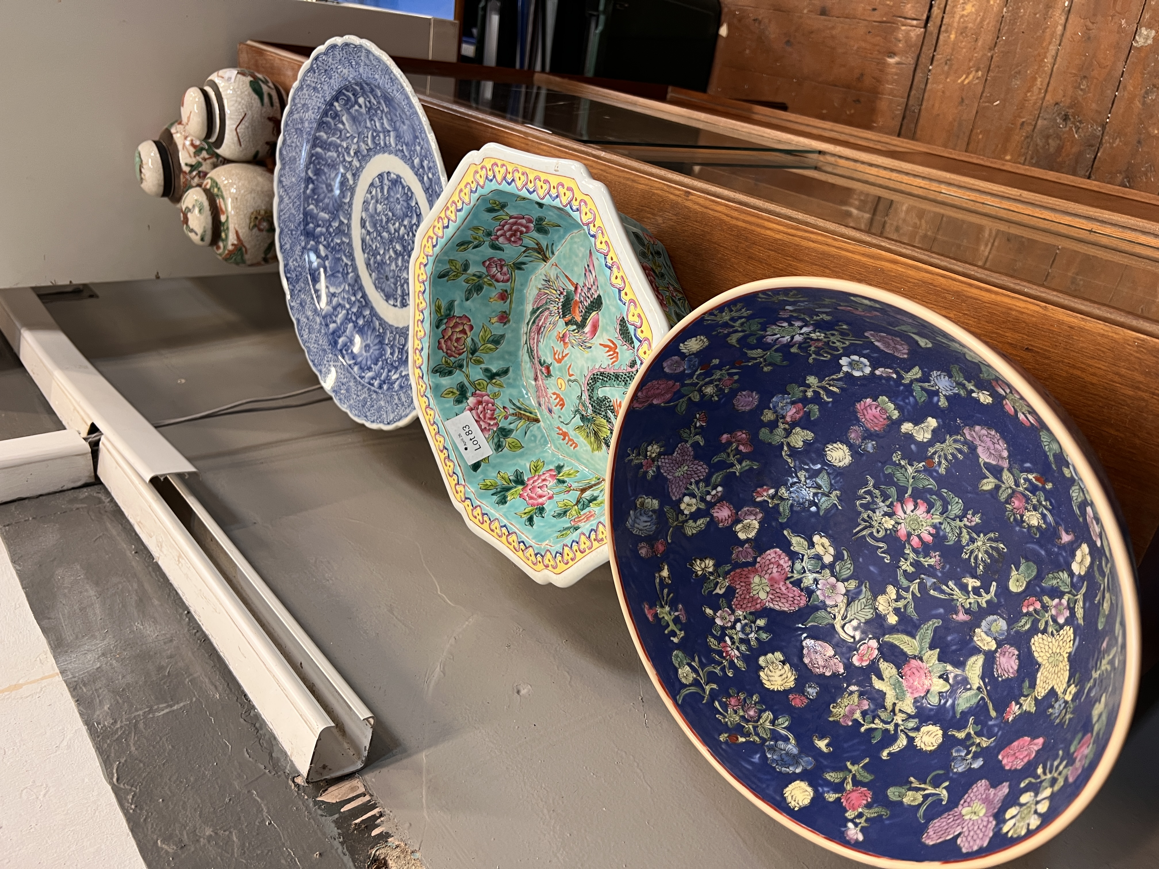 Two Chinese porcelain bowls and a similar Japanese design charger plate.