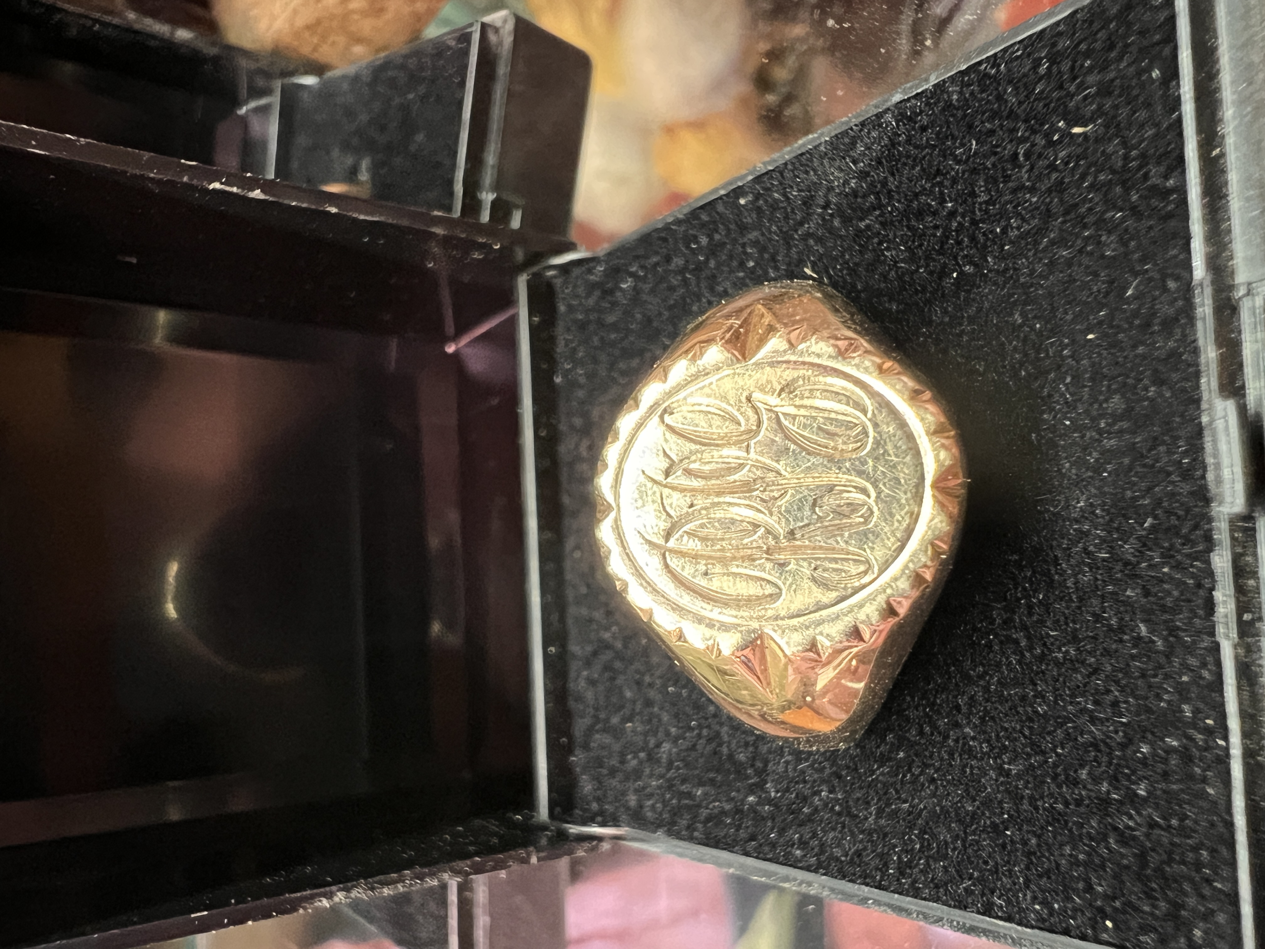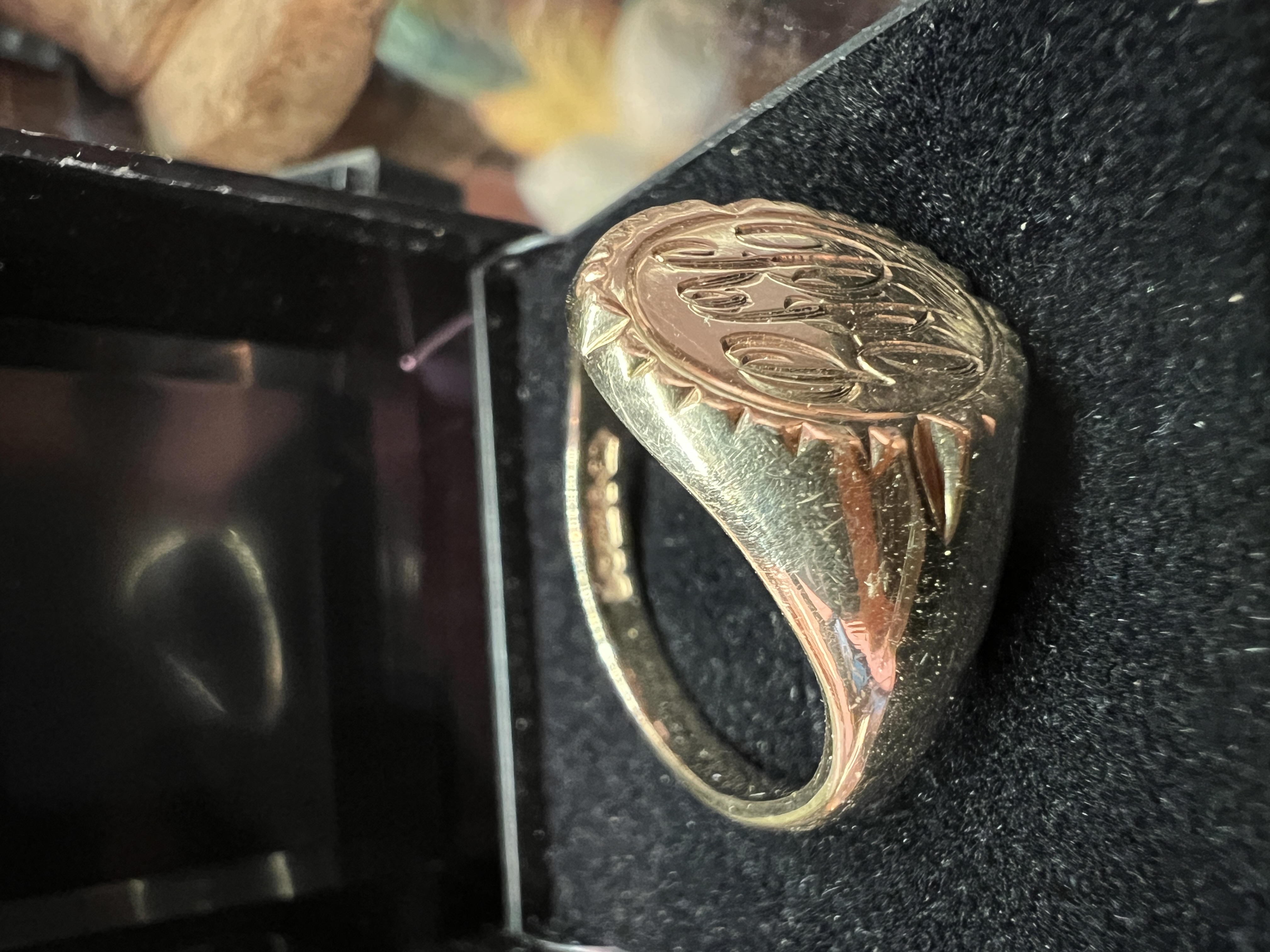A gents hallmarked gold signet ring engraved RPG. 9kt, 9.25g