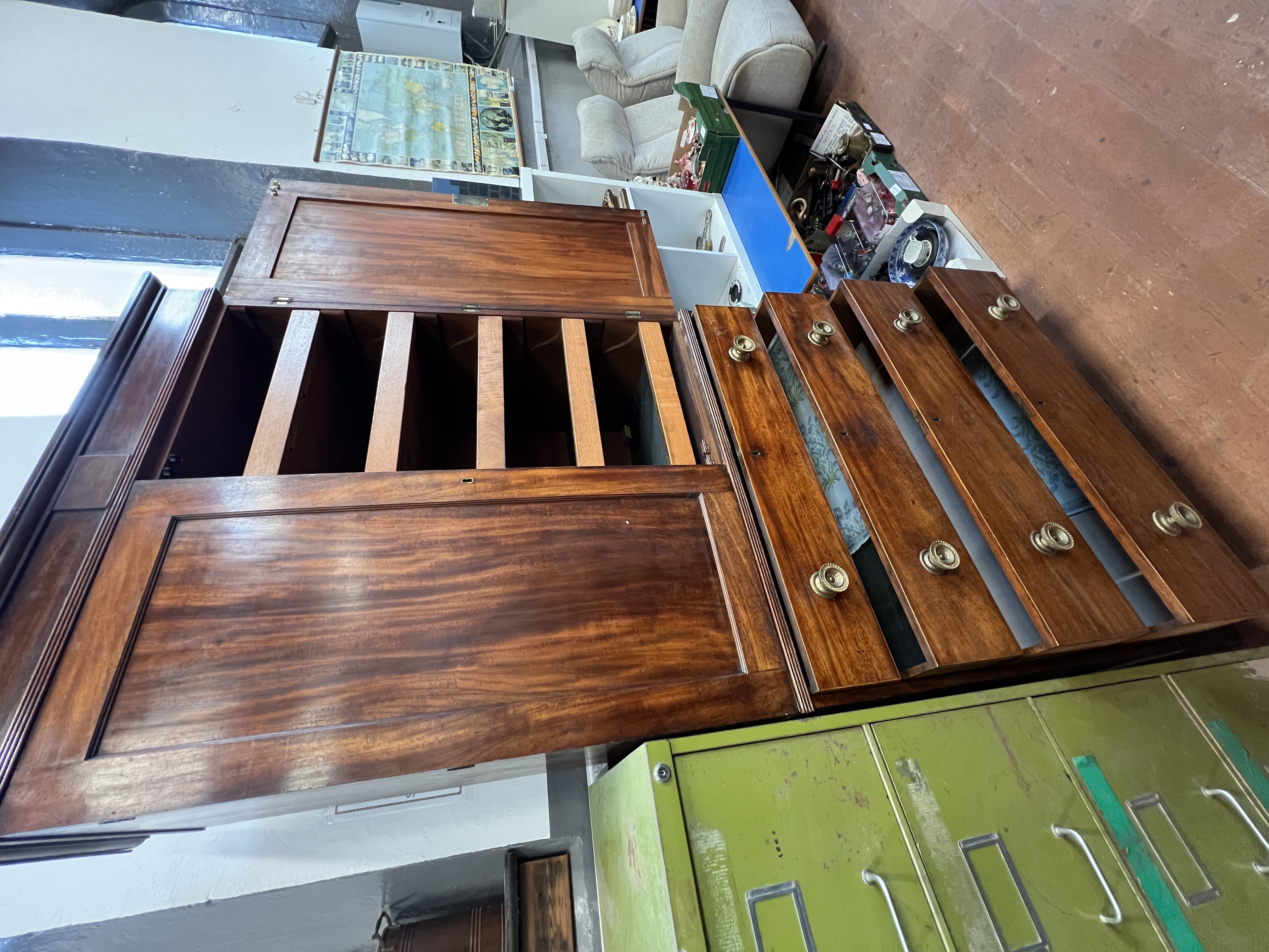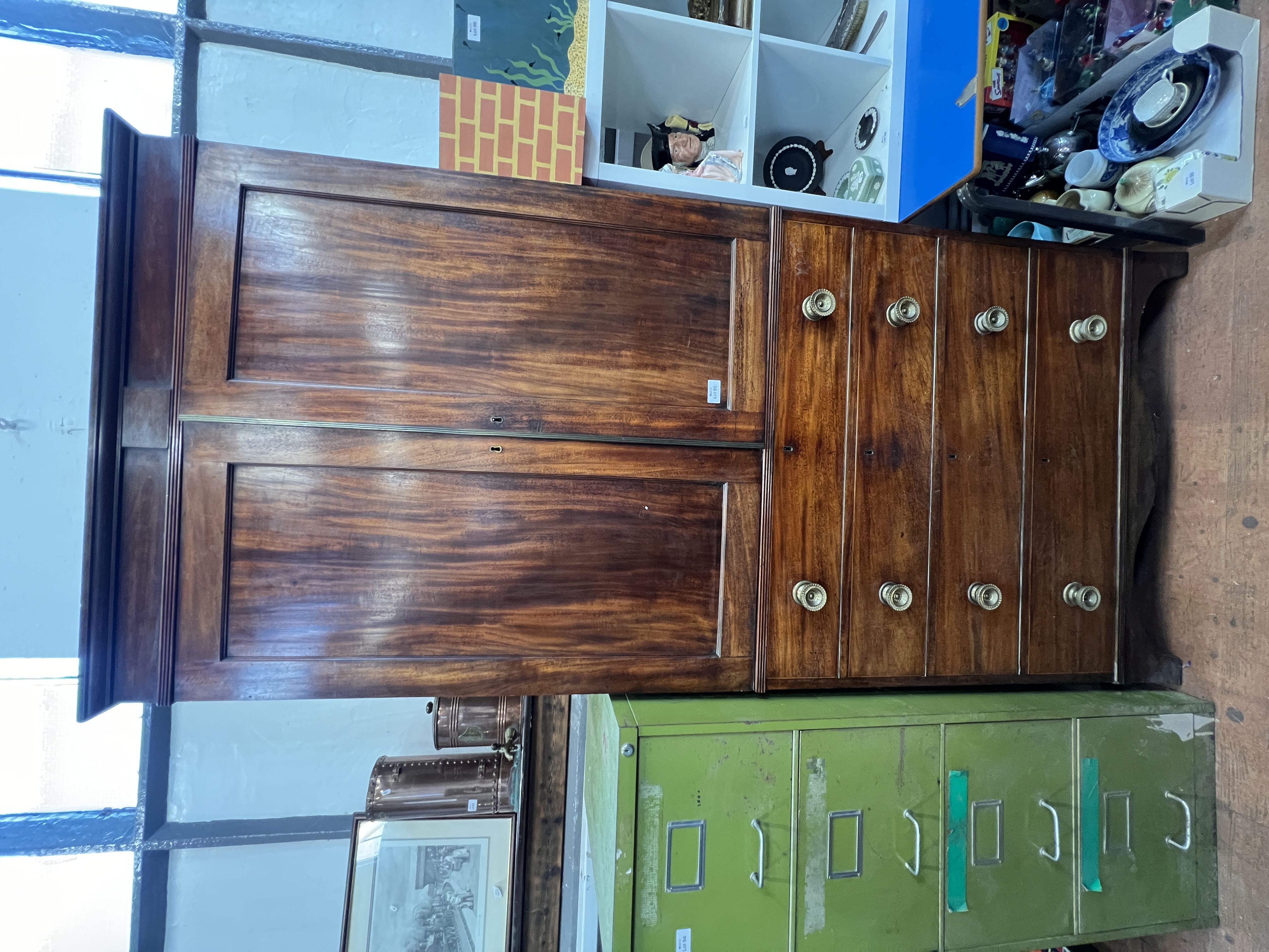 An impressive Victorian flame mahogany linen chest of four drawers with over cupboard having five cedar lined drawers