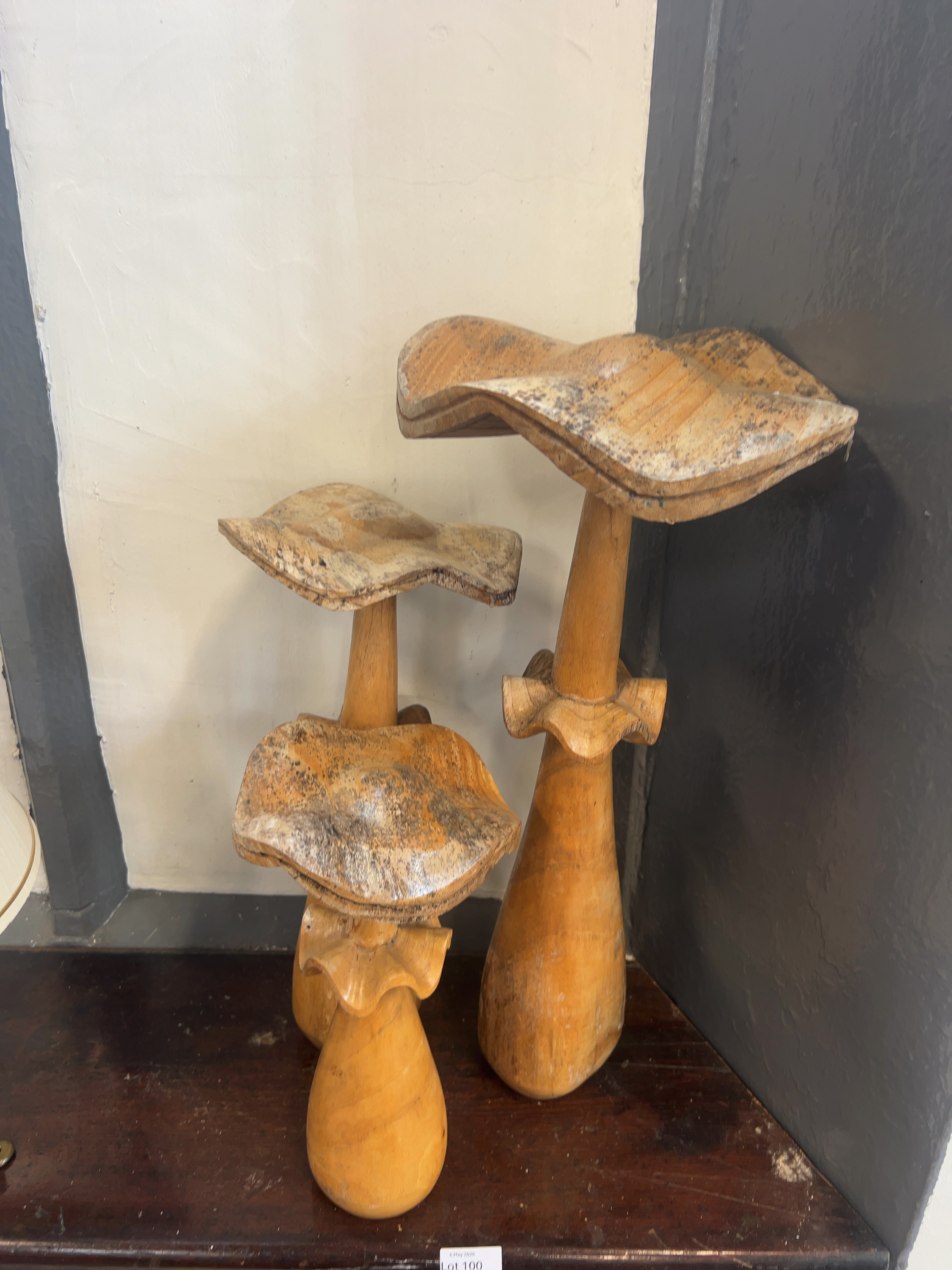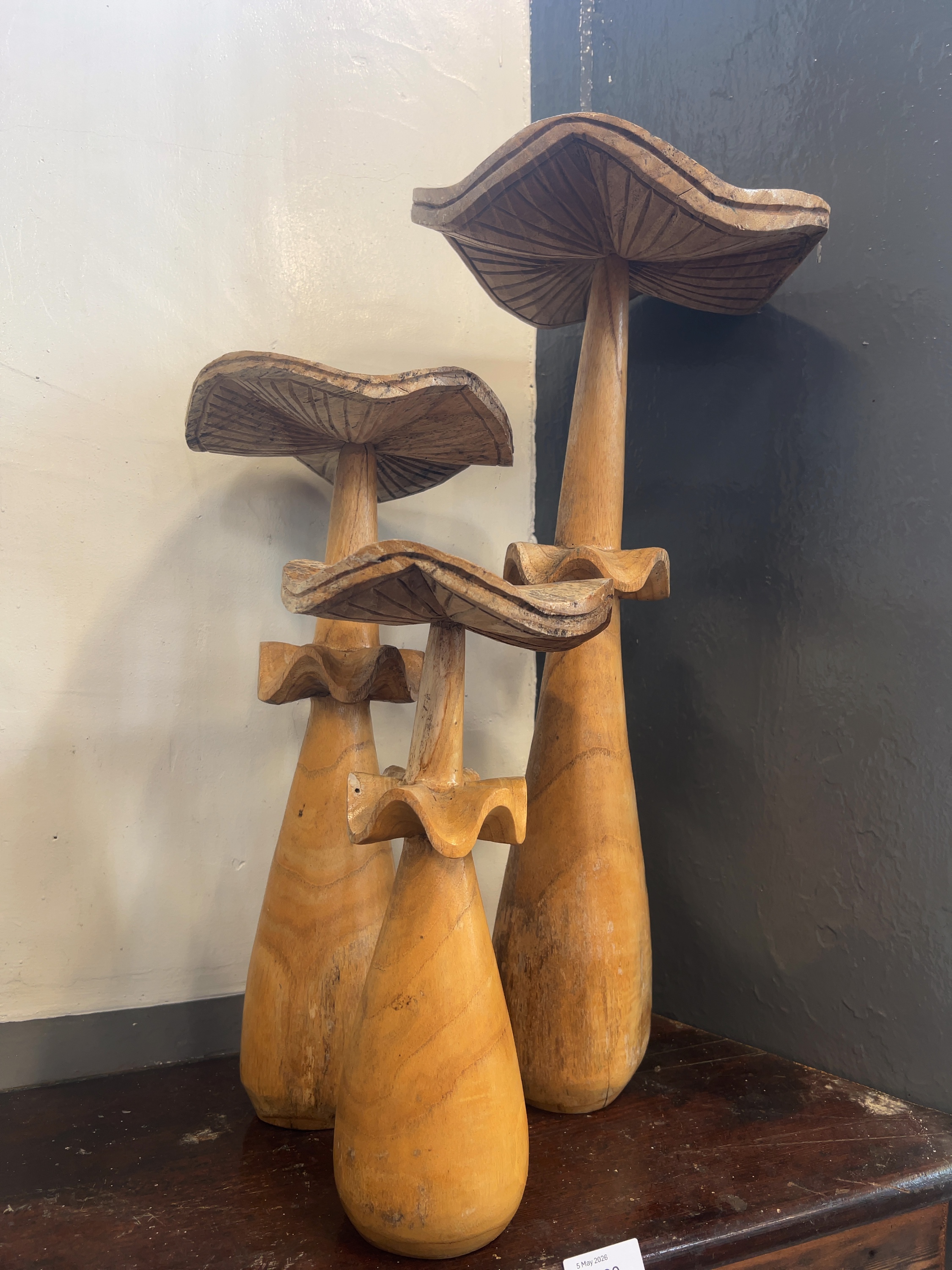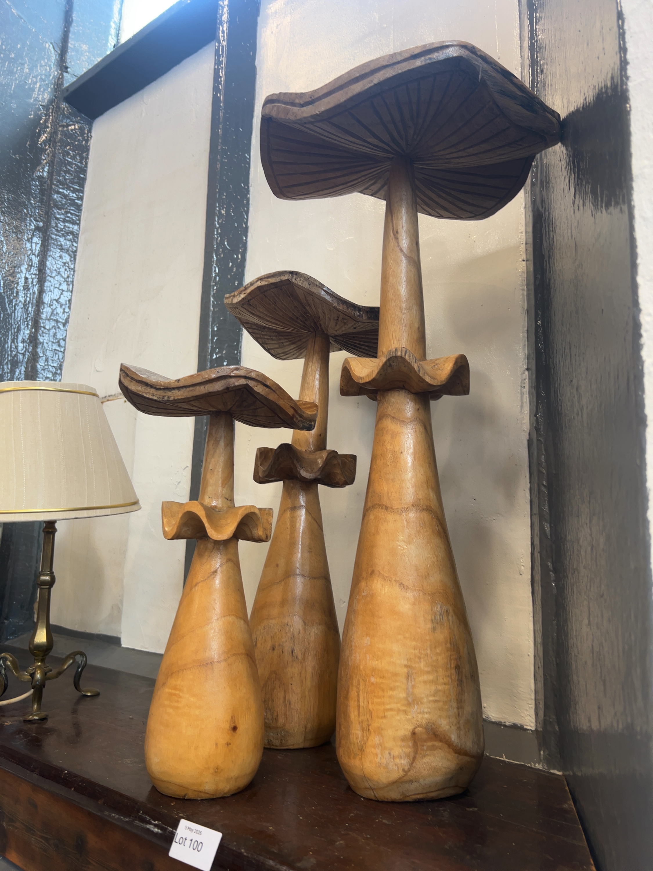 This lot comprises a trio of stylised, hand-carved wooden mushroom sculptures of graduated heights, likely executed in a light-toned hardwood with a clear-coated finish.