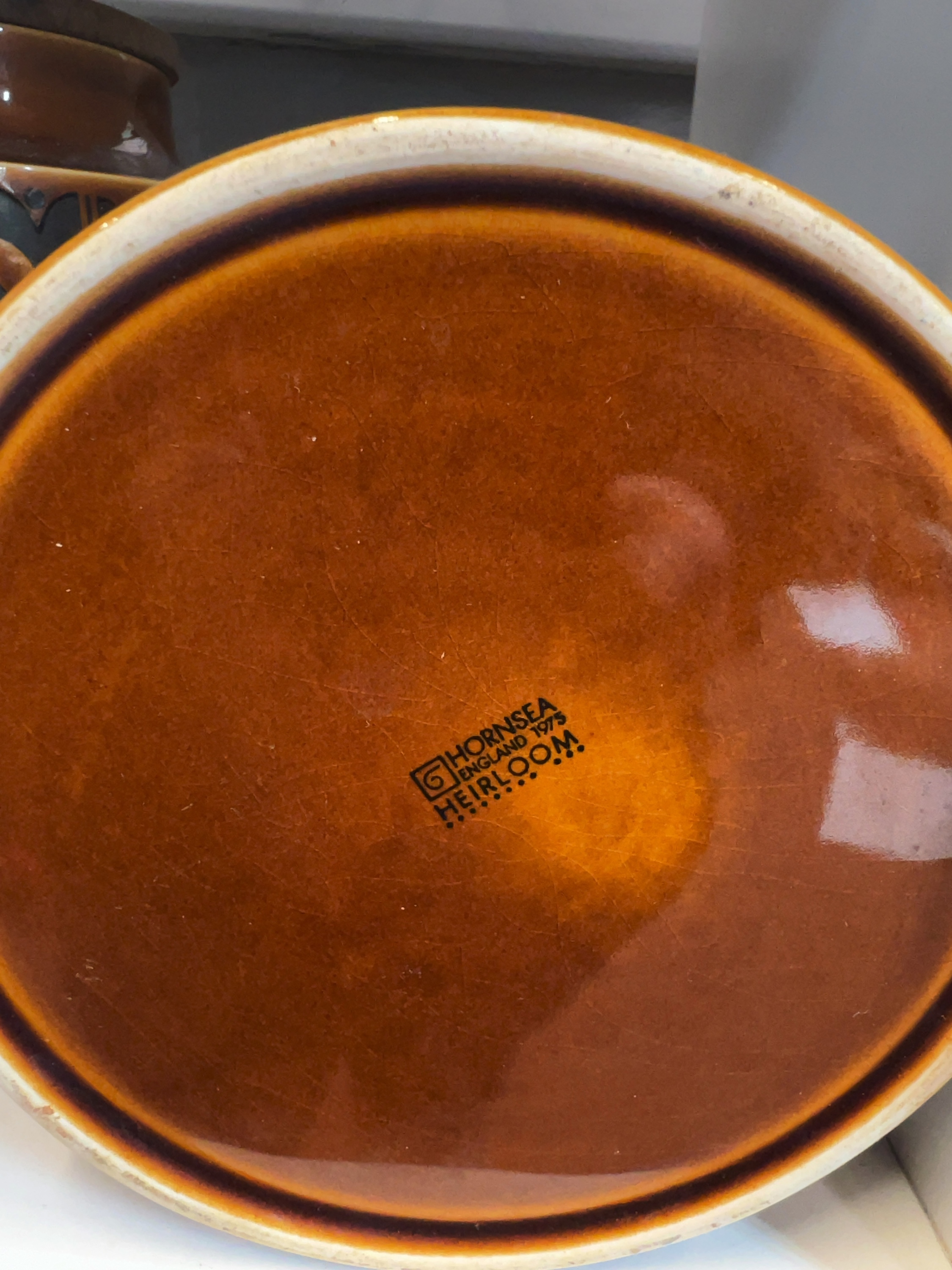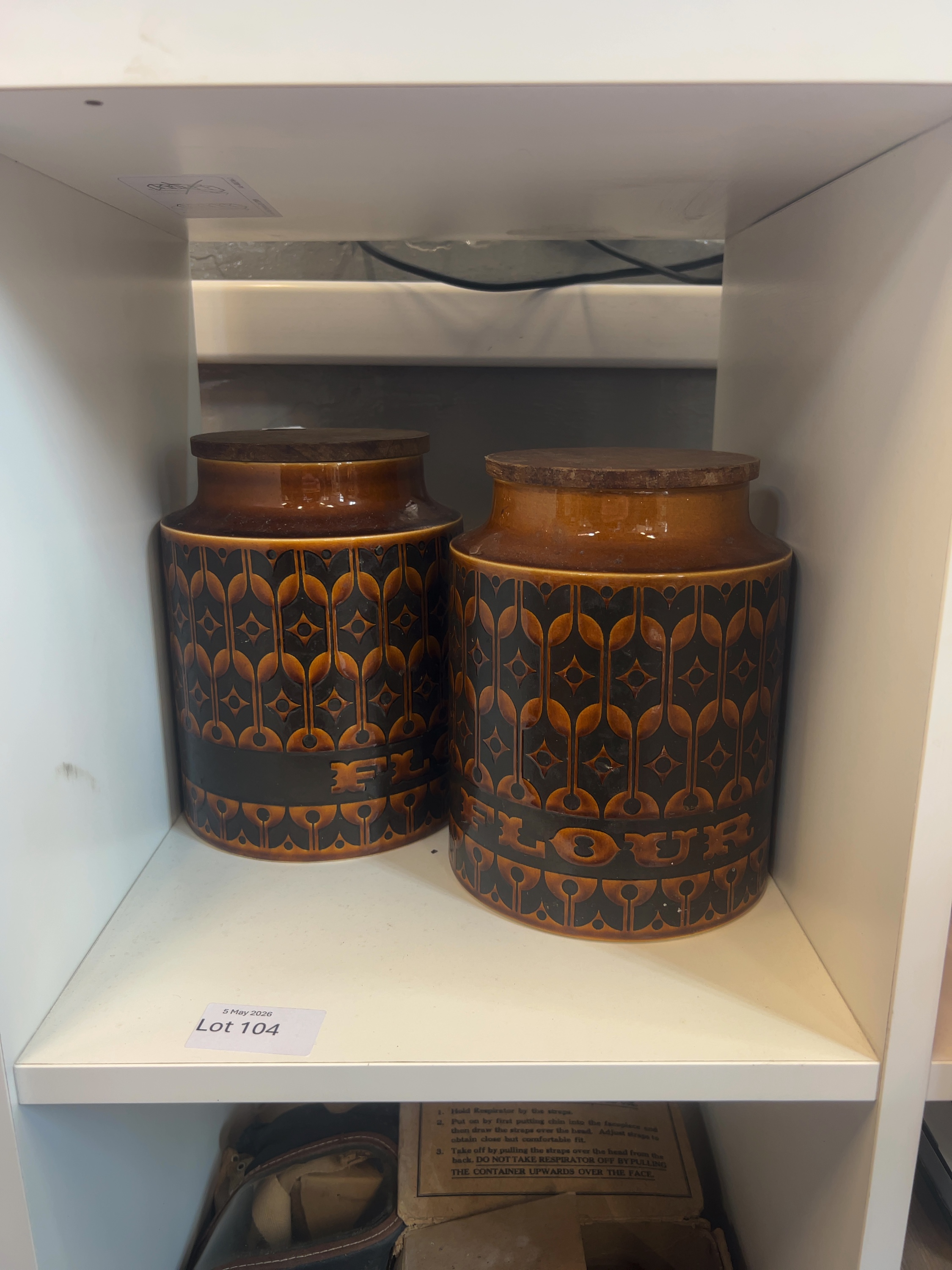 A pair of large earthenware storage jars in the Heirloom pattern, designed by John Clappison for Hornsea Pottery. Each jar is of cylindrical form, featuring a relief-moulded repeating geometric pattern in autumnal shades of brown and black. HORNSEA, ENGLAND 1975, and HEIRLOOM.