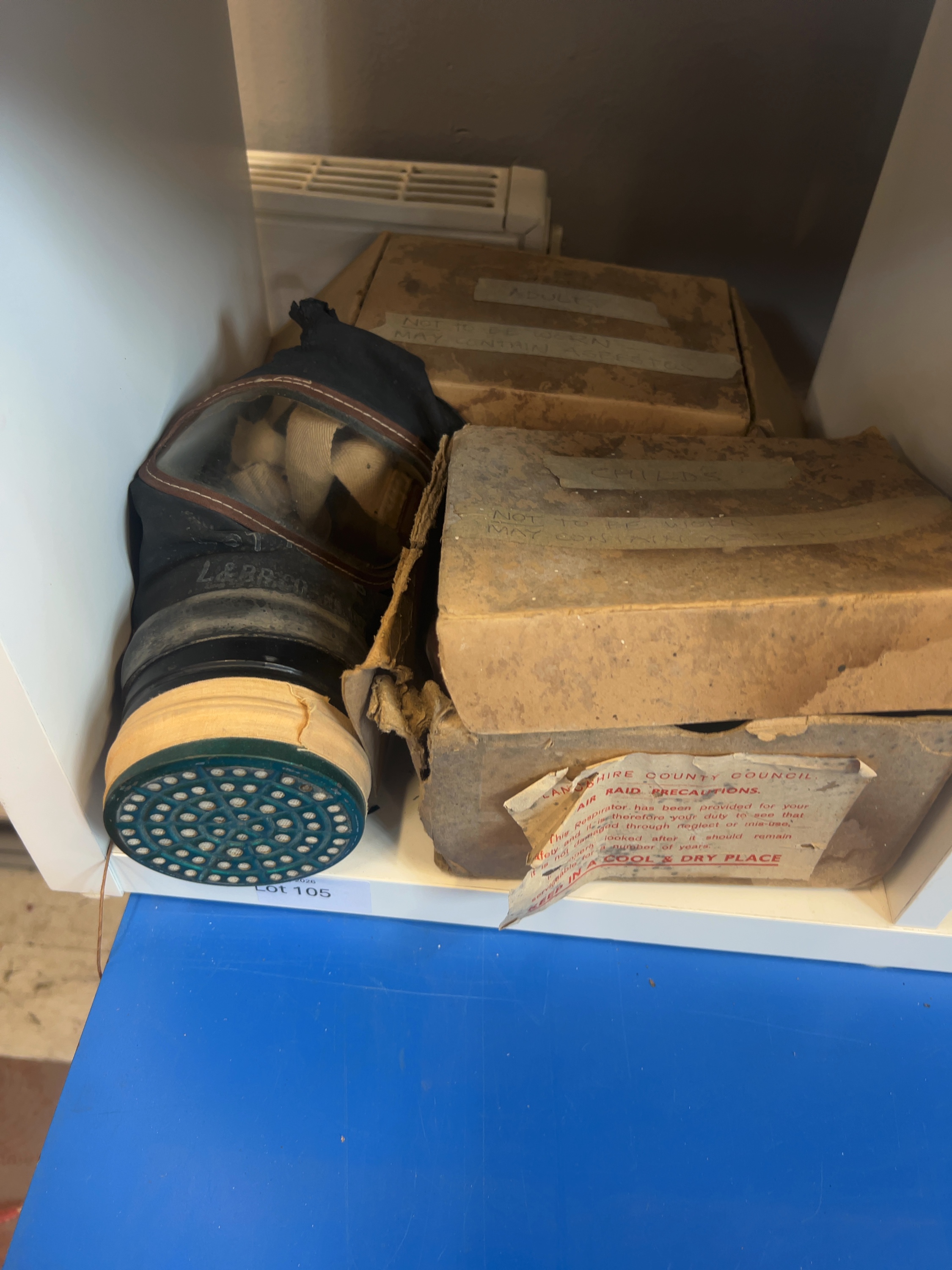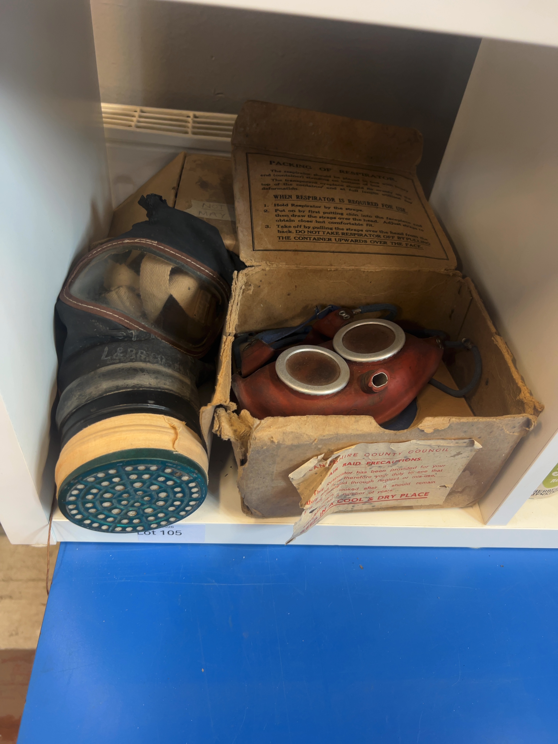 TTwo British Second World War-era civilian respirators issued under the Air Raid Precautions scheme. The first is an Adult Civilian Duty respirator.The facepiece is stamped with the manufacturer mark L & B R CO for the Leyland & Birmingham Rubber Company. It is housed in its original cardboard transit box. The second item is a child’s respirator, often referred to as the Mickey Mouse mask,and retains its original cardboard transit box. Both items are historical collectables and contain original filters which may contain crocidolite (blue asbestos). They are sold for display purposes only and are not suitable for wear.