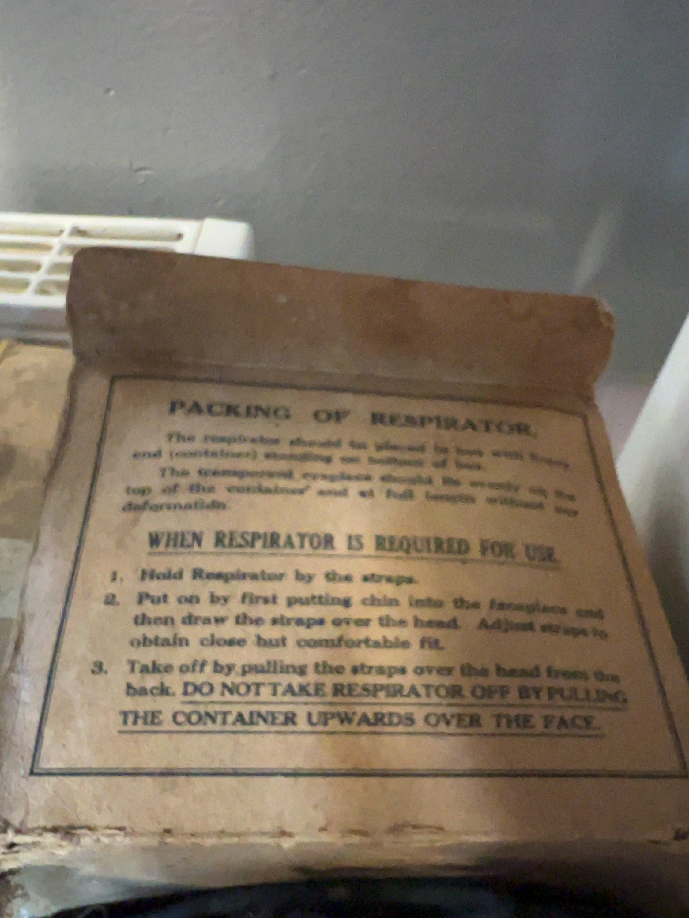 The respirators show age-related wear including stiffness to the rubber and tarnishing to the metal components. The cardboard boxes are in poor to fair condition with visible tearing, staining, and structural weaknesses consistent with age. One box has a partially damaged paper label and significant surface wear.