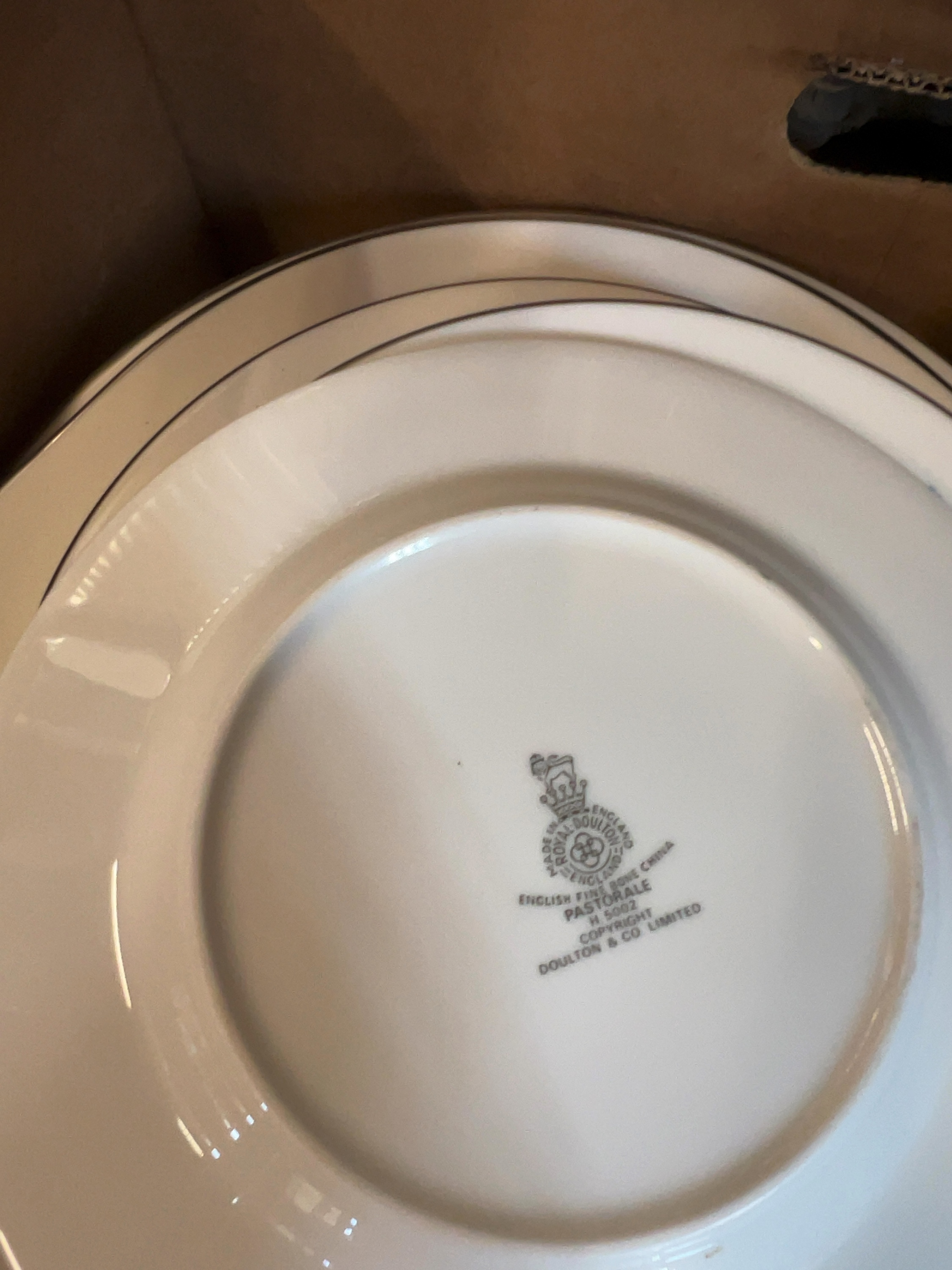 A collection of Royal Doulton fine bone china items in the Pastorale pattern (H 5002) and includes a covered oval vegetable tureen, a gravy boat, dinner plates, side plates, teacups, saucers, and an open sugar bowl. Each piece features the Royal Doulton backstamp on the base, which includes a crown over a circular logo reading MADE IN ENGLAND / ROYAL DOULTON / ENGLAND, above the text ENGLISH FINE BONE CHINA / PASTORALE / H 5002 / © COPYRIGHT / DOULTON & CO. LIMITED.