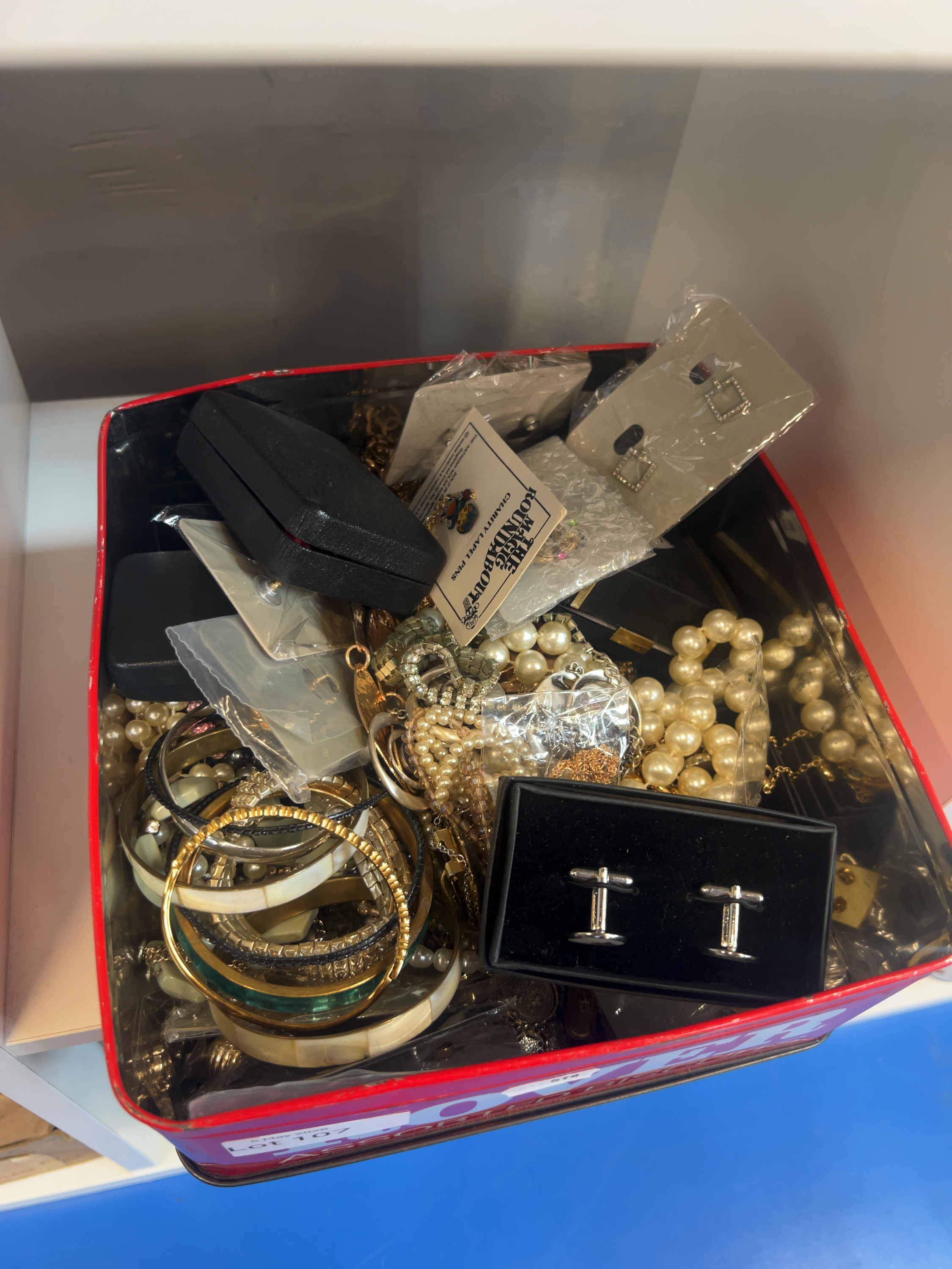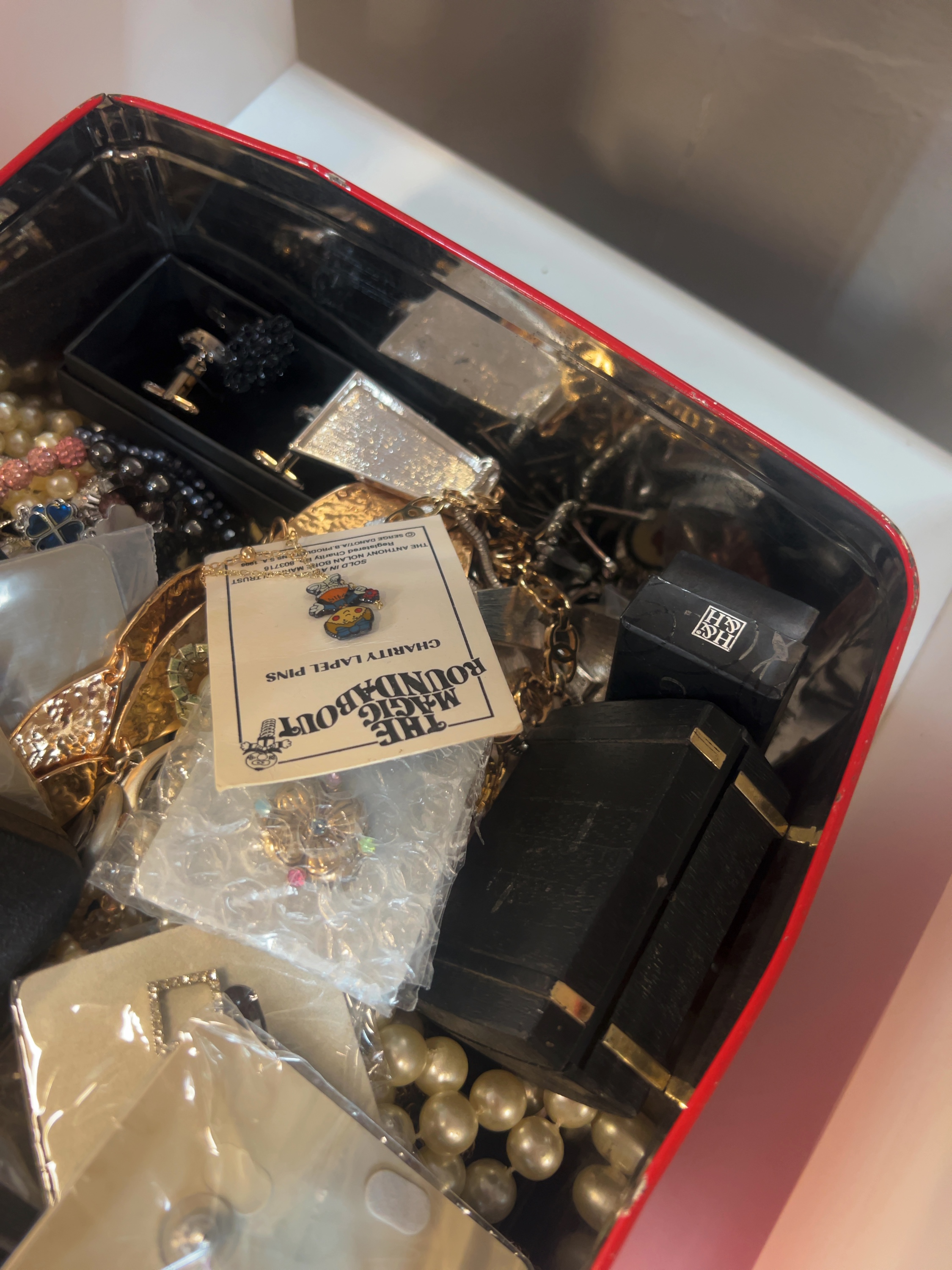 This lot comprises an assortment of mid-to-late 20th-century costume jewellery and personal accessories and includes multiple strands of simulated pearl necklaces; bracelets and bangles. A notable item is a charity lapel pin for The Anthony Nolan Trust, featuring characters from The Magic Roundabout, preserved on its original backing card. Also included is a small floral-motif brooch set, earrings, cufflinks and several small black jewellery boxes, The items are constructed from base metals with gold and silver-toned finishes, enamel, plastic, and paste or rhinestone settings.
