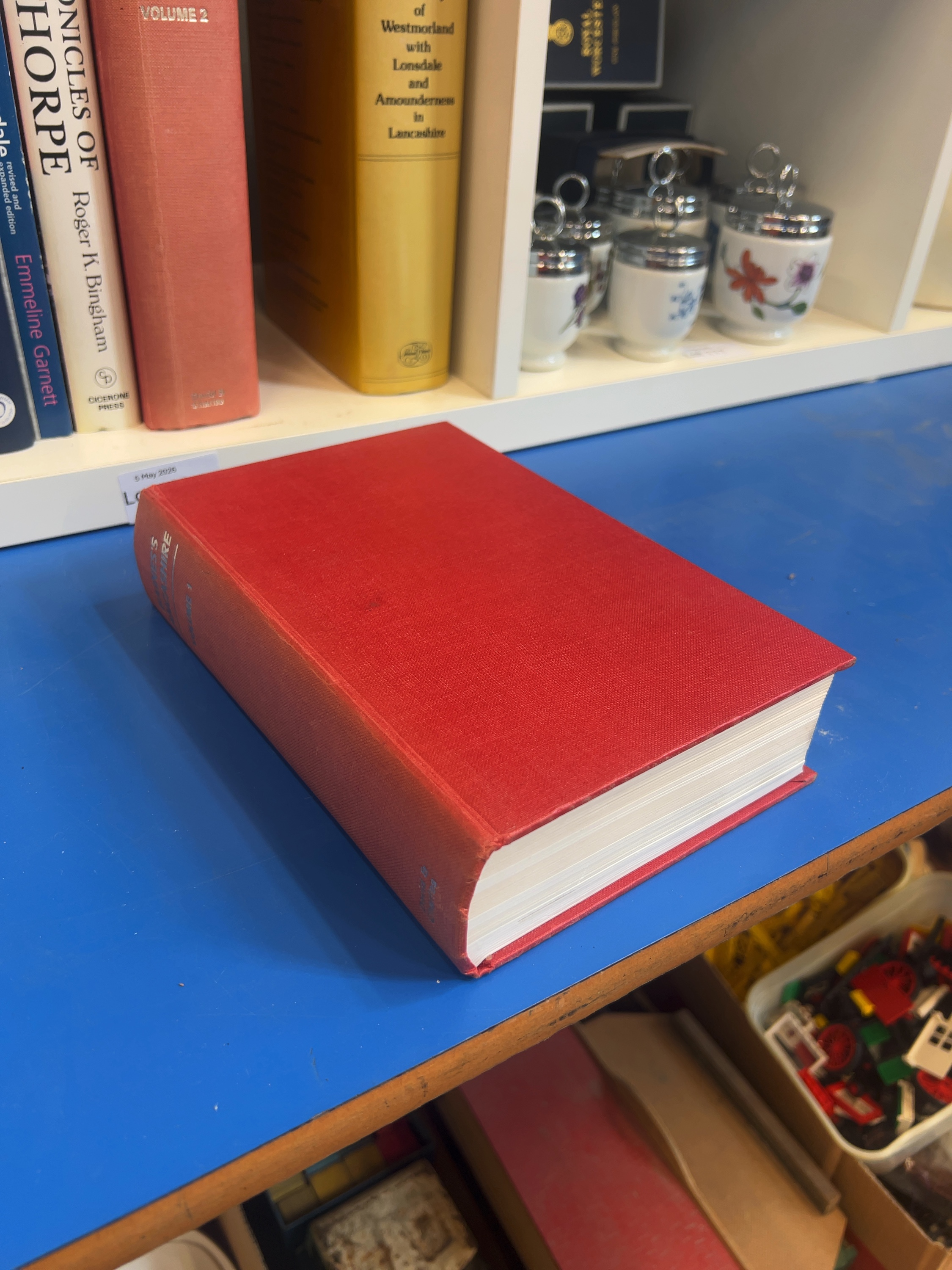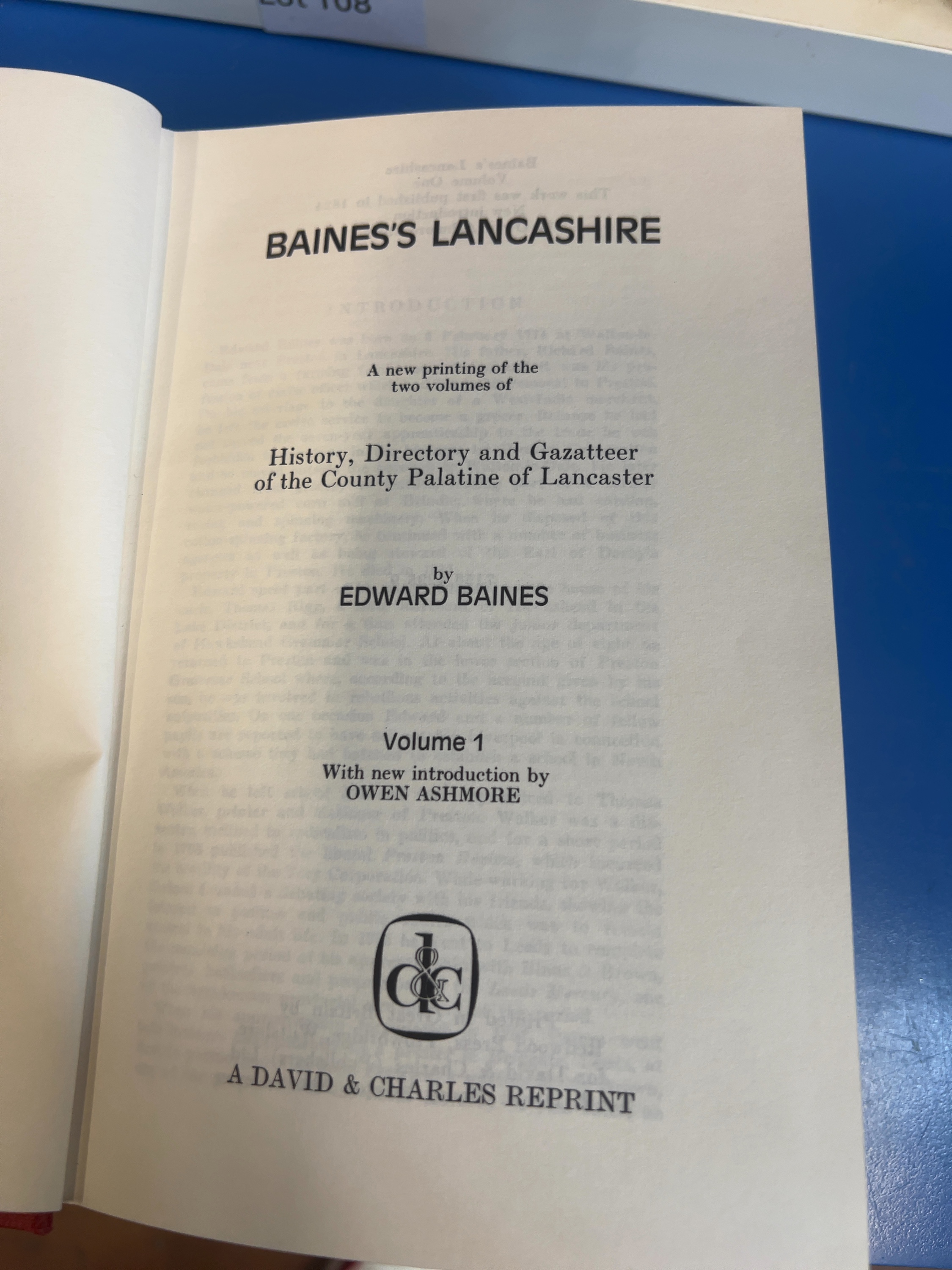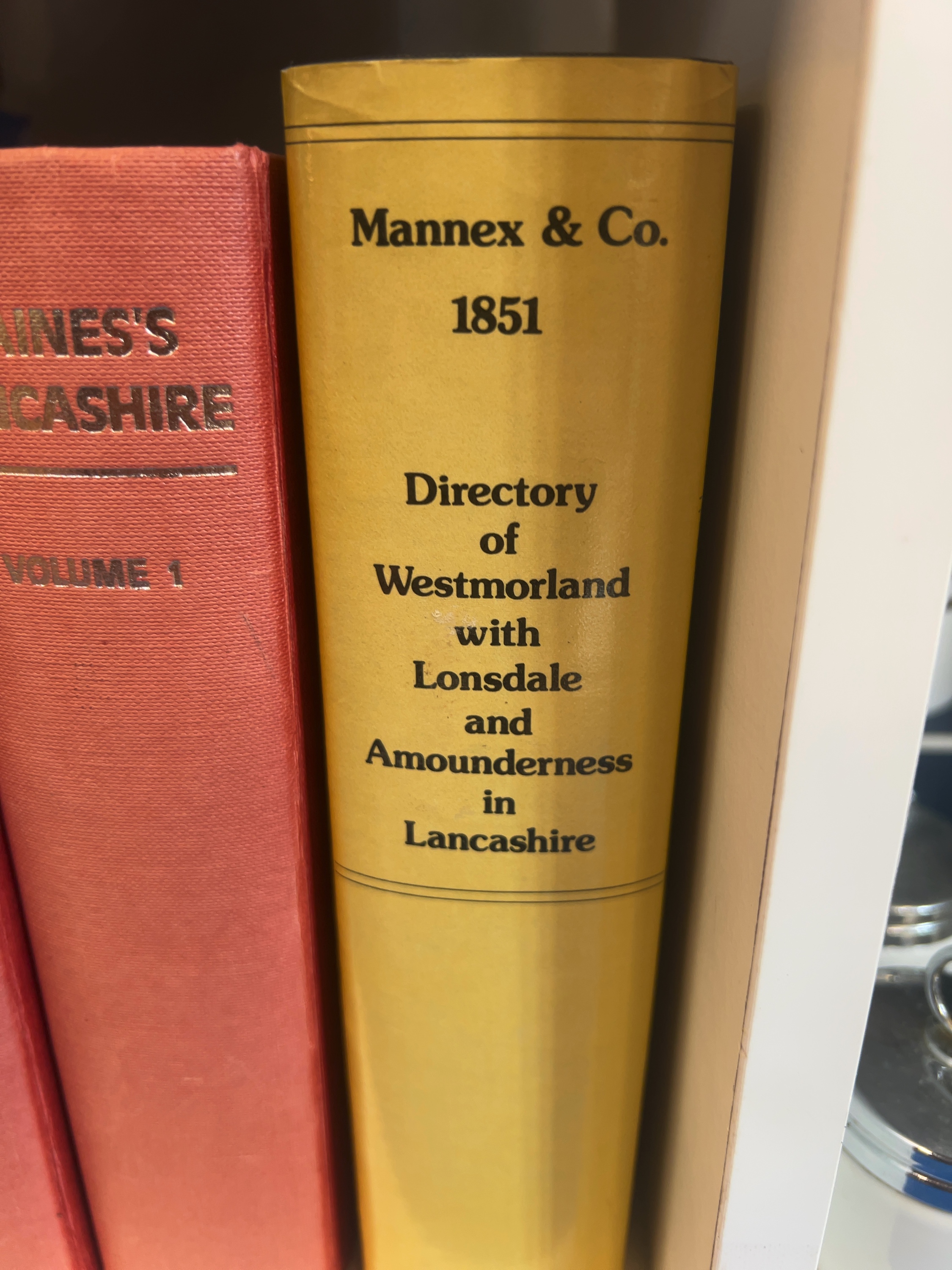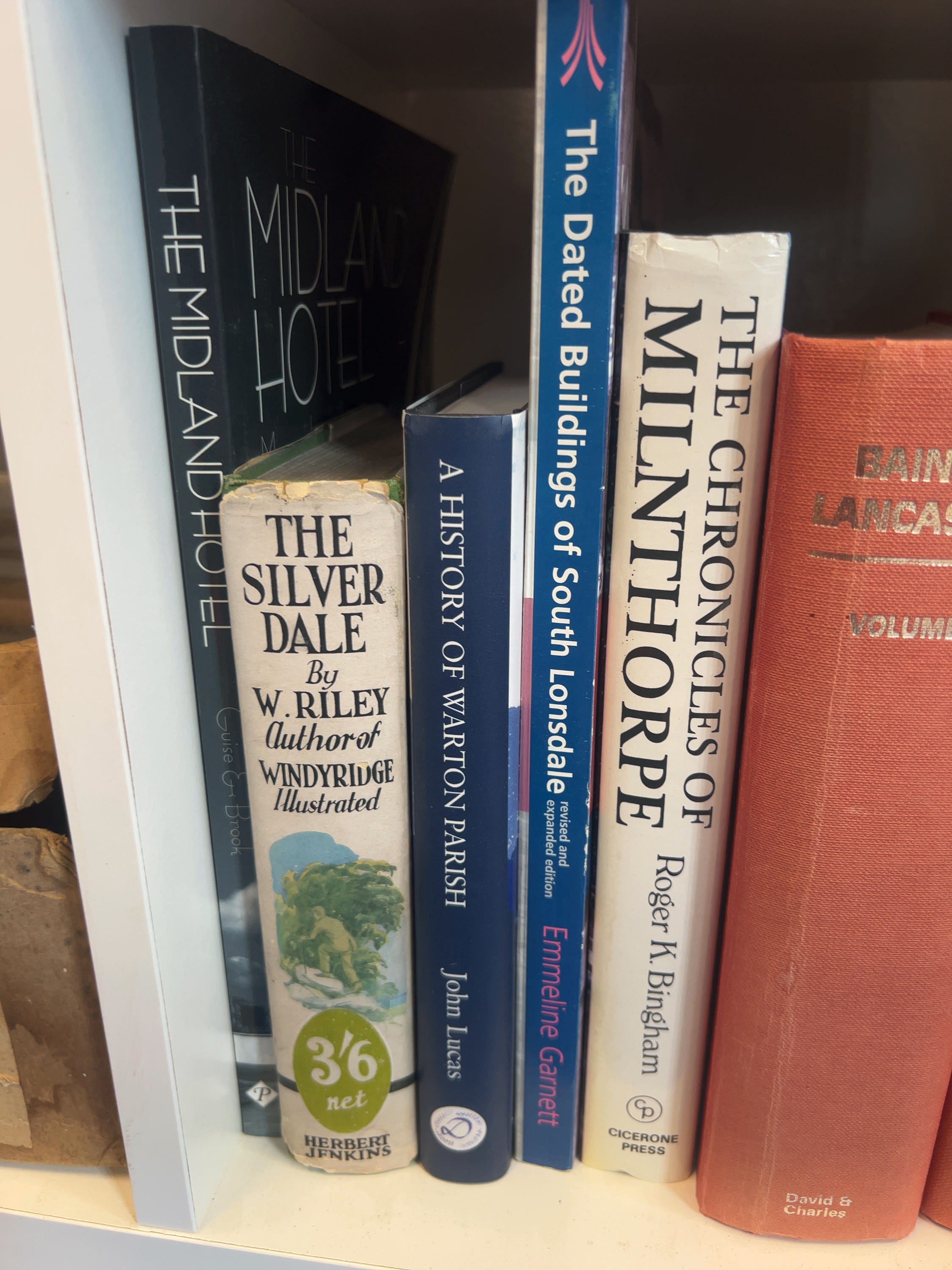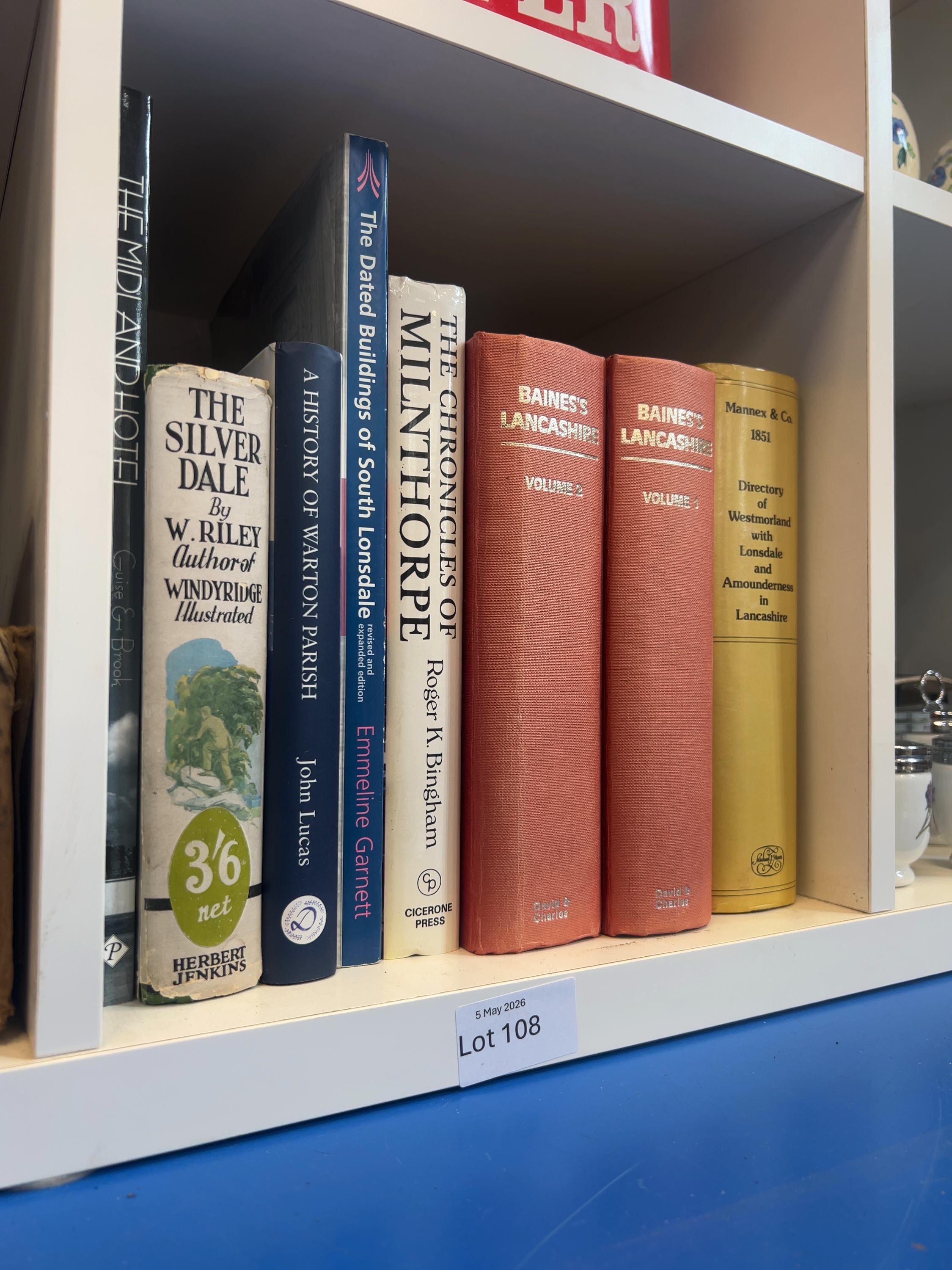 A collection of topographical and local history volumes – Lancashire and Westmorland. A two-volume David & Charles reprint set of Baines’s Lancashire, titled History, Directory and Gazetteer of the County Palatine of Lancaster, by Edward Baines (1968), featuring a new introduction by Owen Ashmore. Also included is the Mannex & Co. 1851 Directory of Westmorland with Lonsdale and Amounderness in Lancashire; The Silver Dale by W. Riley, published by Herbert Jenkins, complete with its original pictorial dust jacket., and A History of Warton Parish by John Lucas, The Dated Buildings of South Lonsdale (revised and expanded edition) by Emmeline Garnett, The Chronicles of Milnthorpe by Roger K. Bingham (Cicerone Press), and The Midland Hotel by Guise & Brook. The volumes are primarily octavo in size.