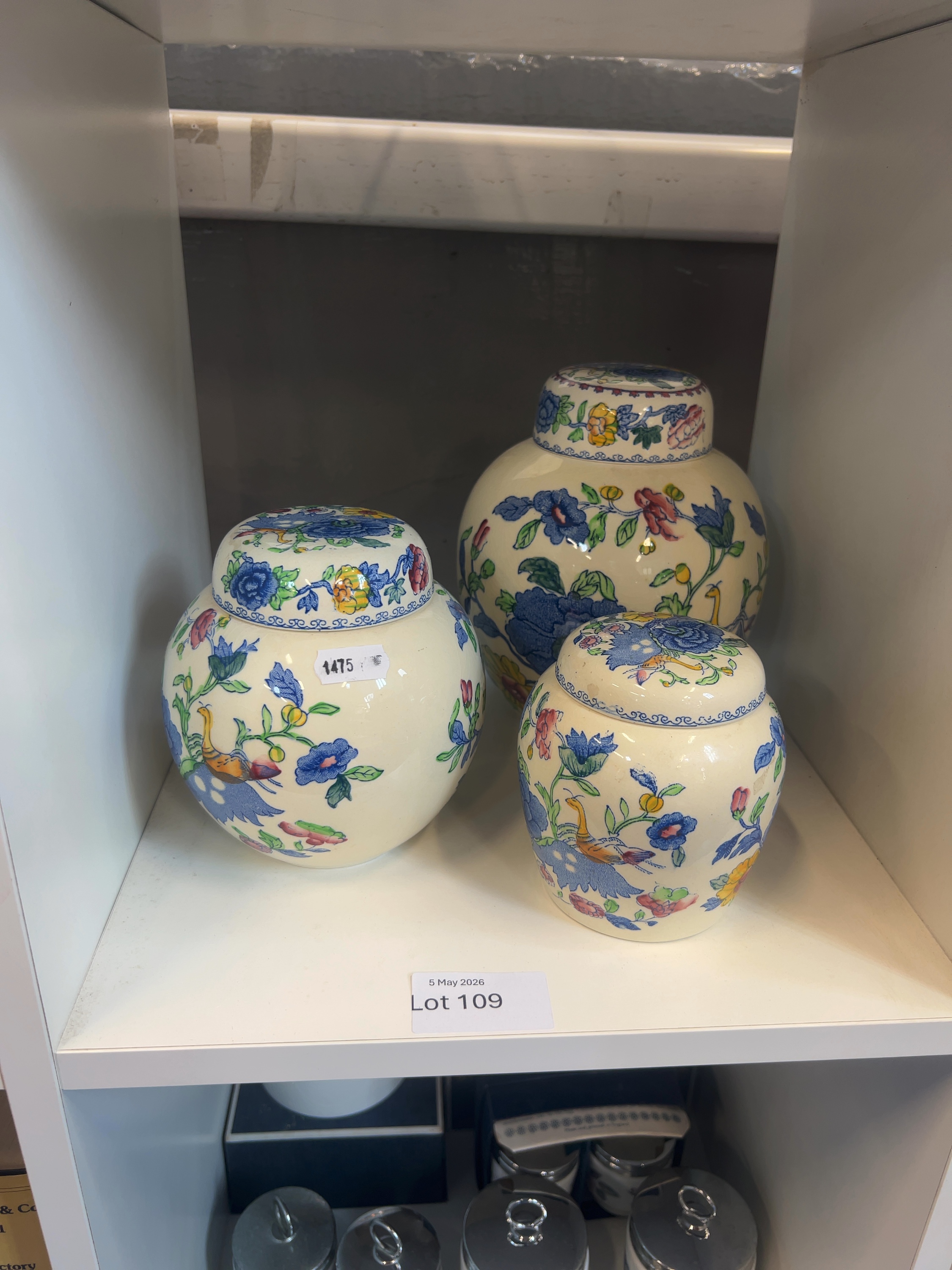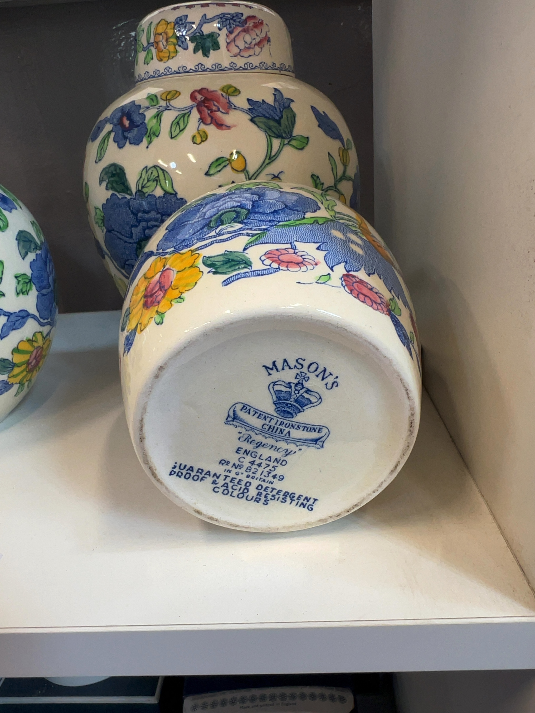 A trio of graduated lidded ginger jars produced by Mason’s in the Regency pattern, registered design number Rd No 821349. The mark also includes the text GUARANTEED DETERGENT PROOF & ACID RESISTING COLOURS.