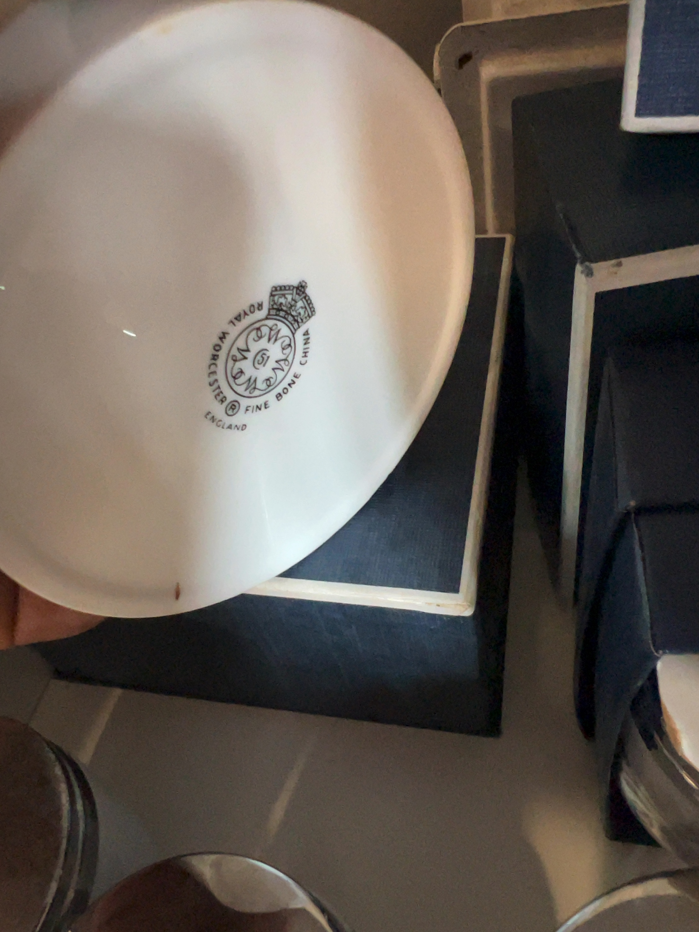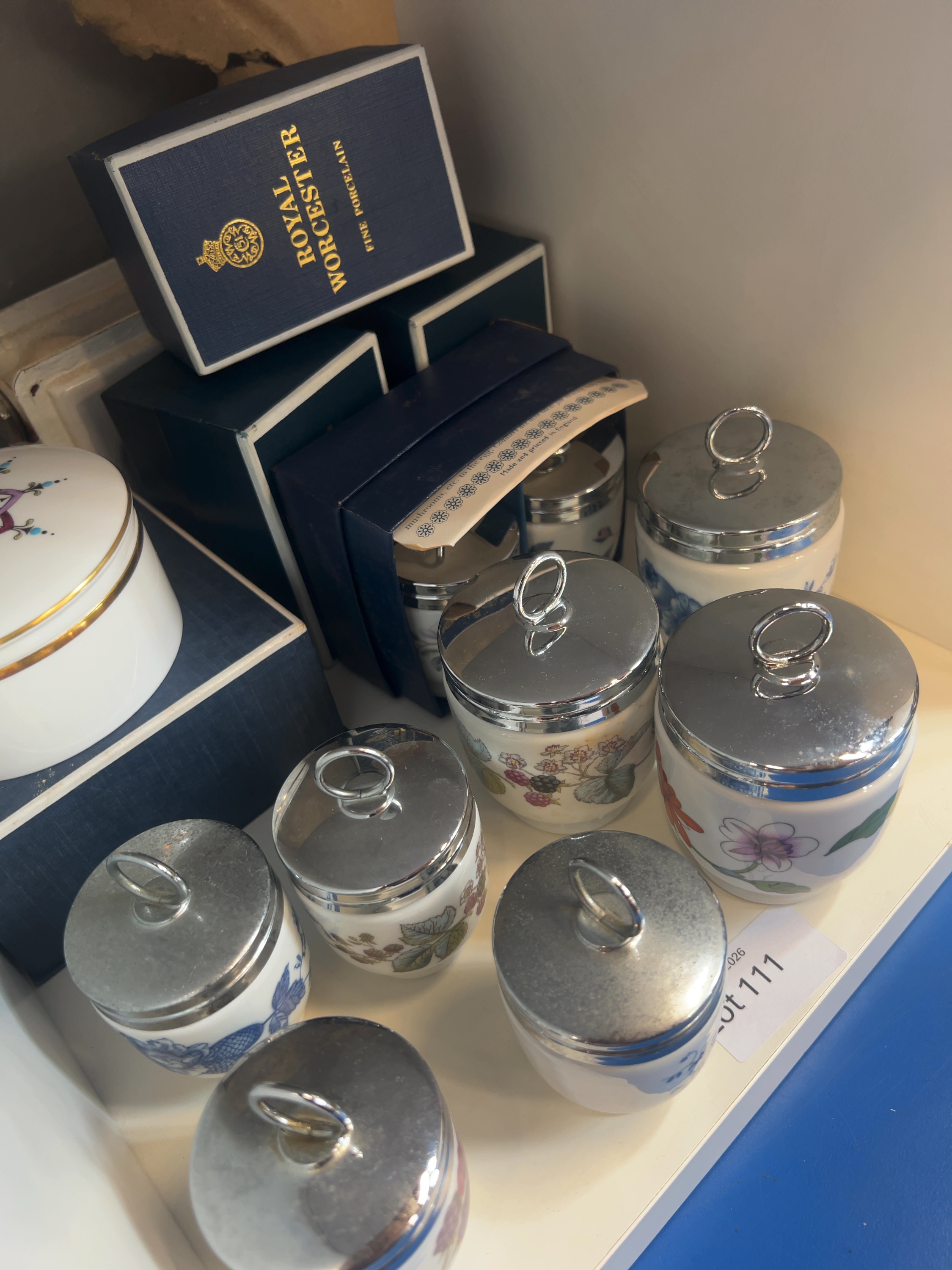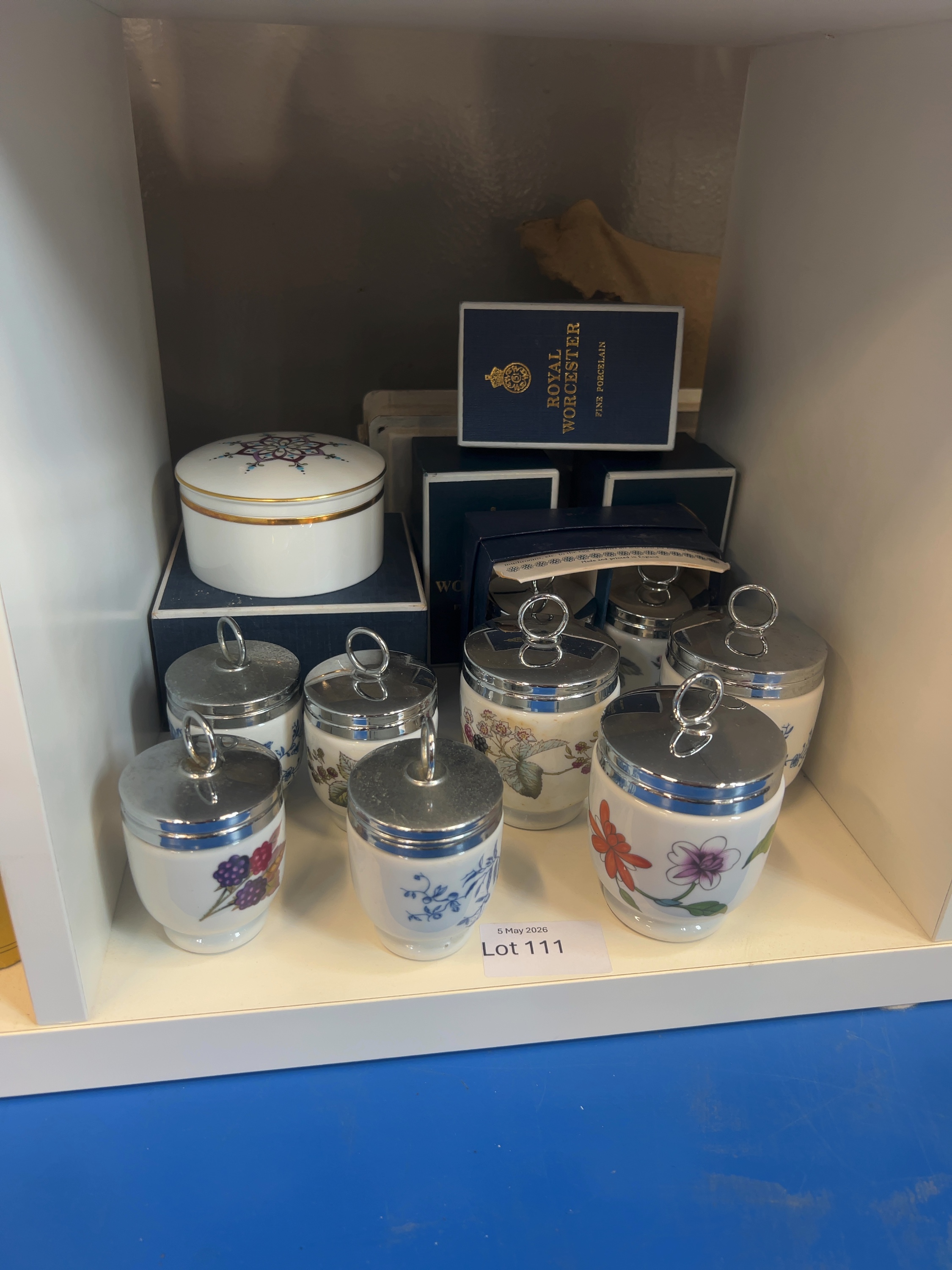 Ten Royal Worcester fine bone china items, egg coddlers in various sizes alongside a small lidded trinket box. Several original blue cardboard presentation boxes are included. The items bear a black circular backstamp to the base featuring a crowned W above the number 51, encircled by the text Royal Worcester Fine Bone China England. The presentation boxes are printed in gold with the manufacturer name and fine porcelain.
