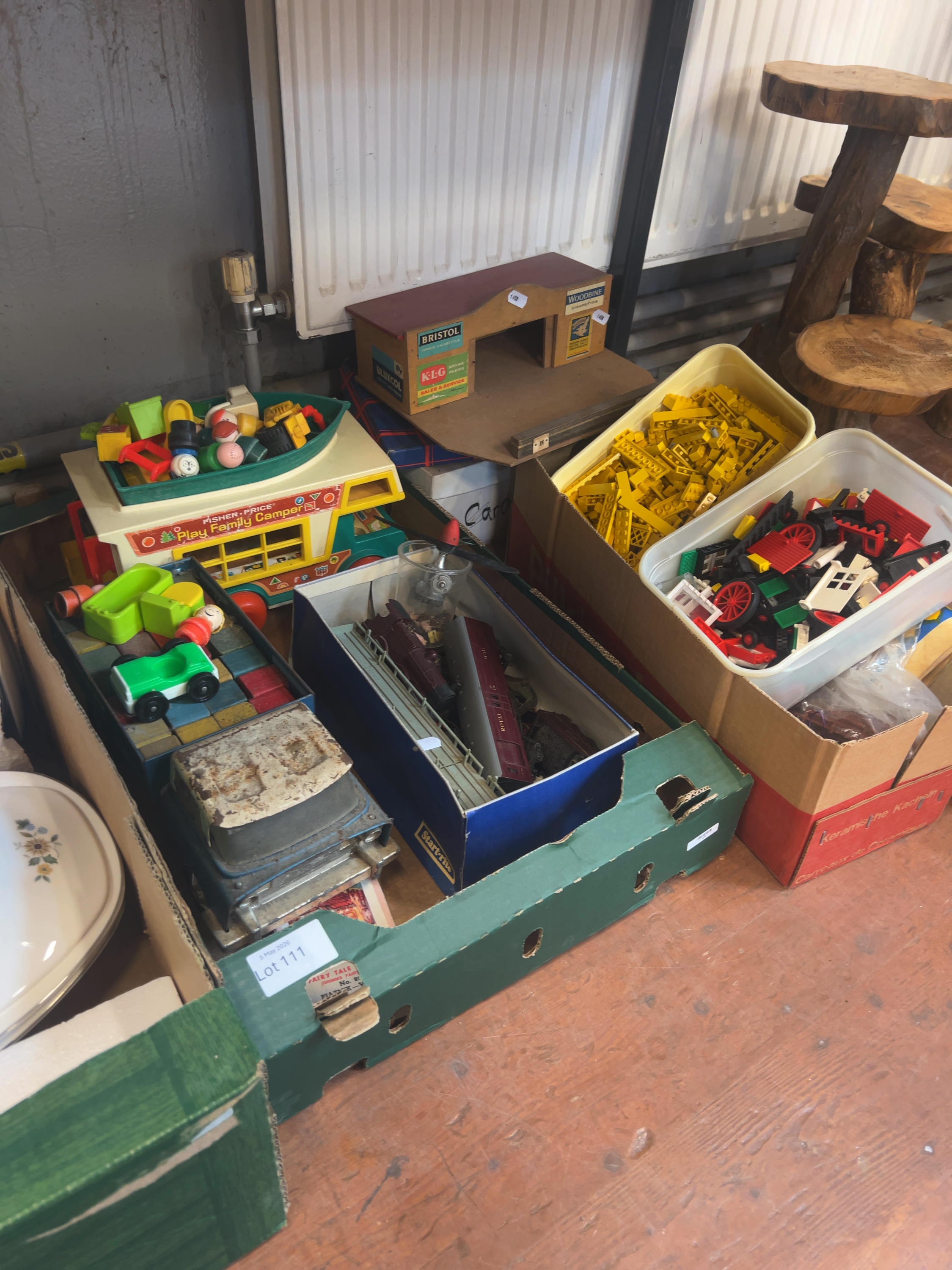 The items are in various states of play-worn condition. The Fisher-Price set and Lego show signs of previous use but are generally intact. The wooden garage exhibits age-related wear to the surfaces and edges. The blue die-cast truck cab is heavily weathered with visible surface oxidation and rust. Model railway items are unboxed and may have missing or damaged small parts. The card game box and wooden blocks show wear consistent with age and play.