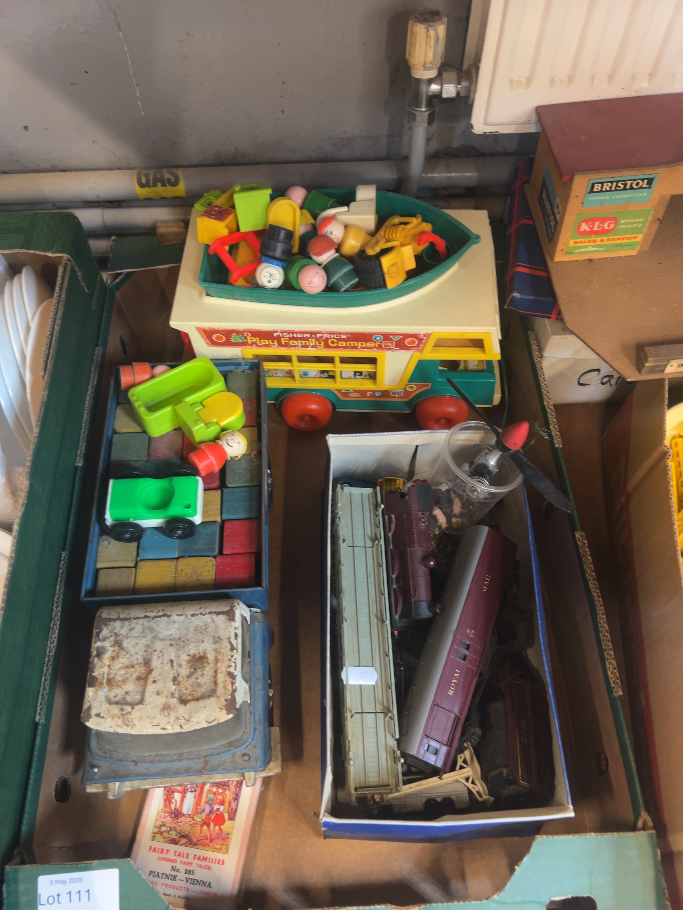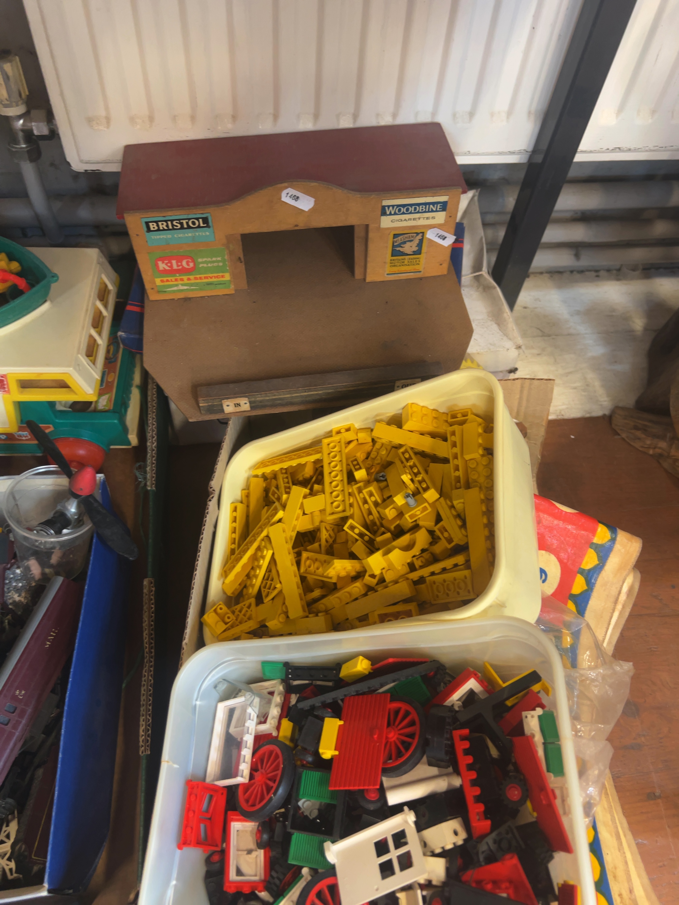 Also two plastic containers of loose vintage Lego bricks; one is predominantly comprised of yellow bricks, while the second contains mixed colours and specialised components such as wheels and window frames. A blue cardboard box houses unboxed model railway rolling stock, primarily in maroon livery, with one coach clearly marked Royal Mail.