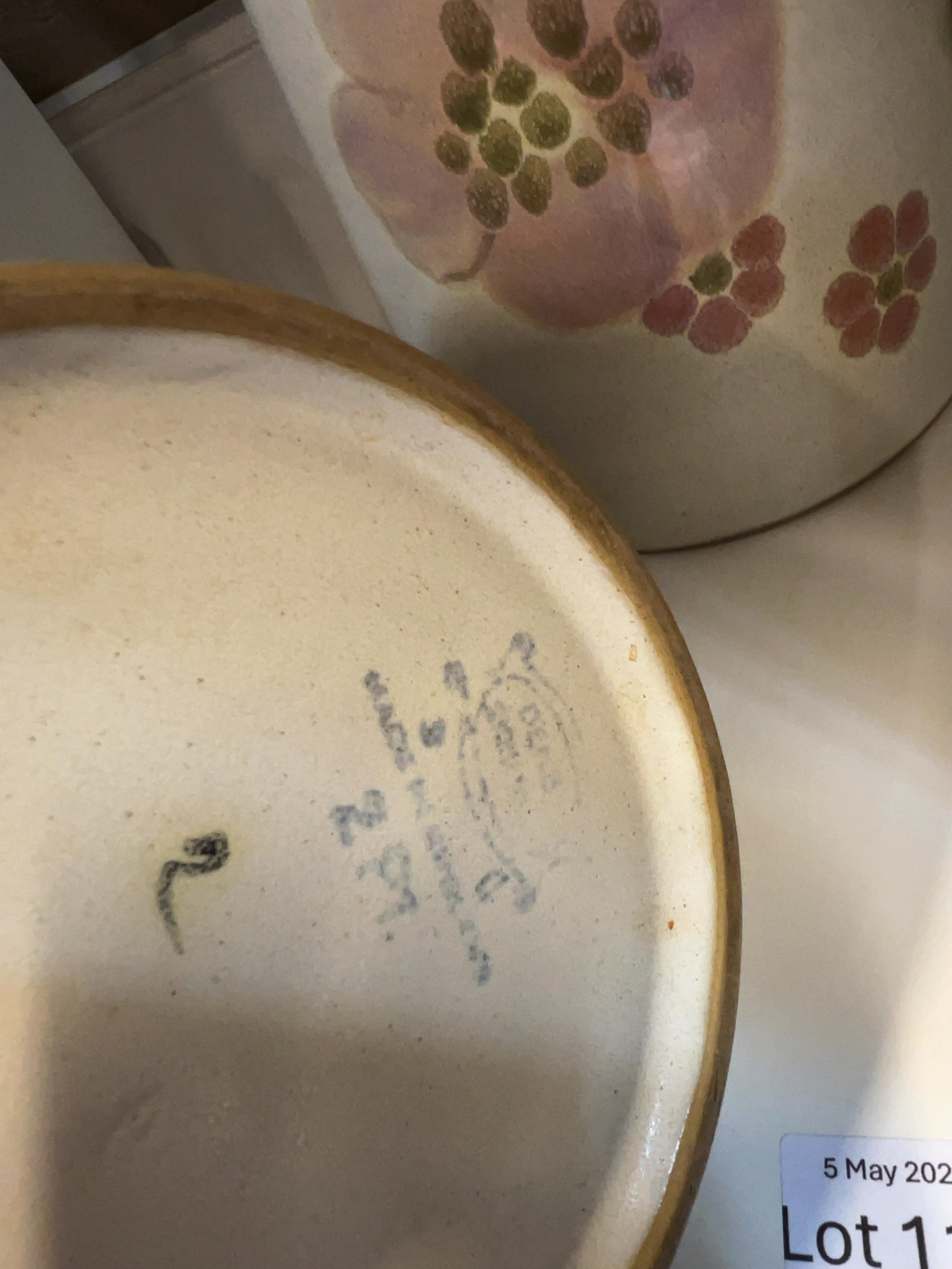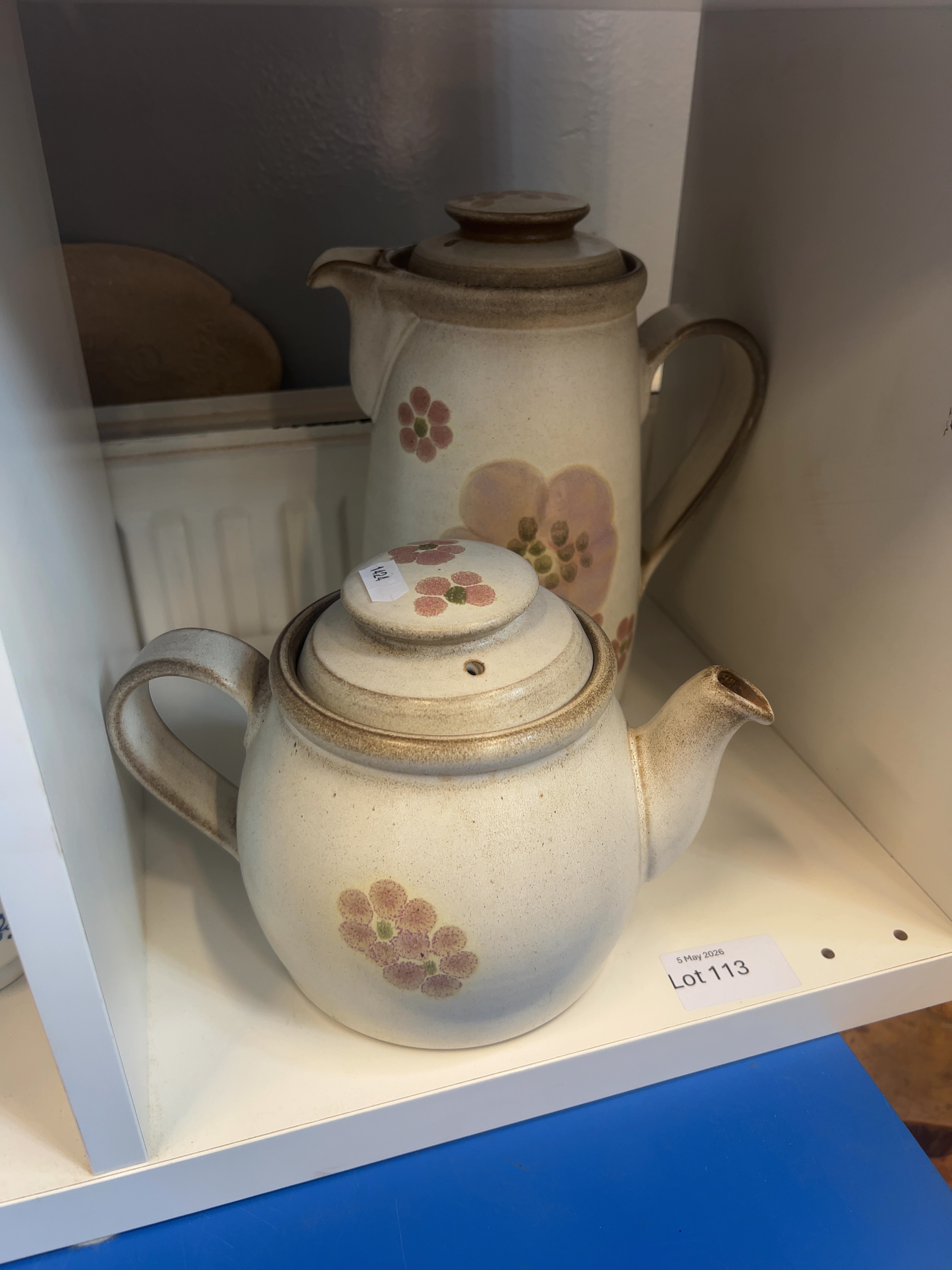 Both pieces appear to be in good condition with no visible chips, cracks, or restorations. There are minor surface variations characteristic of hand-finished stoneware. An auction lot sticker is present on the lid of the teapot.