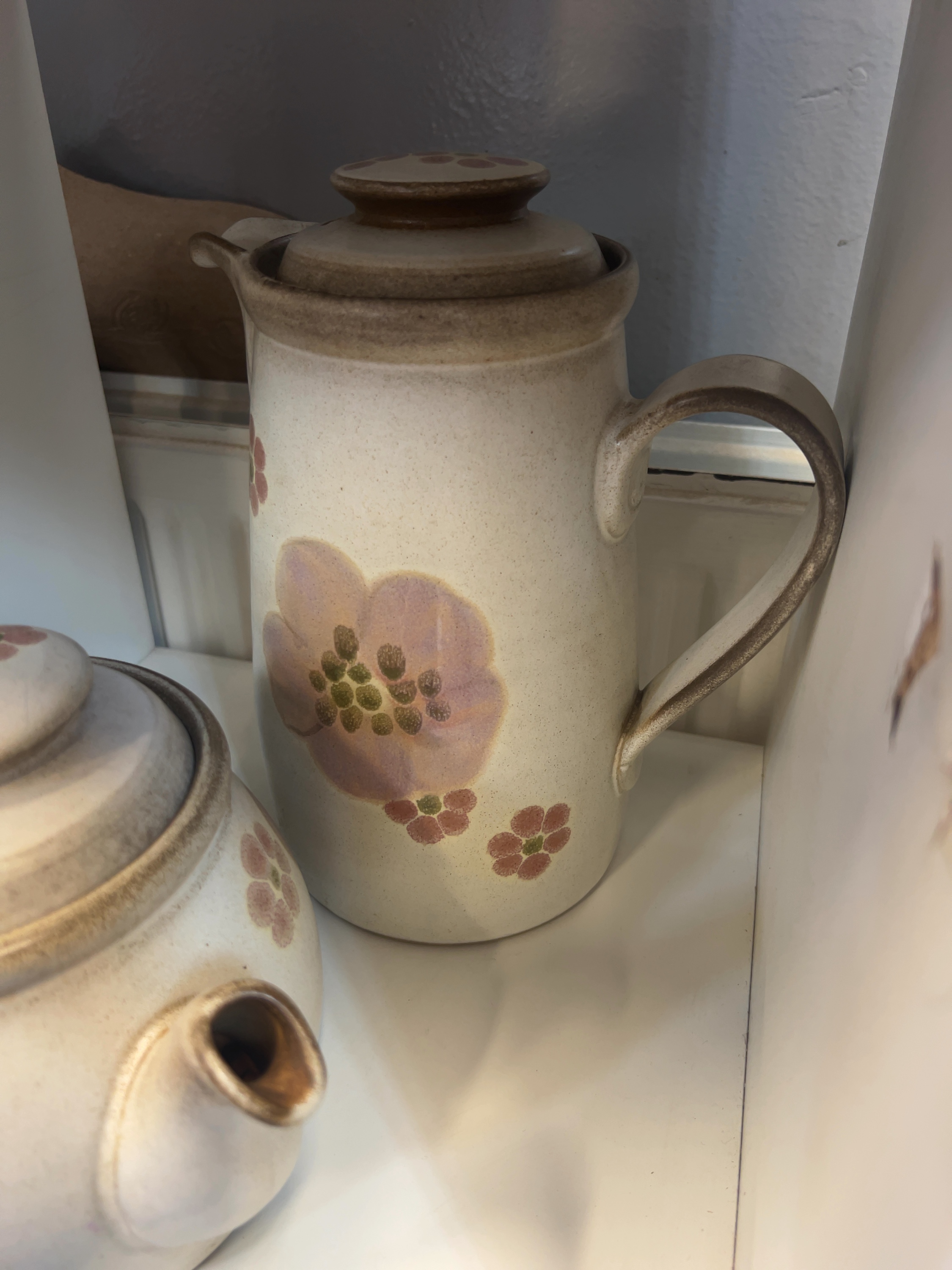 Two pieces of Denby ‘Gypsy’ stoneware ficluding a teapot and a tall, cylindrical coffee pot or hot water jug. Both items are complete with their original matching lids.
