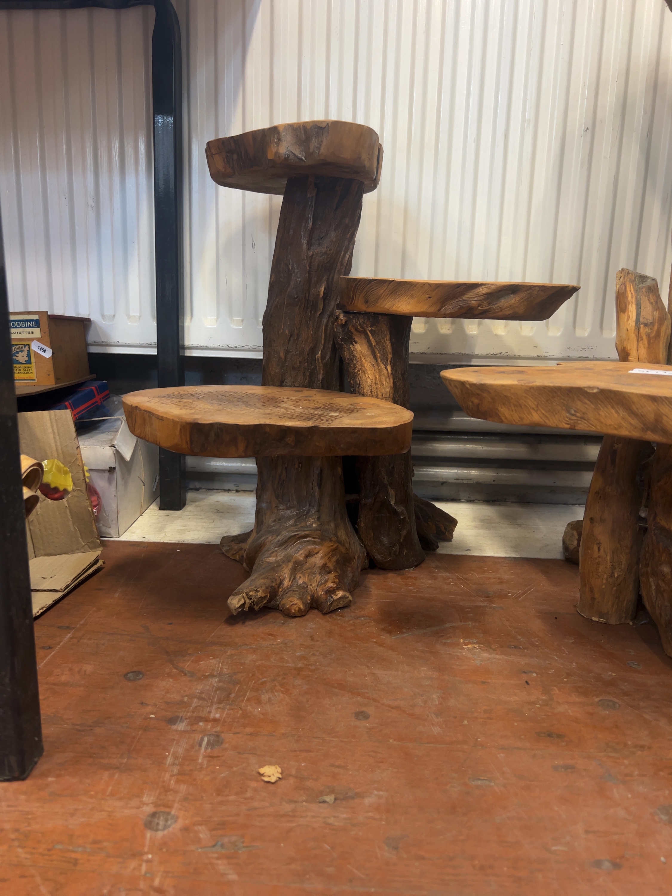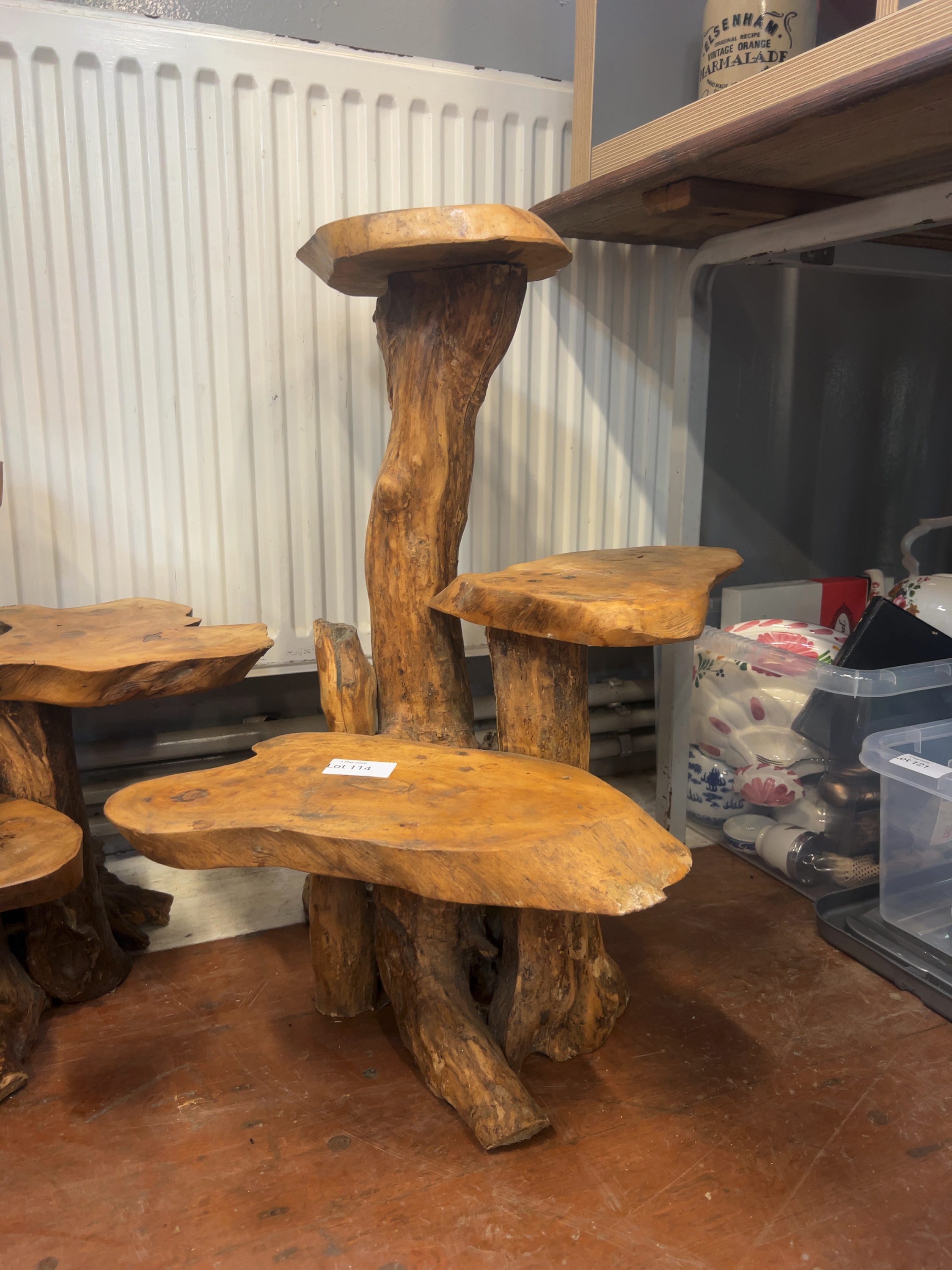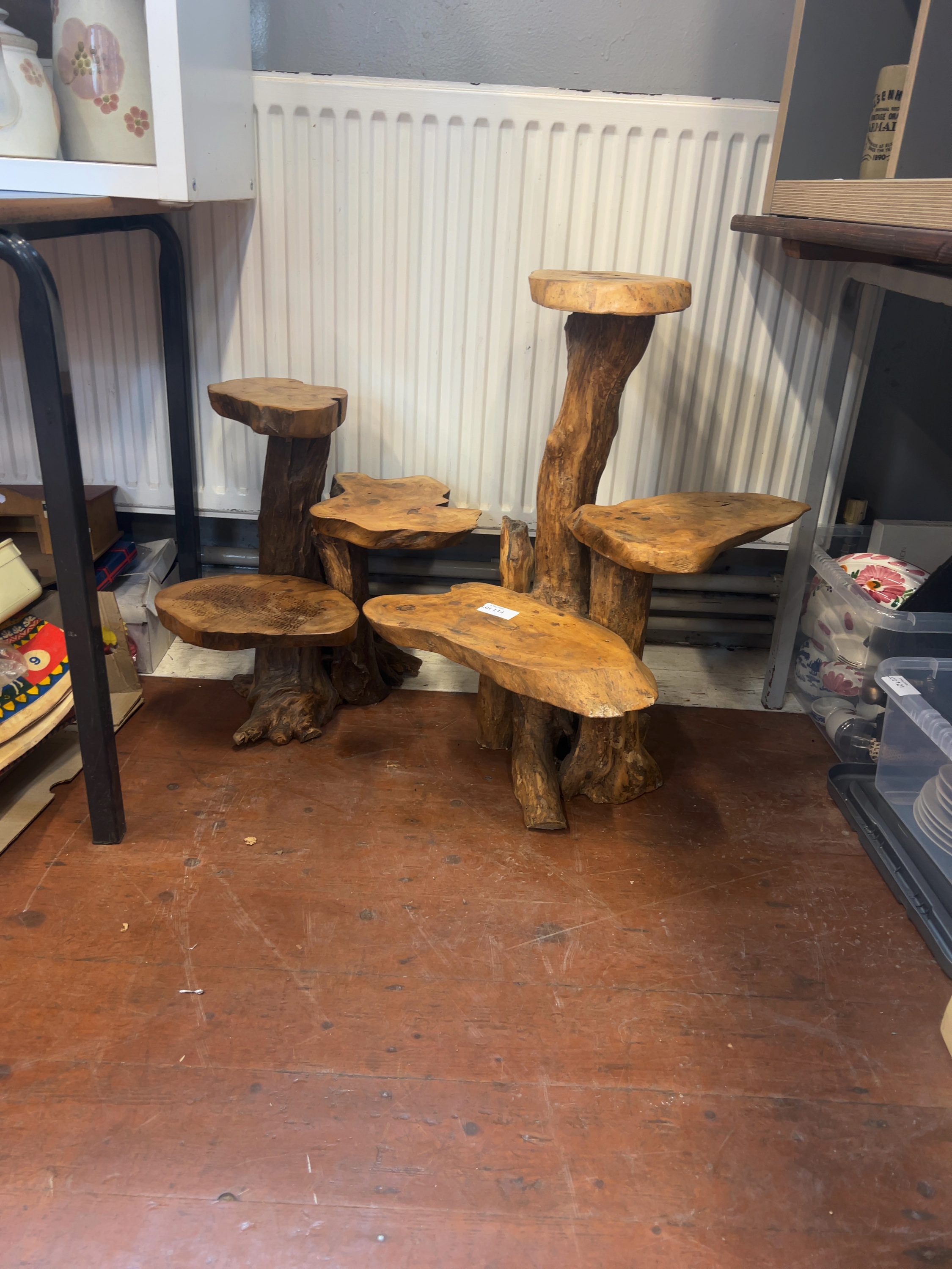 A pair of rustic multi-tiered plant stands or occasional tables, each constructed from gnarled, naturalistic wood trunks and root systems. One stand comprises three platform tiers, while the larger stand features four tiers.