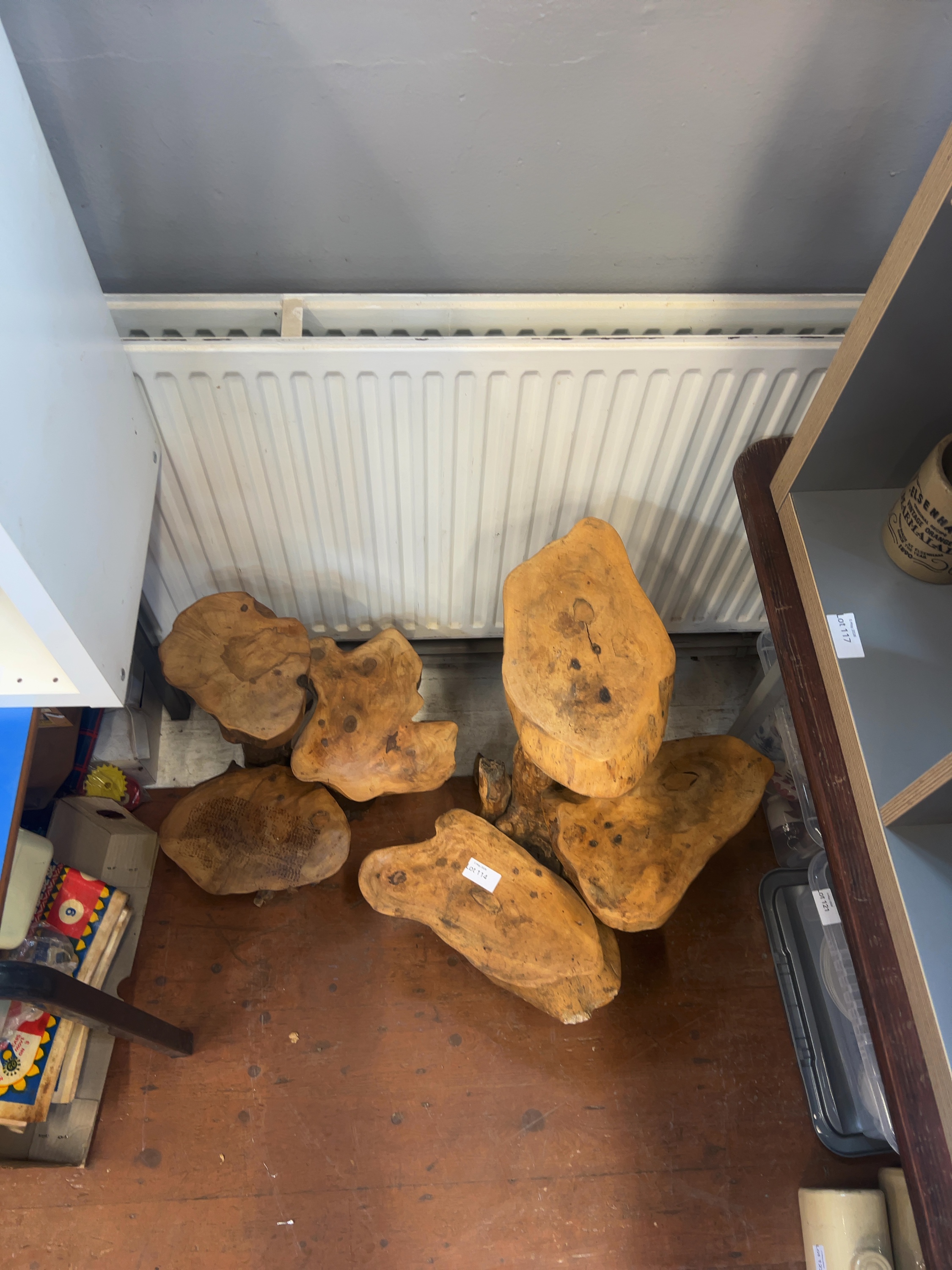 Both stands are in fair condition, exhibiting typical surface wear, light scratches, and minor scuffs consistent with age and use. Natural cracking and fissures are present throughout the timber, which are inherent to the material and construction. The finish remains largely intact with some minor areas of dulling.