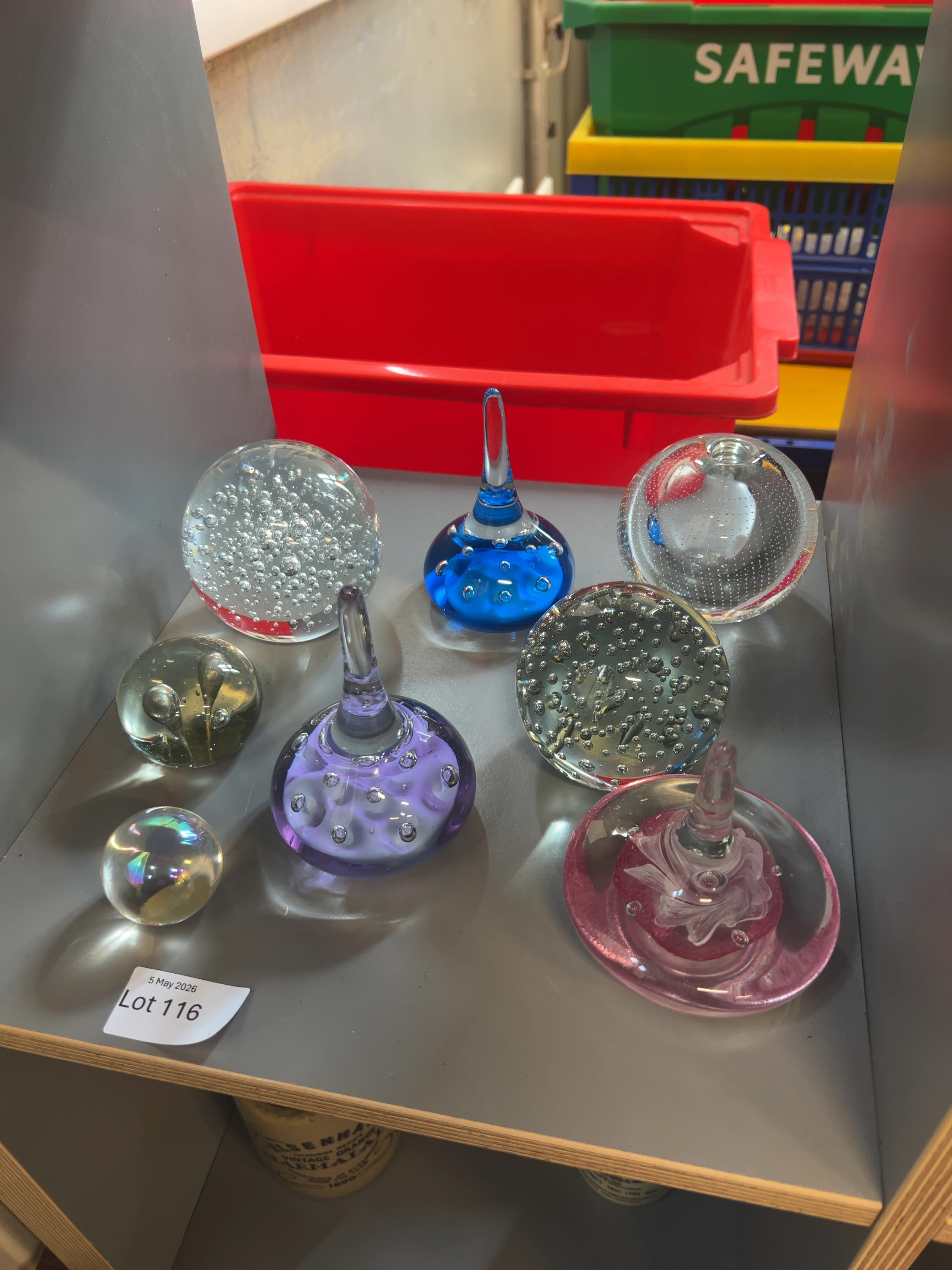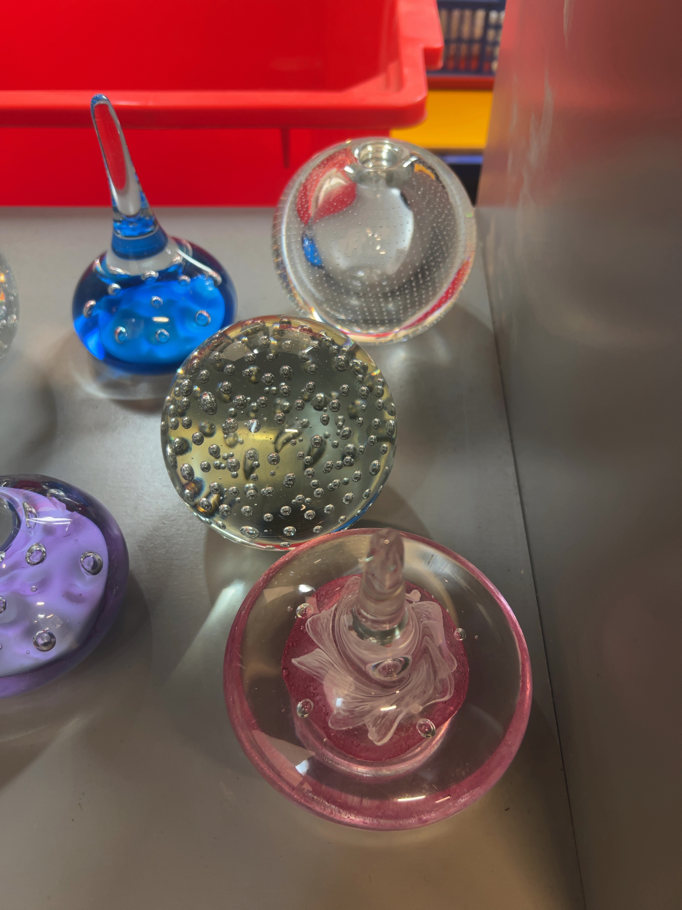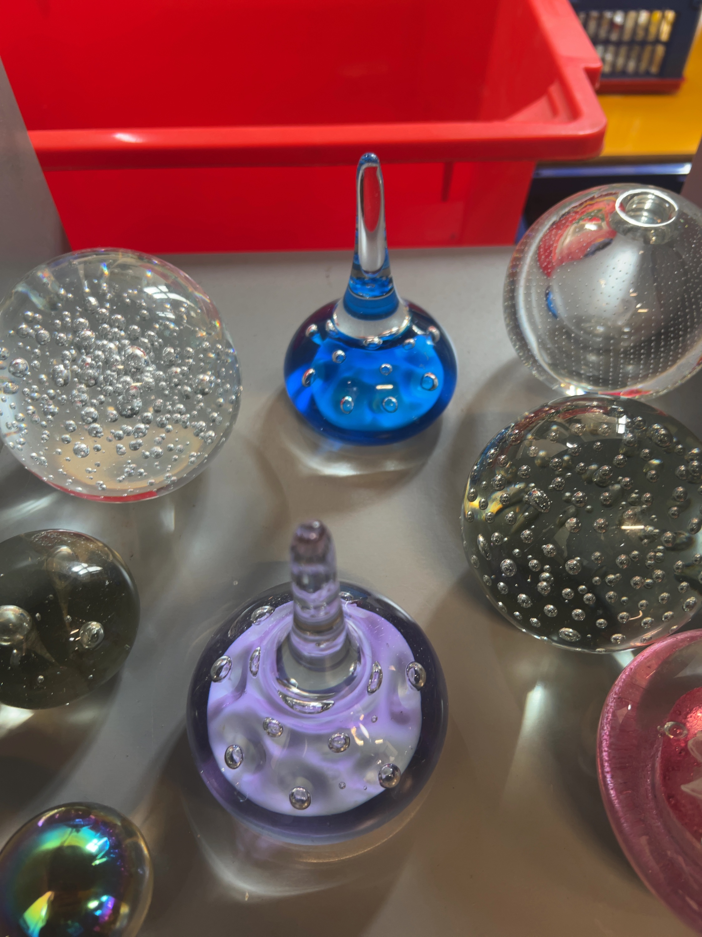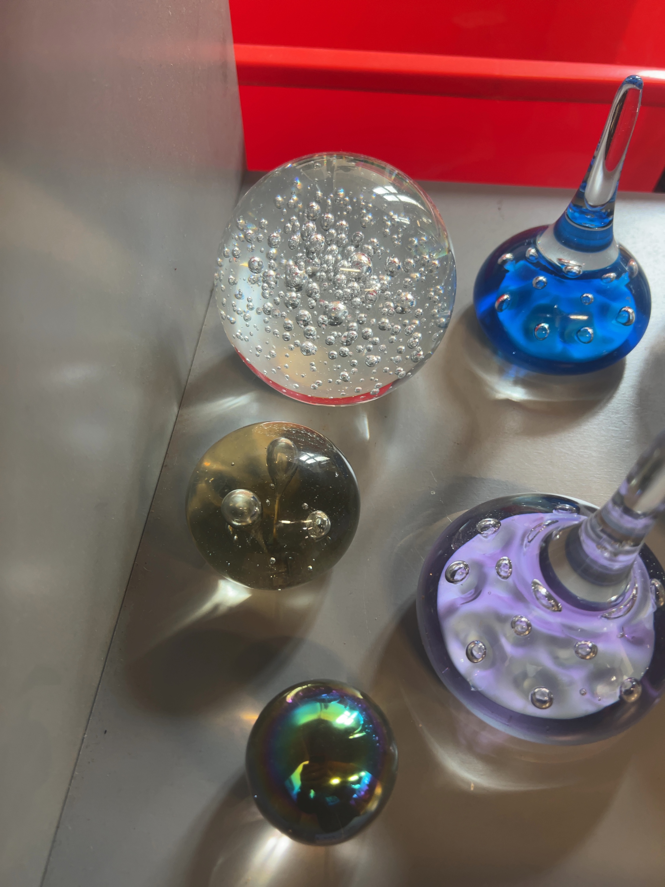 An assortment of decorative art glass items showcasing various mid-20th-century glassmaking techniques, including several spherical paperweights, three pulled glass ornaments or ring stands. These items are reminiscent of designs by makers such as Whitefriars and Mdina, although no signatures, etched marks, or labels are visible.