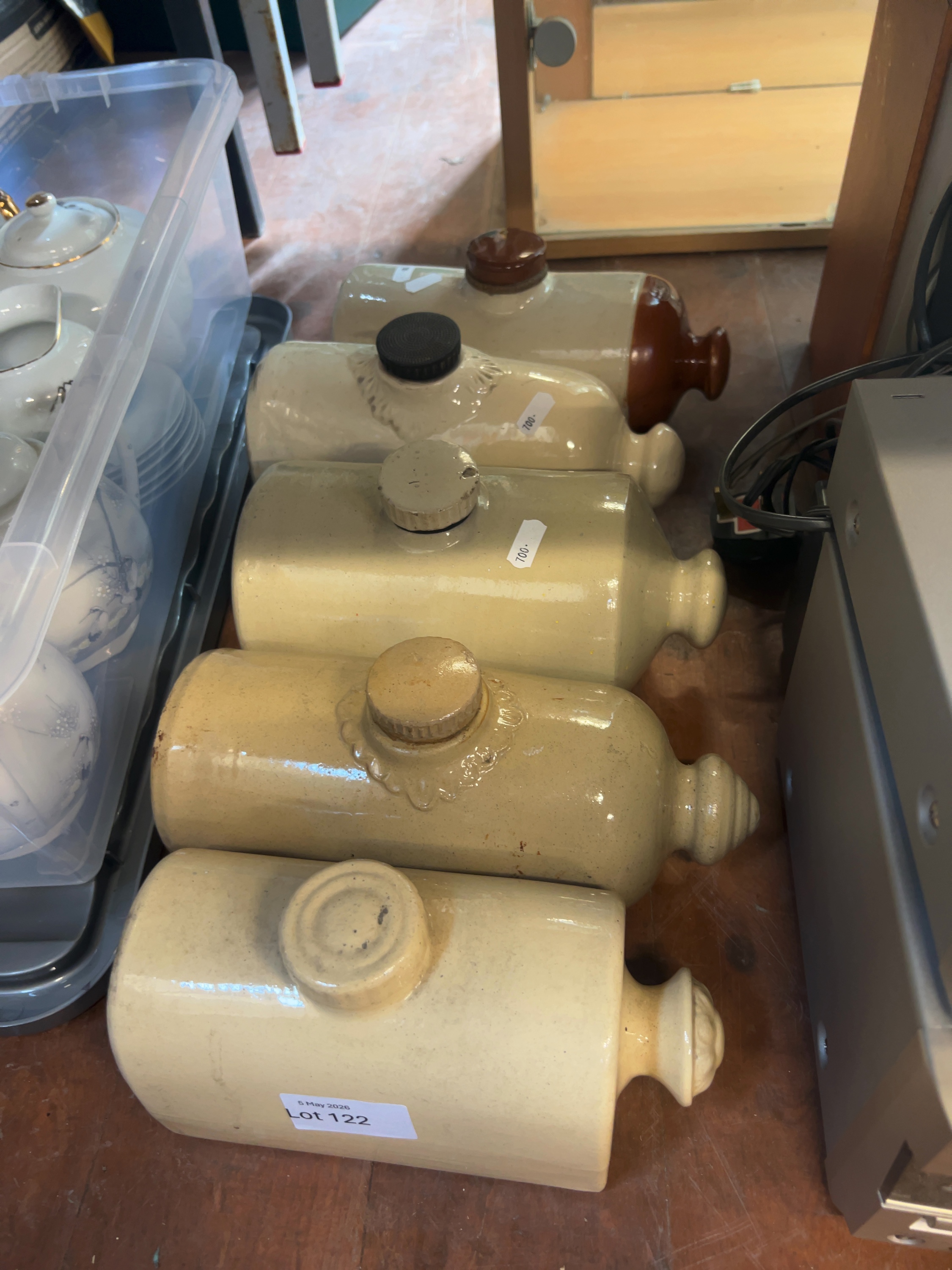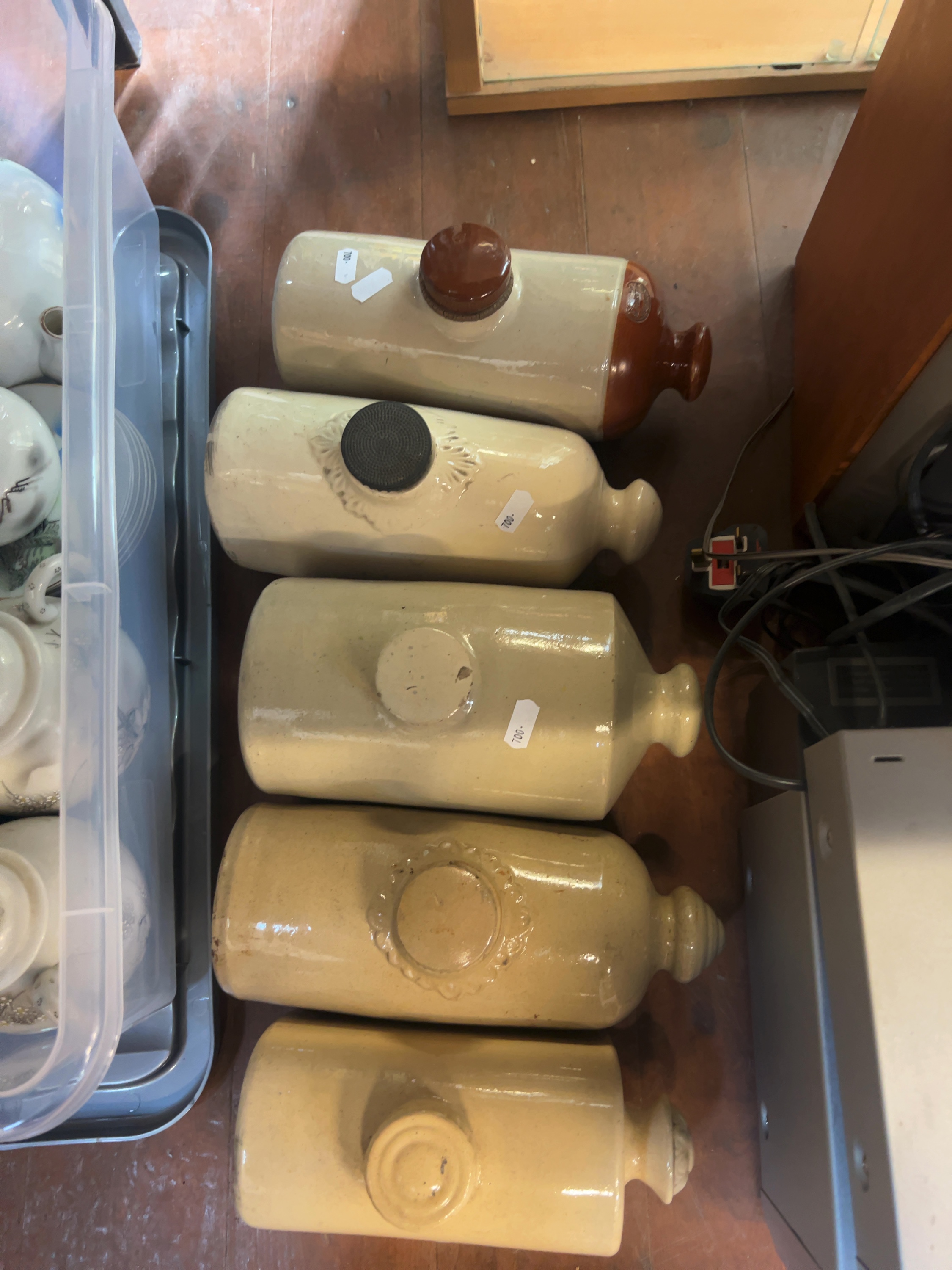 This collection consists of five salt-glazed stoneware hot water bottles, traditionally referred to as pigs, dating from the late 19th or early 20th century.