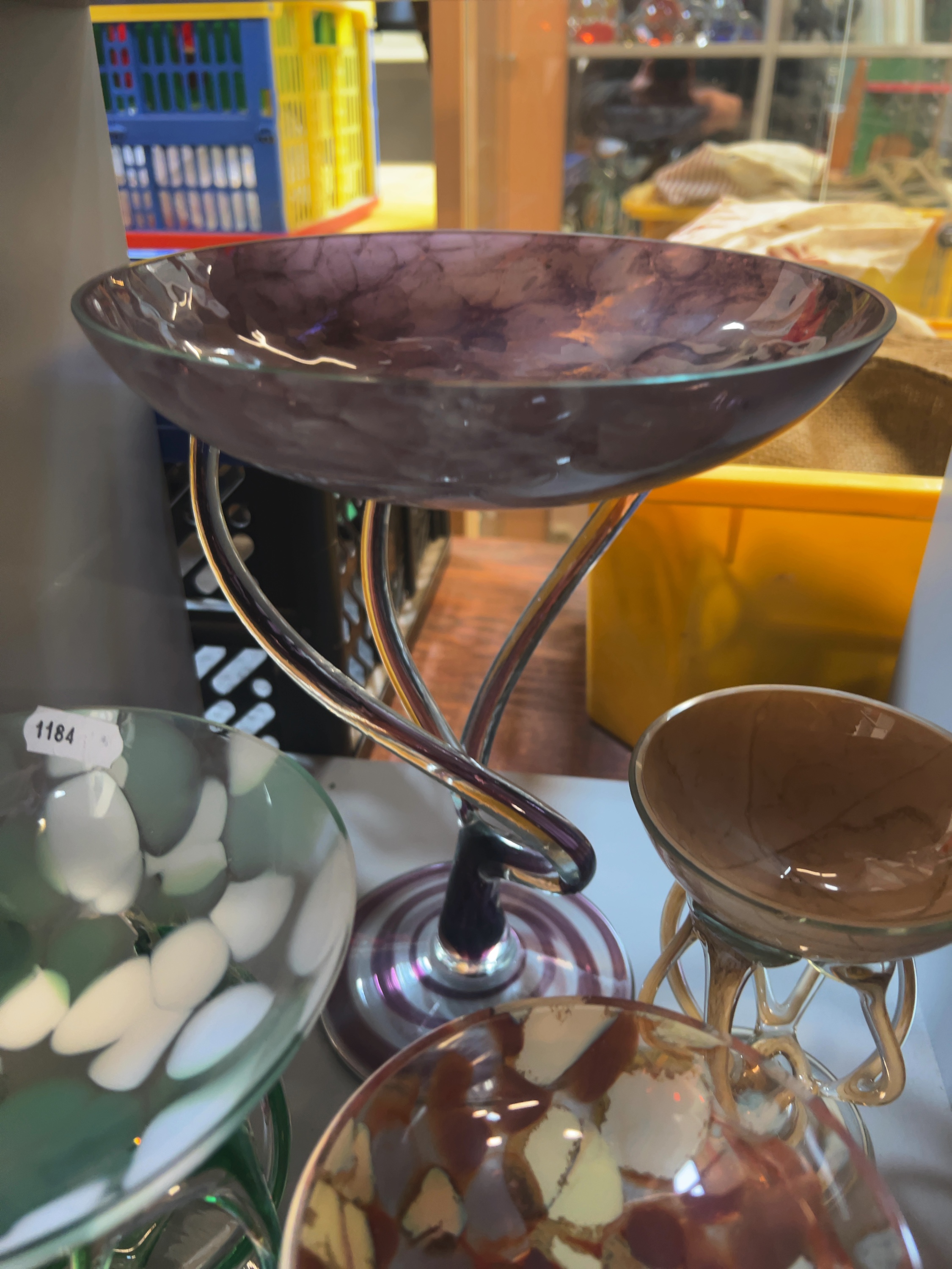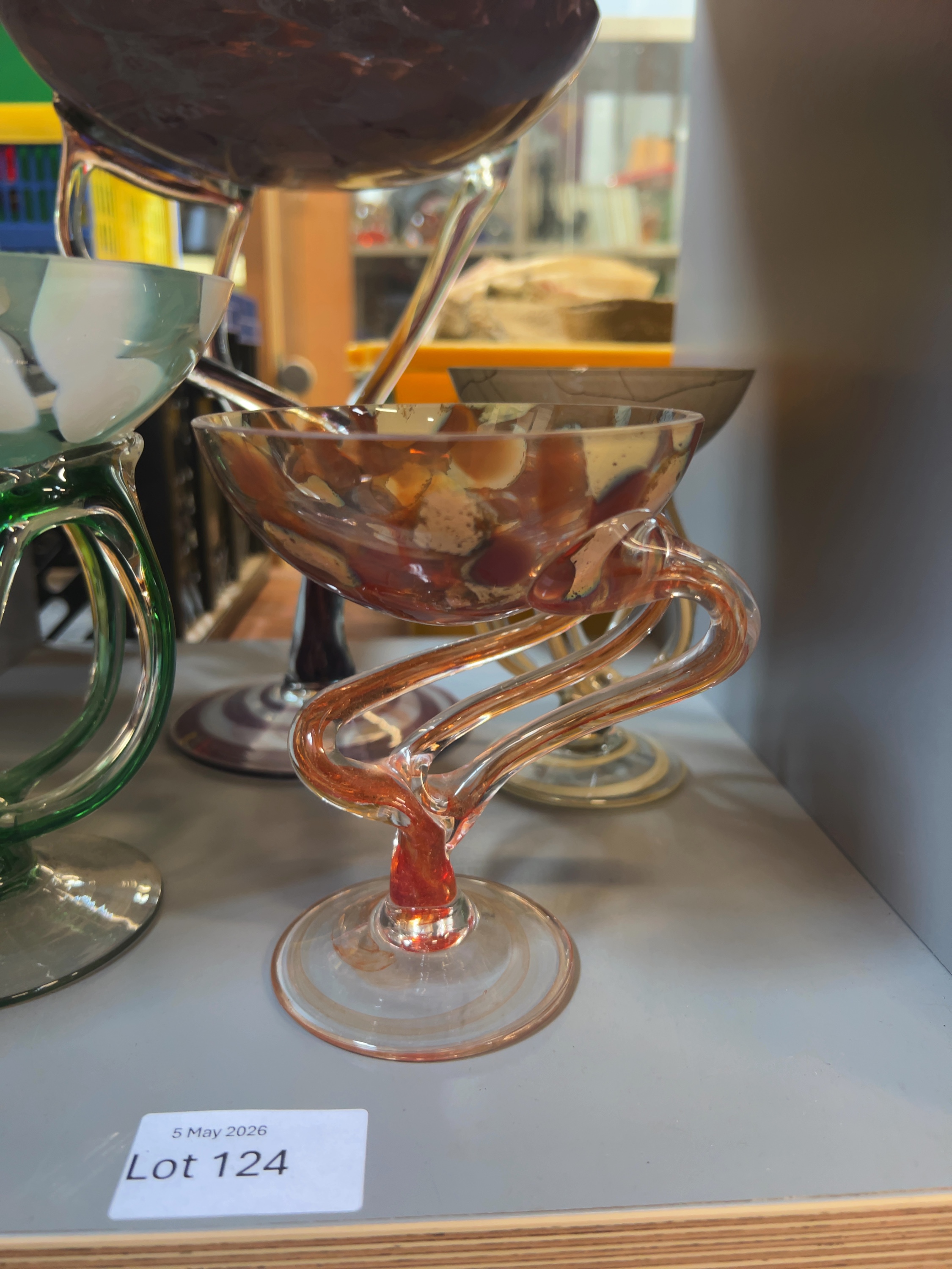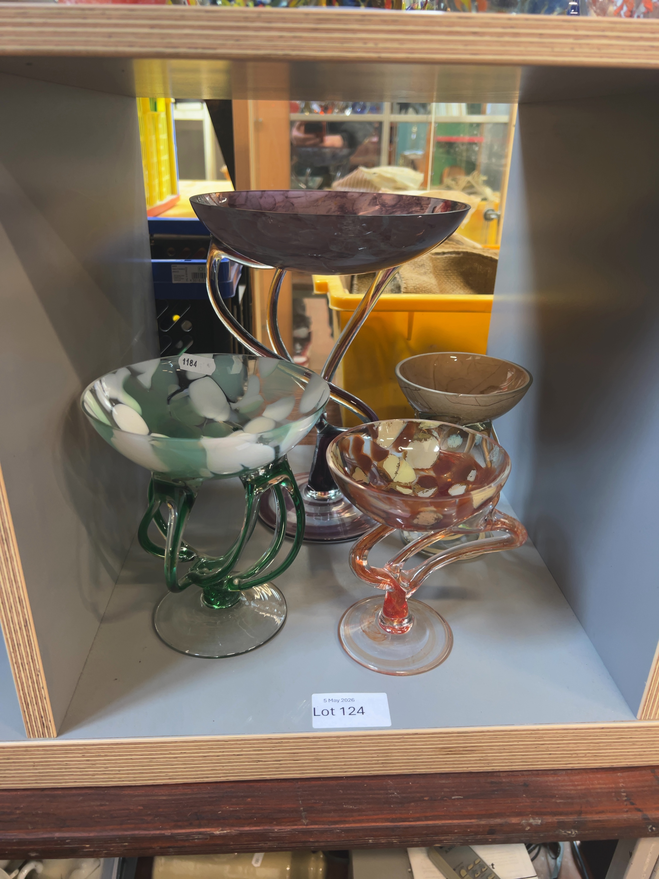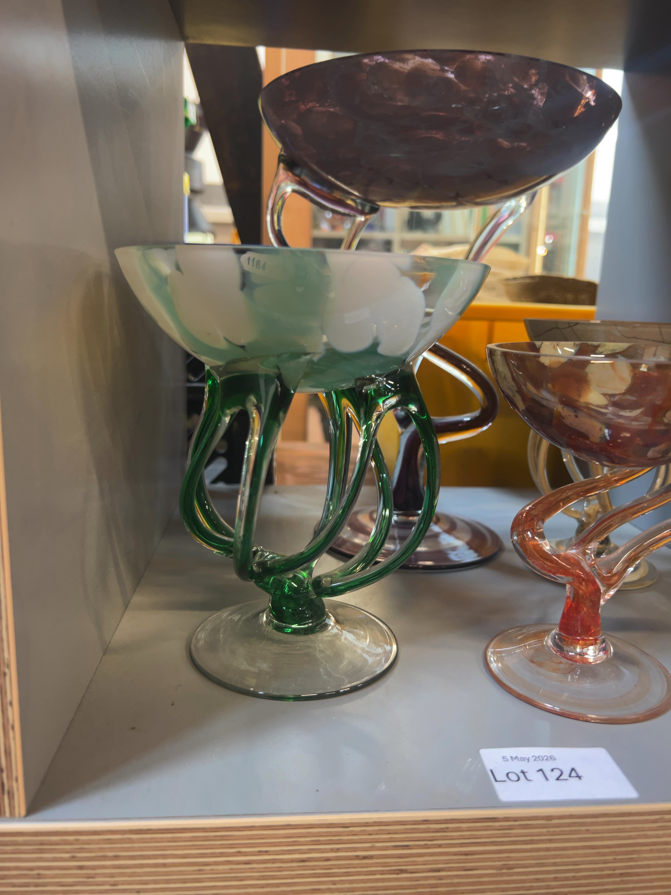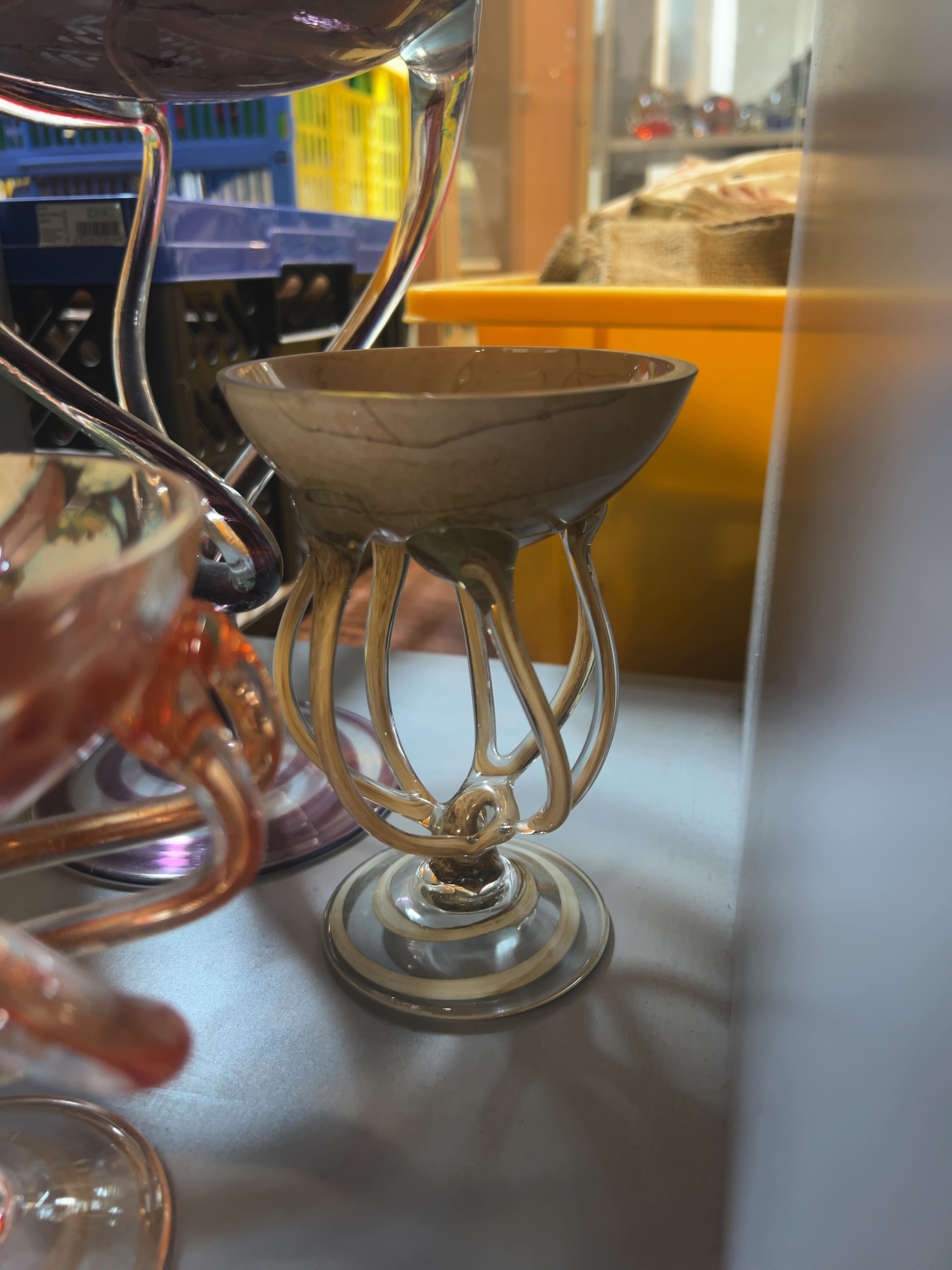 This collection comprises an assortment of contemporary studio art glass pedestal vessels, attributed to the Jozefina glassworks in Krosno, Poland. Each piece is hand-blown and features a mottled or variegated bowl supported by complex, sculptural stems in the jellyfish or octopus style. These items are characteristic of Polish art glass from the late 20th to early 21st century.
