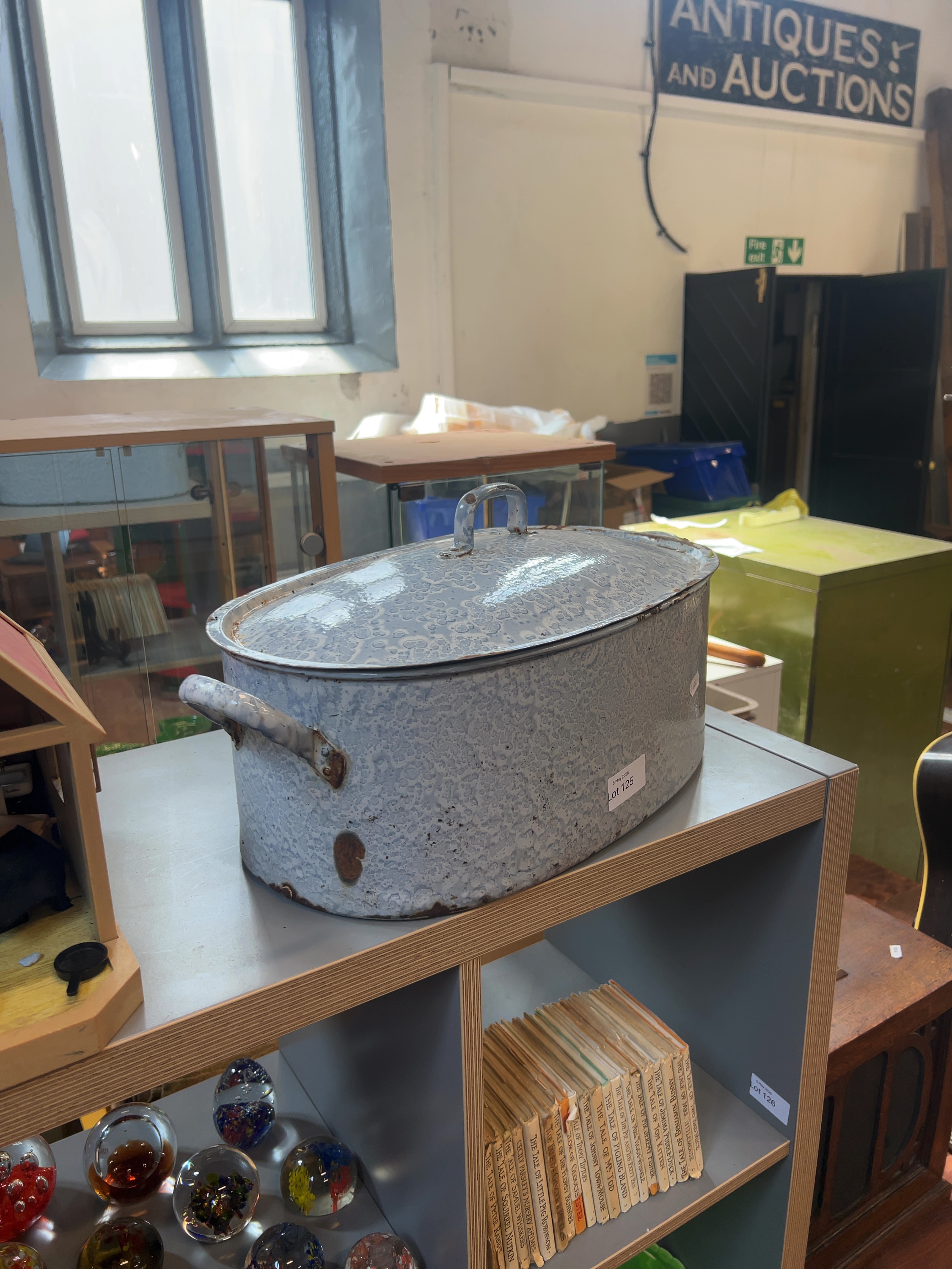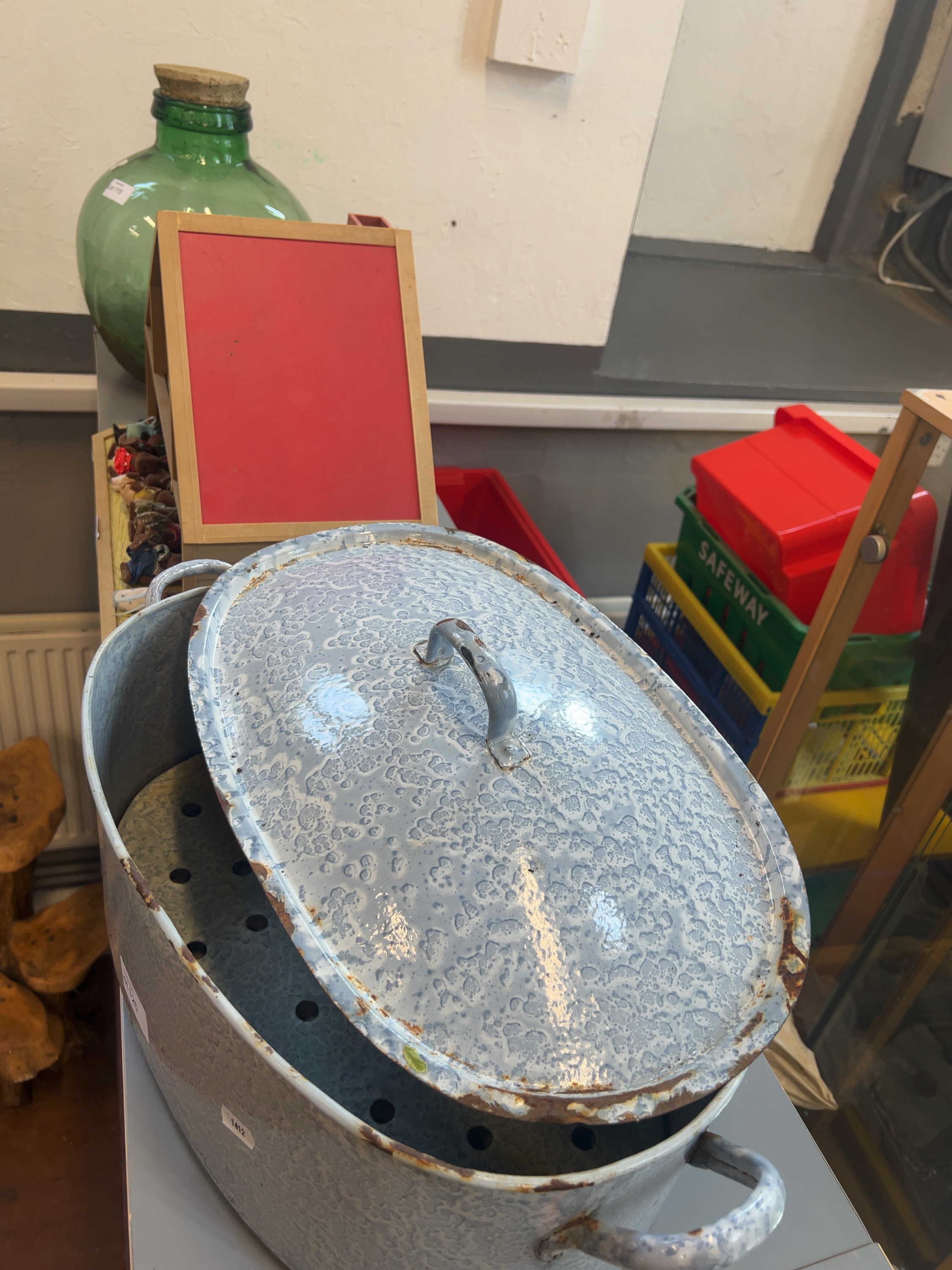 A vintage oval-shaped boiler constructed from sheet metal with a blue and white mottled porcelain enamel finish, commonly referred to as graniteware and contains a removable perforated metal rack or tray. There are no maker’s marks or stamps visible on the surfaces.
