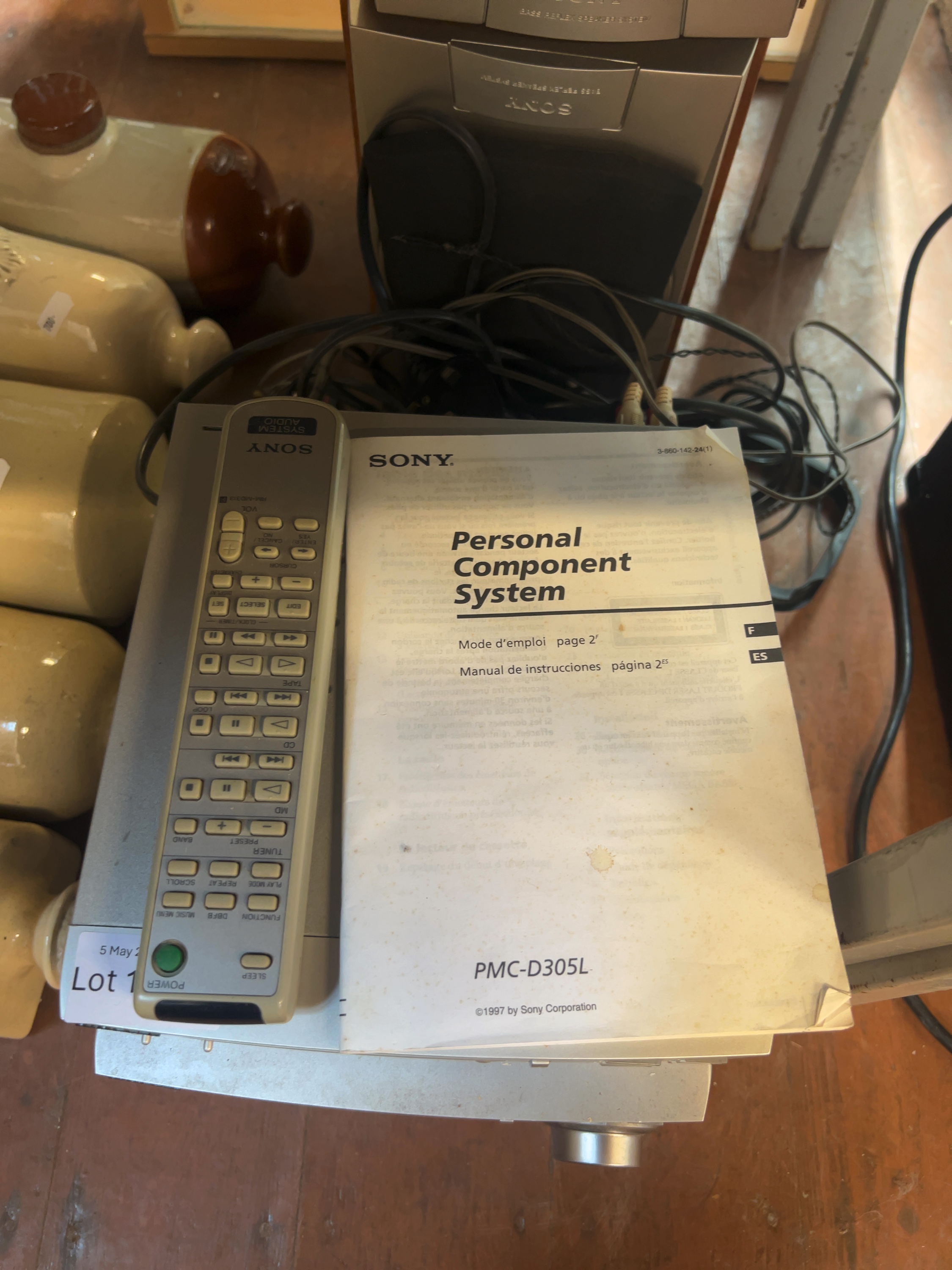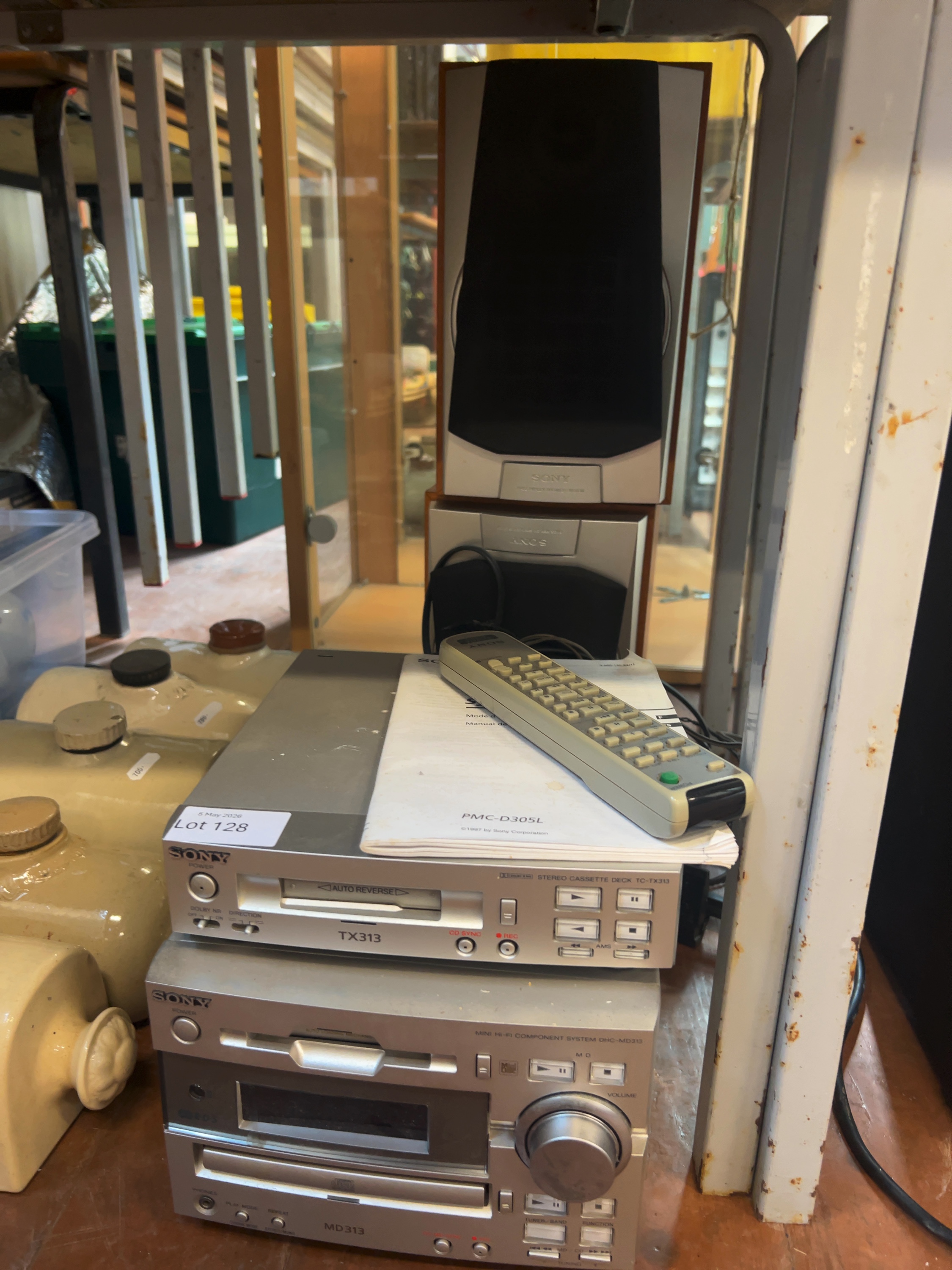 A Sony audio system comprising a DHC-MD313 main unit and a TC-TX313 stereo cassette deck. The DHC-MD313 unit features an integrated MiniDisc recorder/player and a compact disc player. The TC-TX313 is a matching stereo cassette deck There is a pair of Sony bookshelf speakers, a Sony remote control and a bundle of various connection cables, and manual for a Sony PMC-D305L personal component system.