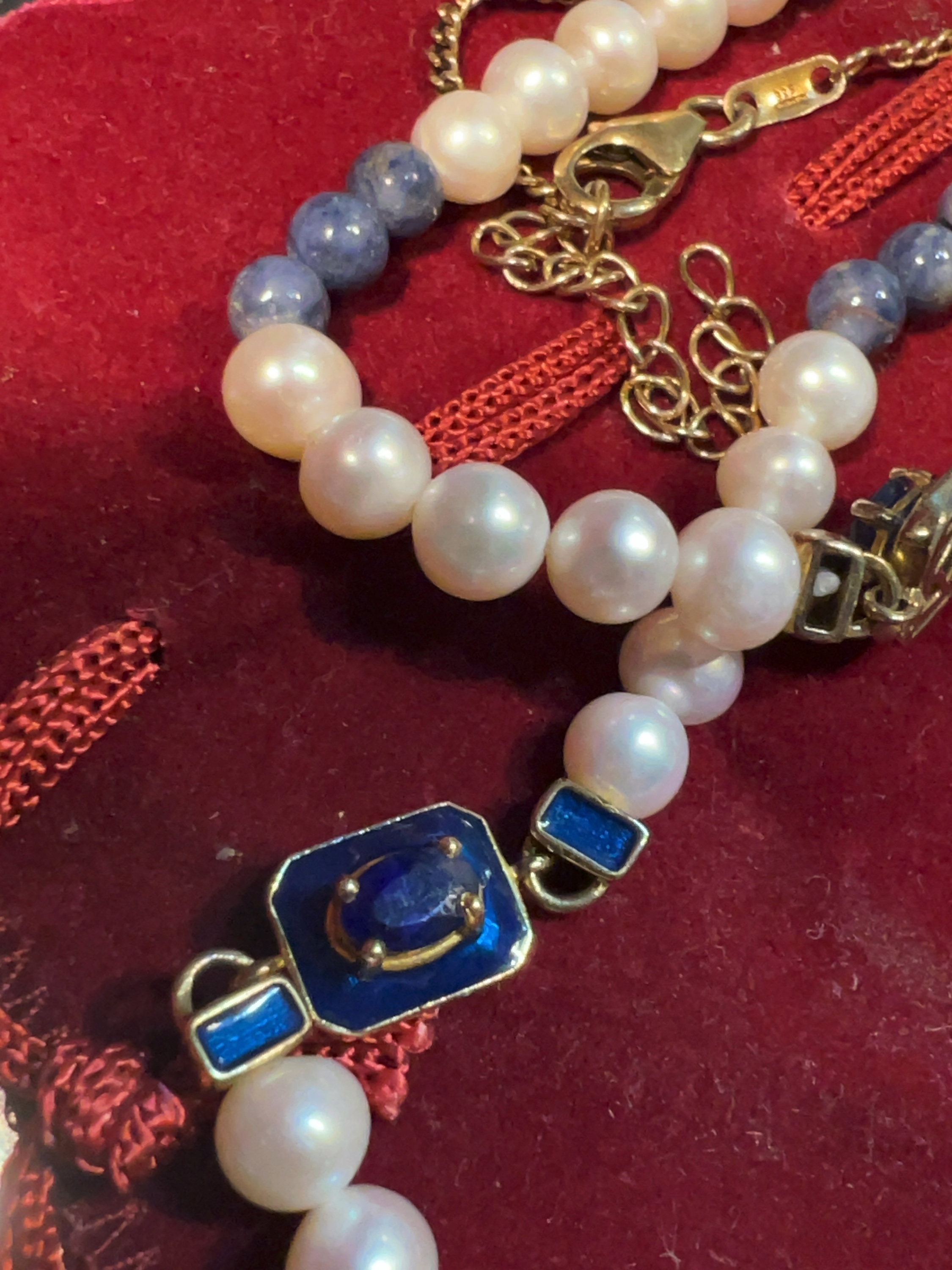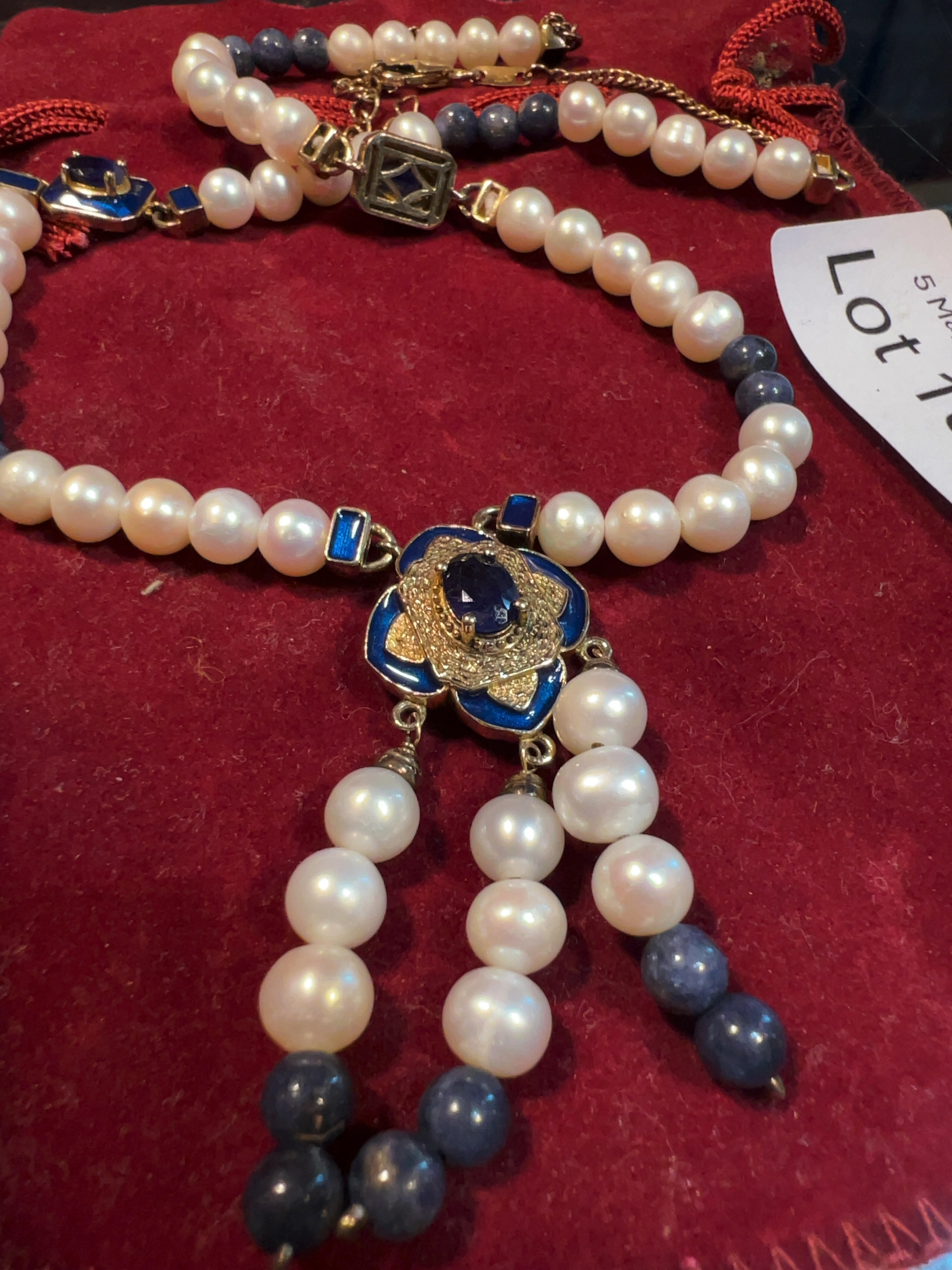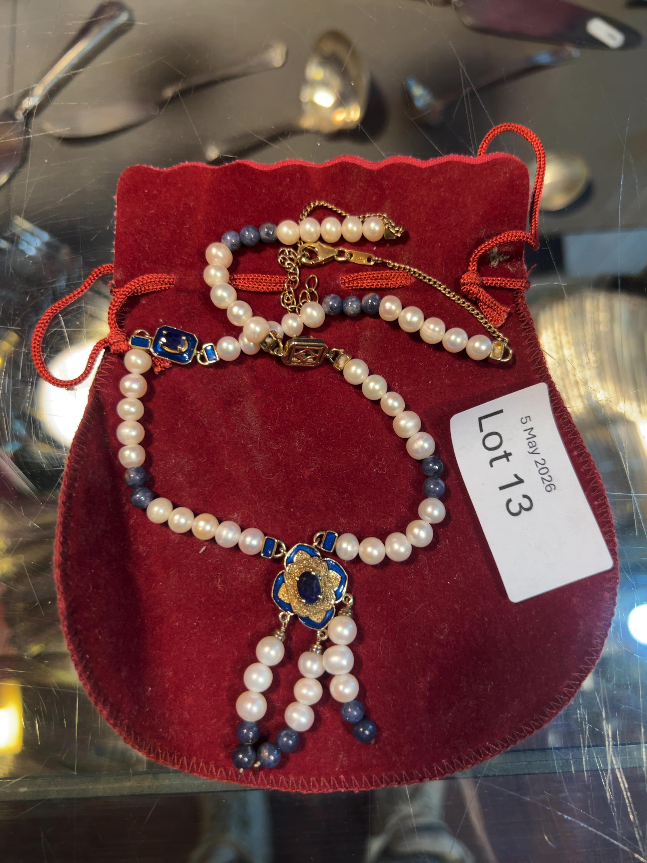 The necklace is in good condition. The blue enamel is intact across the floral motif and side links. All pearls and stones appear secure. The clasp and extender chain are functional.