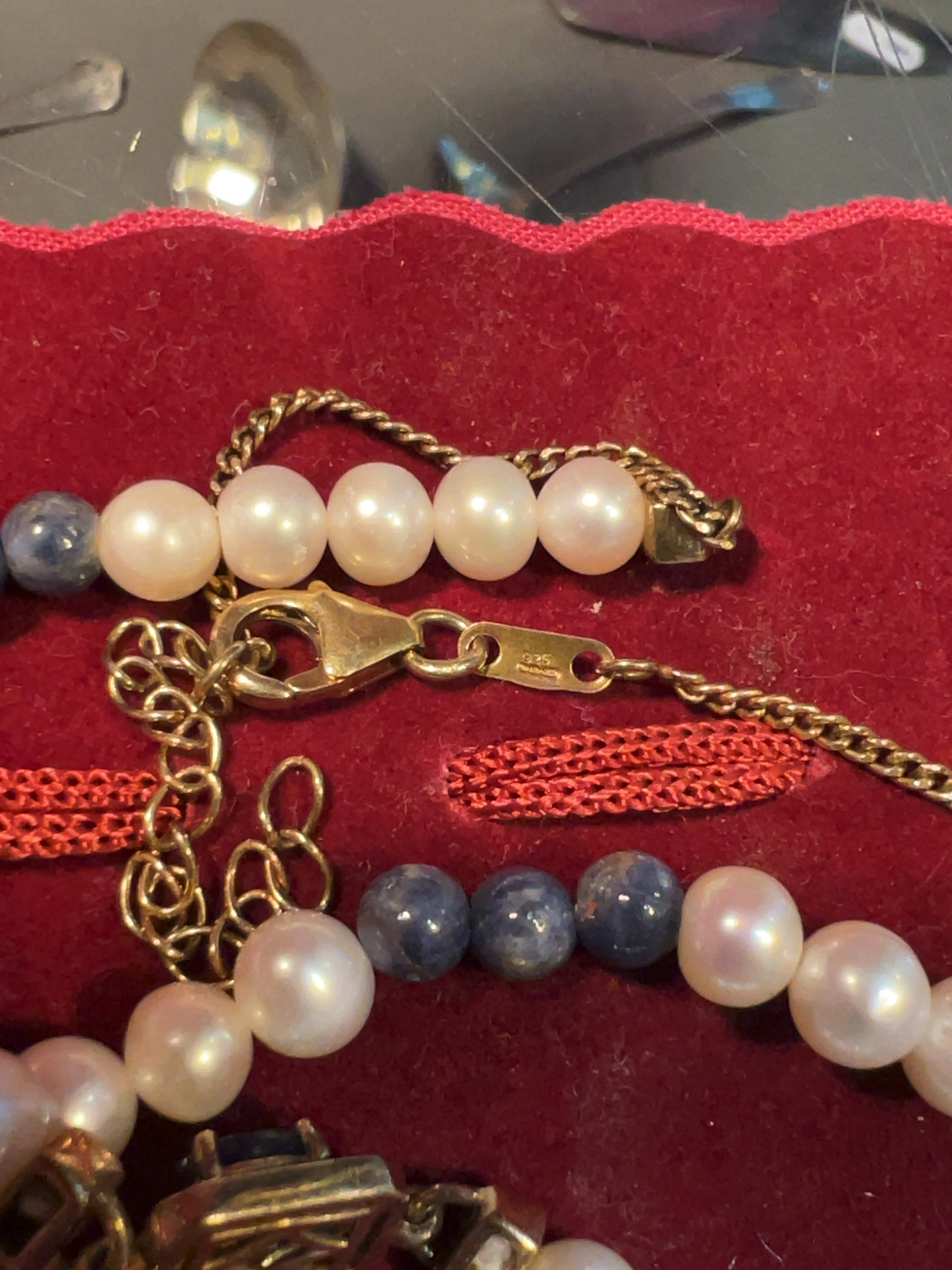 A decorative pendant necklace featuring a strand of white near-round cultured pearls interspersed with round opaque blue beads. The central feature is a floral-design pendant with blue-enamelled petals surrounding a textured gold-tone centre, claw-set with a central oval faceted blue stone. Suspended from the floral motif are three pearl and blue bead drops. The pendant is flanked by rectangular links featuring blue enamel and inset faceted blue stones. The necklace is constructed from yellow gold-toned sterling silver and is secured by a lobster claw clasp with a fine curb-link extender chain. A metal tag near the clasp is stamped with the hallmark 925.