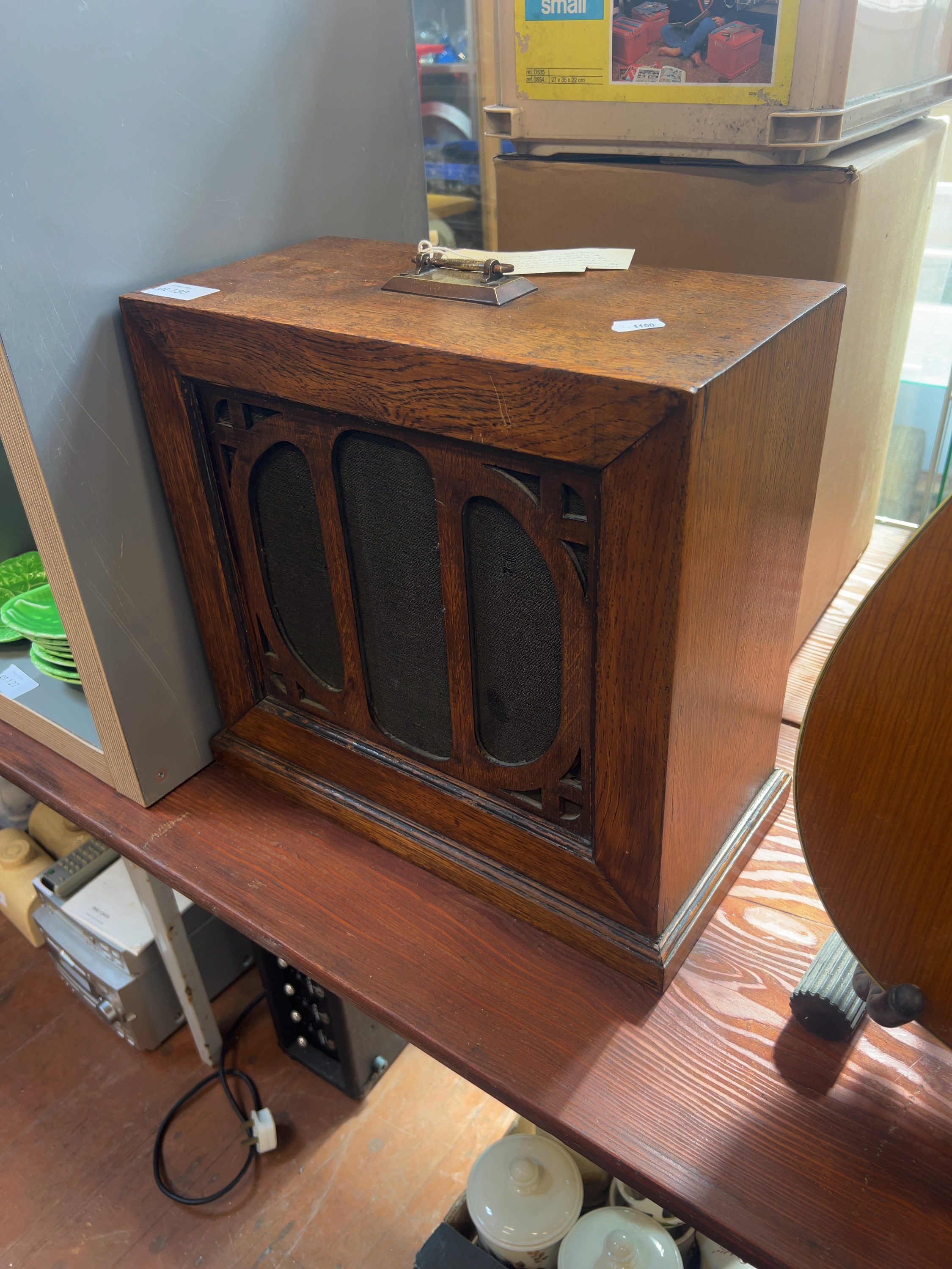 The exterior oak cabinet is in good vintage condition, exhibiting an attractive aged patina. There are signs of age-related wear, including surface scratches and small scuffs, particularly to the top surface and the base.The item is sold as an auction lot and is currently untested for functional performance.
