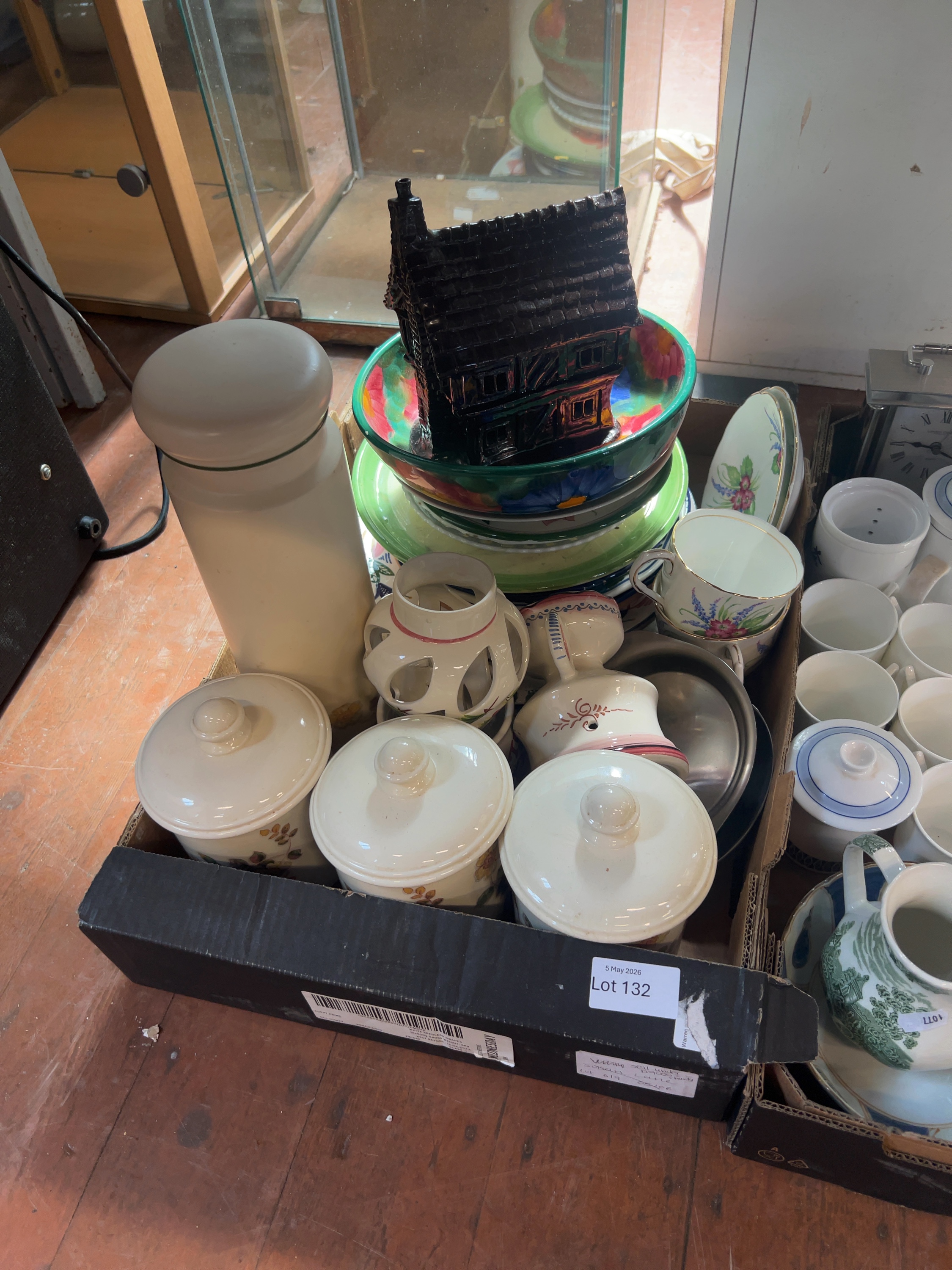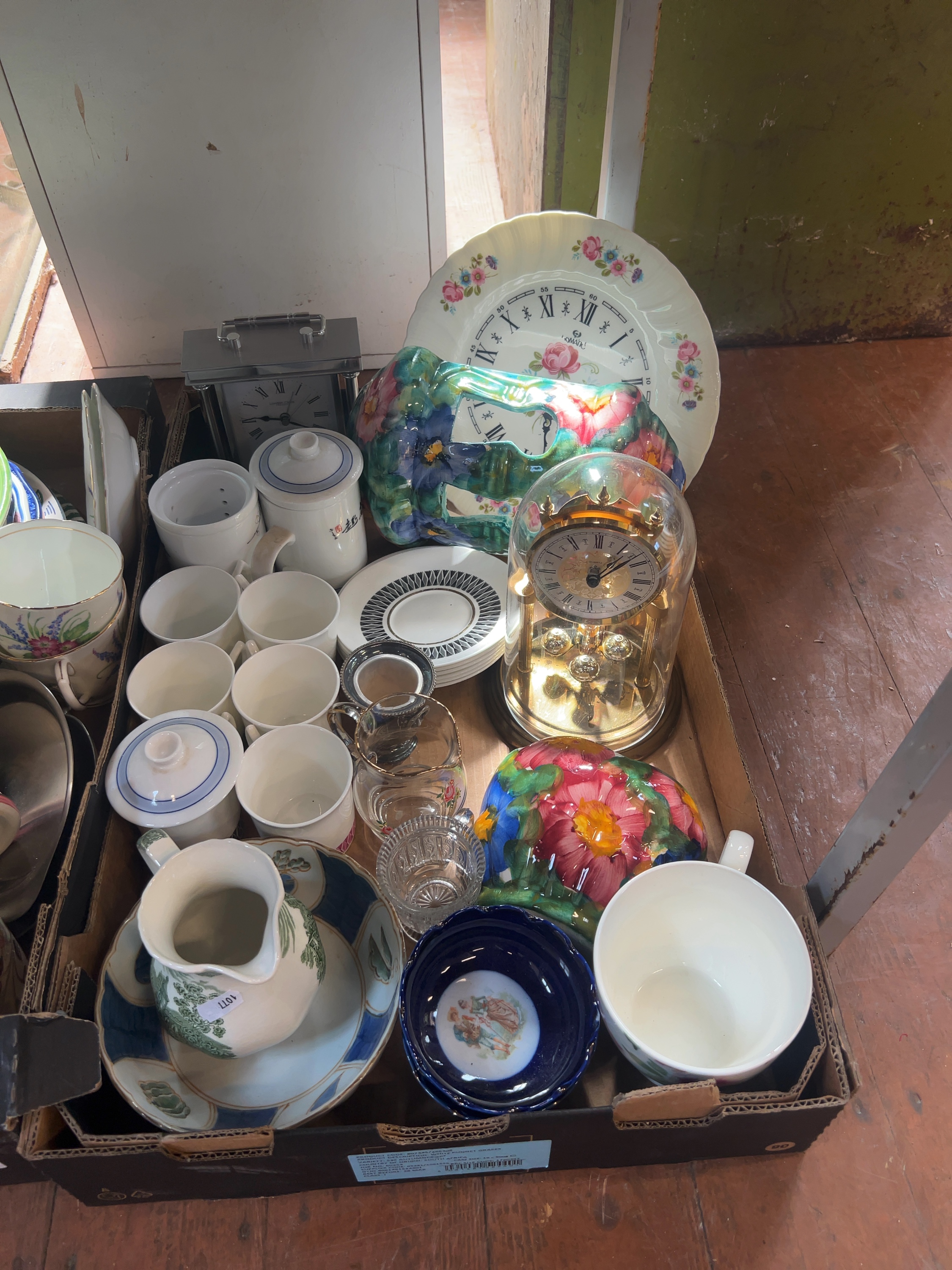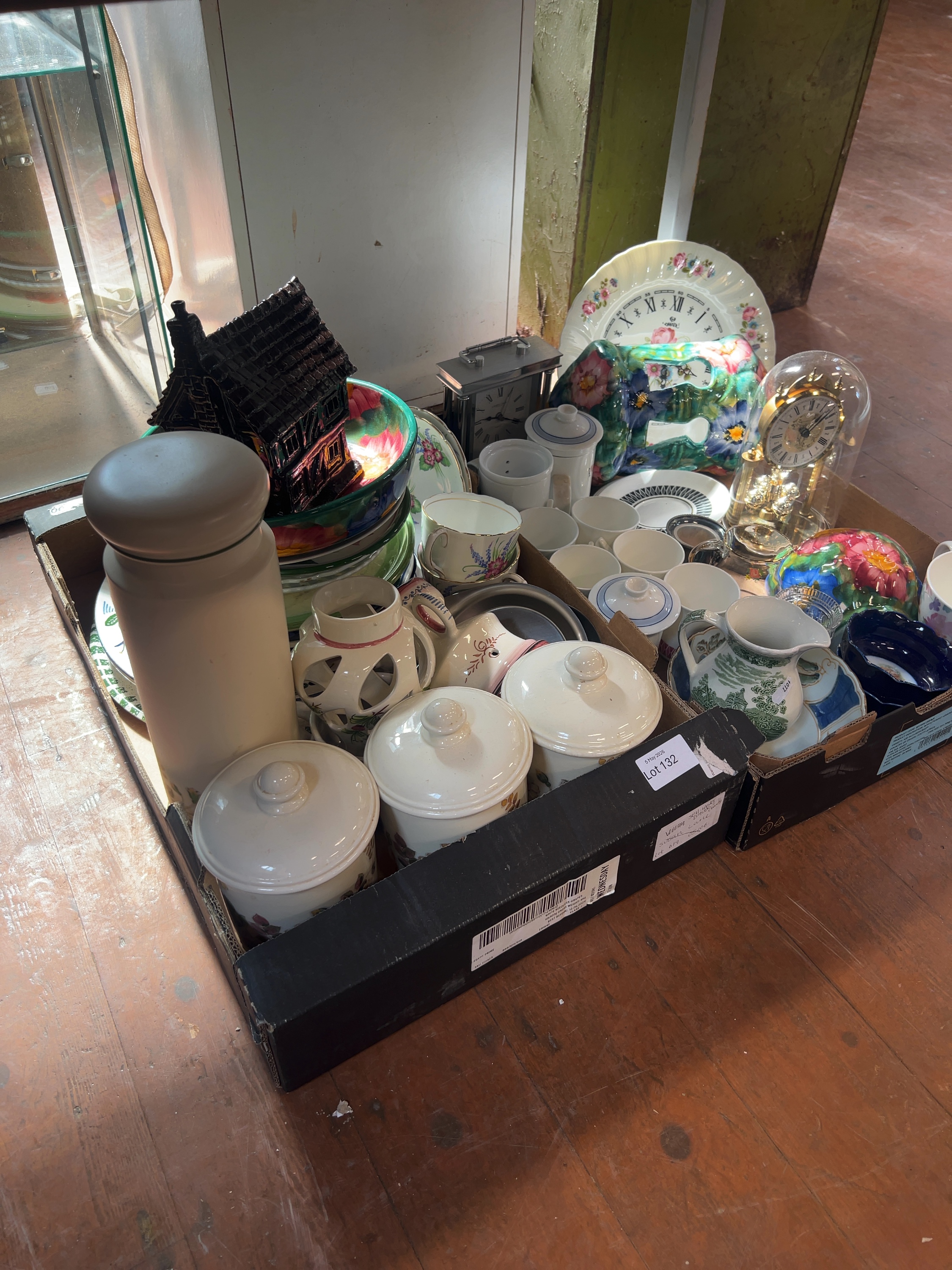 A variety of ceramic wares, clocks and household items contained within two boxes and include a large, cylindrical earthenware storage jar and lid, a set of three smaller stoneware lidded jars, an assortment of teacups, saucers and mugs, a jug and matching saucer, a small cobalt blue porcelain bowl featuring a central figurative scene. Decorative pieces include an earthenware bowl and dish in the style of Poole Pottery Delphis range, money box and white openwork ceramic vessel, a decorative ceramic plate clock with Roman numerals and floral borders, a torsion anniversary clock housed under a glass dome with a brass-toned metal frame and rotating pendulum, and a modern square silver-toned metal alarm clock. Additional items include a stack of white plates with a black geometric border and a small piece of etched glassware.