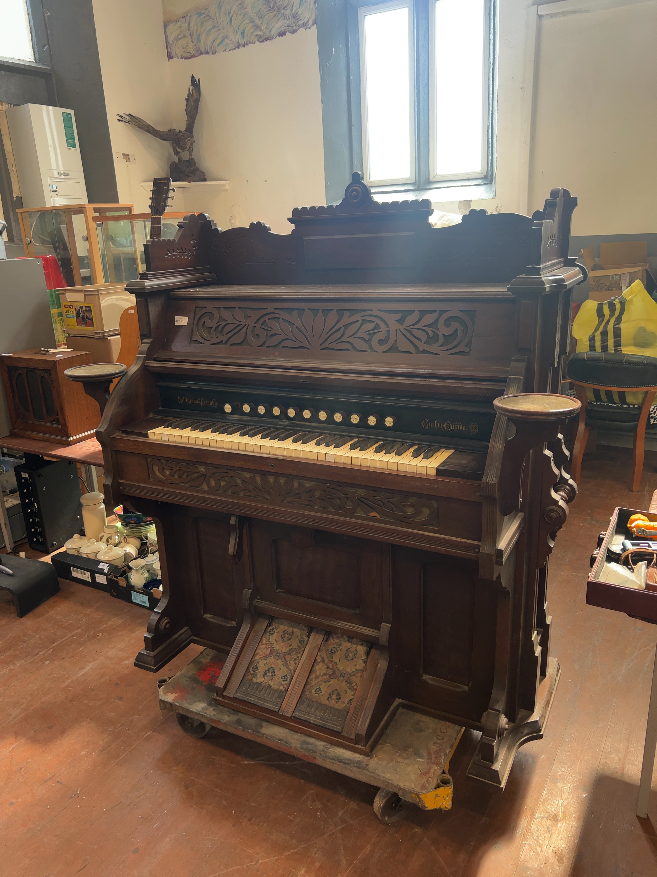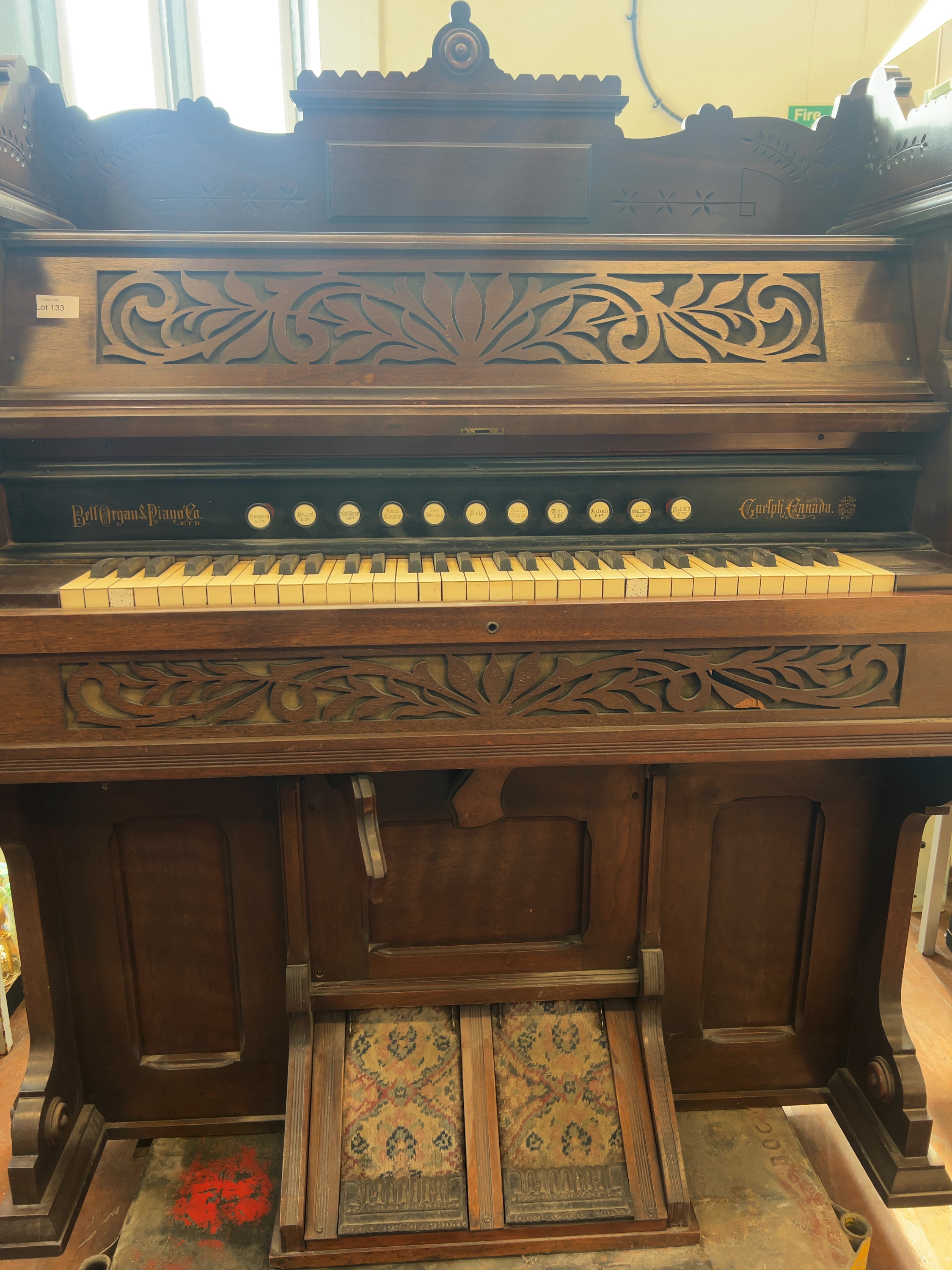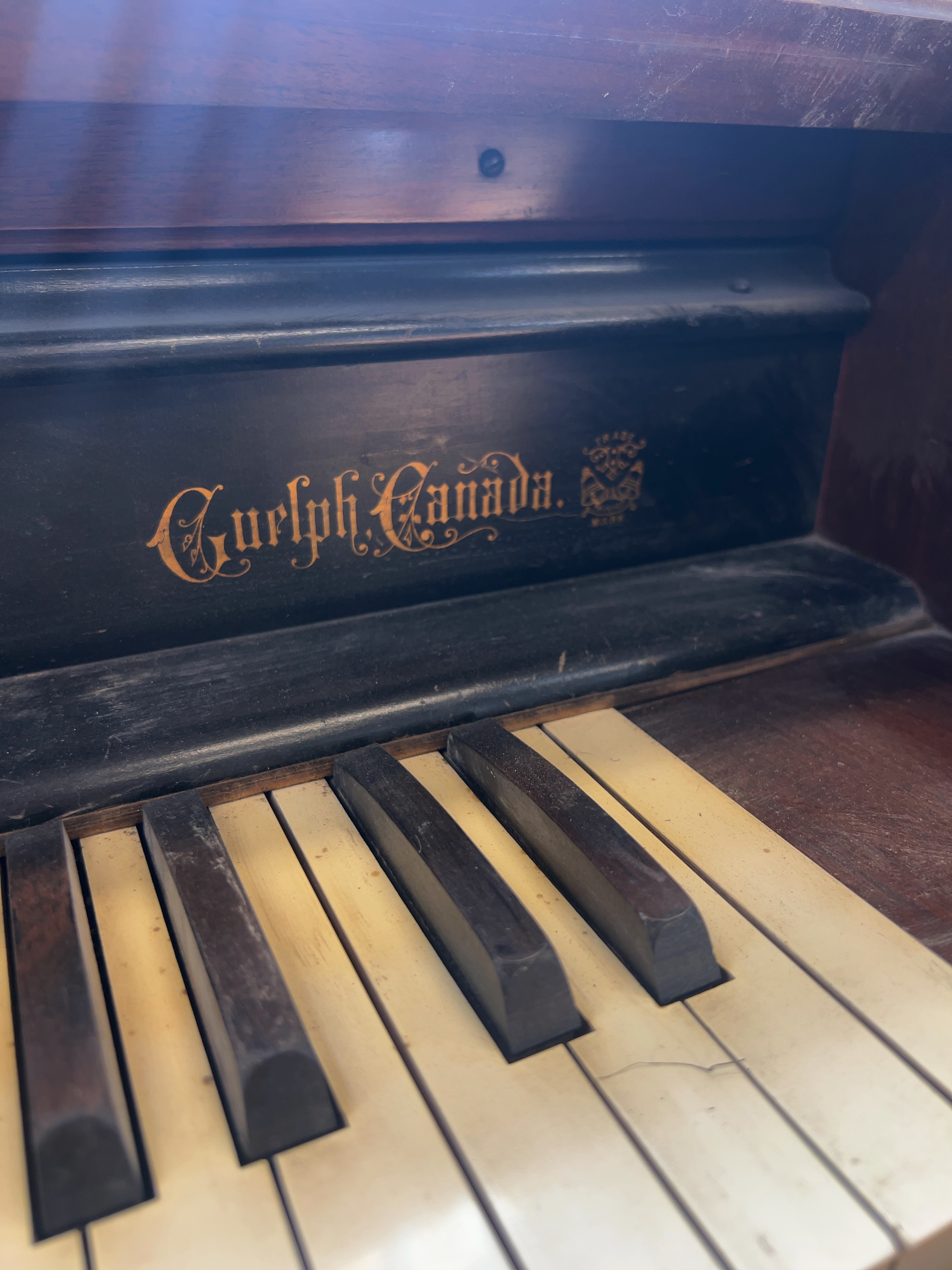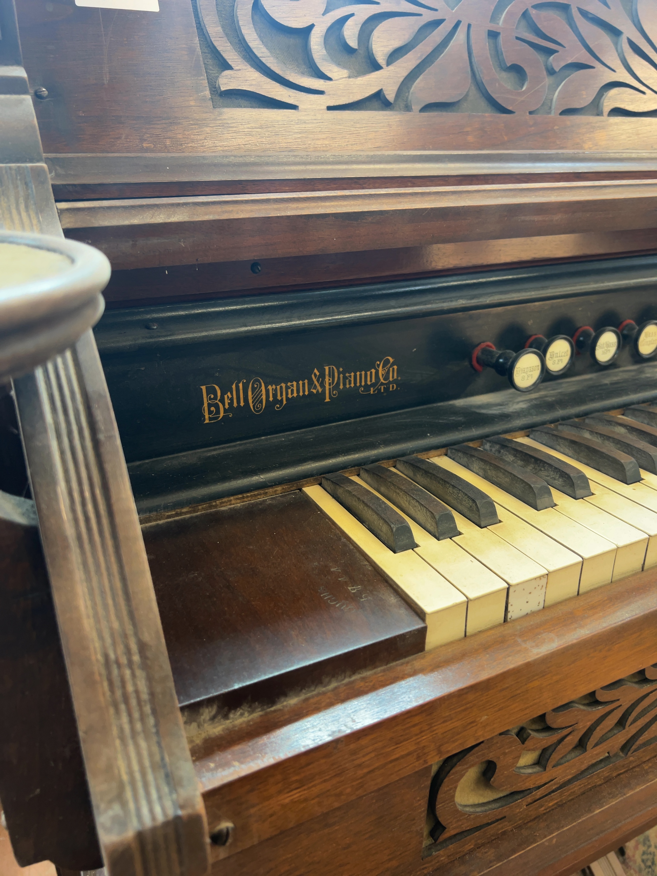 Bell Organ and Piano Co. Ltd. late Victorian cabinet reed organ, also known as a pump organ, manufactured in Guelph, Ontario, Canada. The wood block at the left end of the keyboard is stamped GUELPH 1778. The cast-iron foot plates are embossed with BELL on the left and GUELPH on the right.