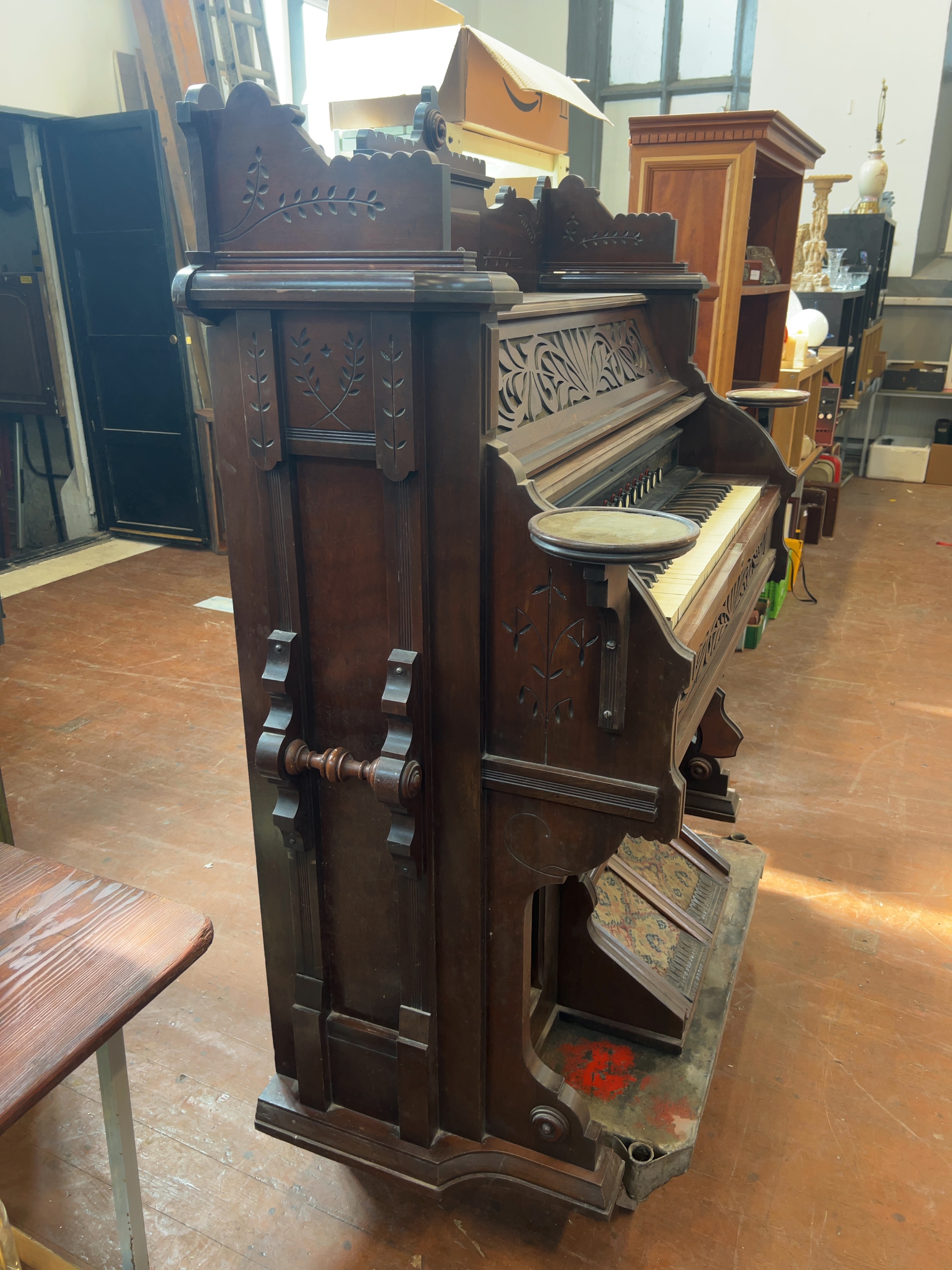 The organ is in fair to good antique condition. The wooden case has accumulated surface dust and shows minor scuffs and wear to the finish consistent with age and long-term storage. The keyboard displays significant yellowing and discolouration; several keys have chipped or missing sections of the ivory or celluloid veneer. The carpeting on the foot pedals shows signs of wear but remains intact. The internal mechanical components and bellows have not been tested for functional operation.