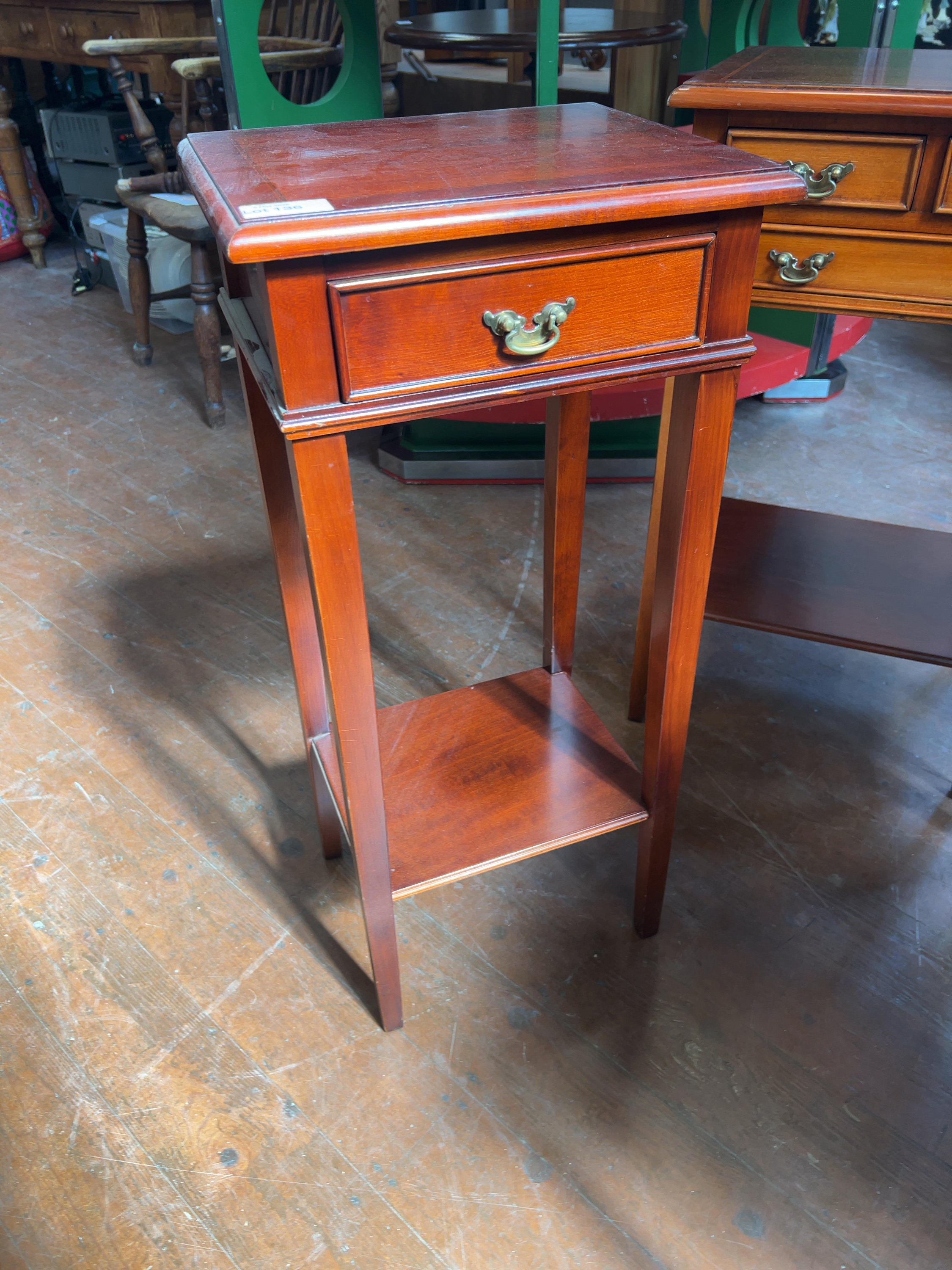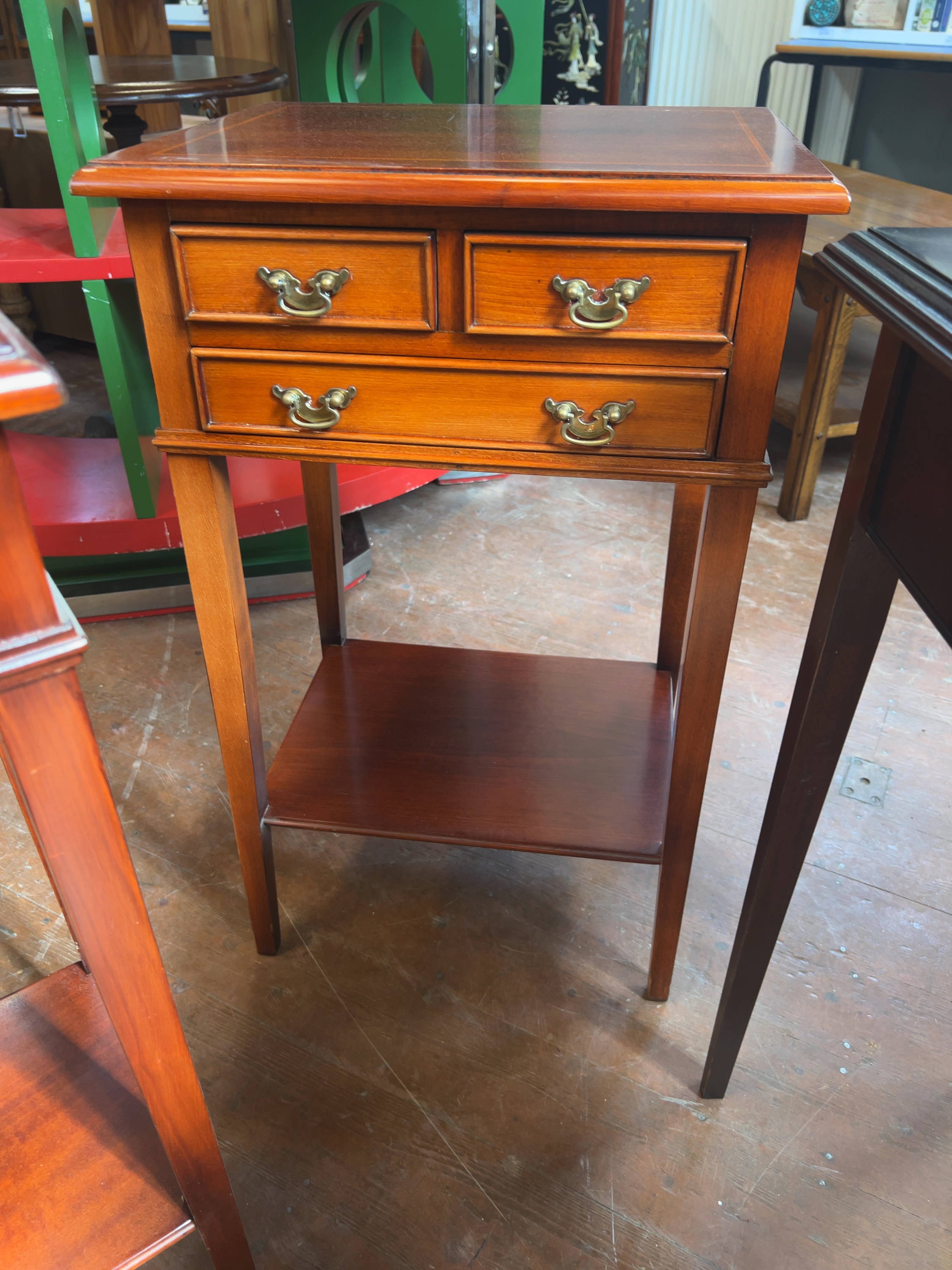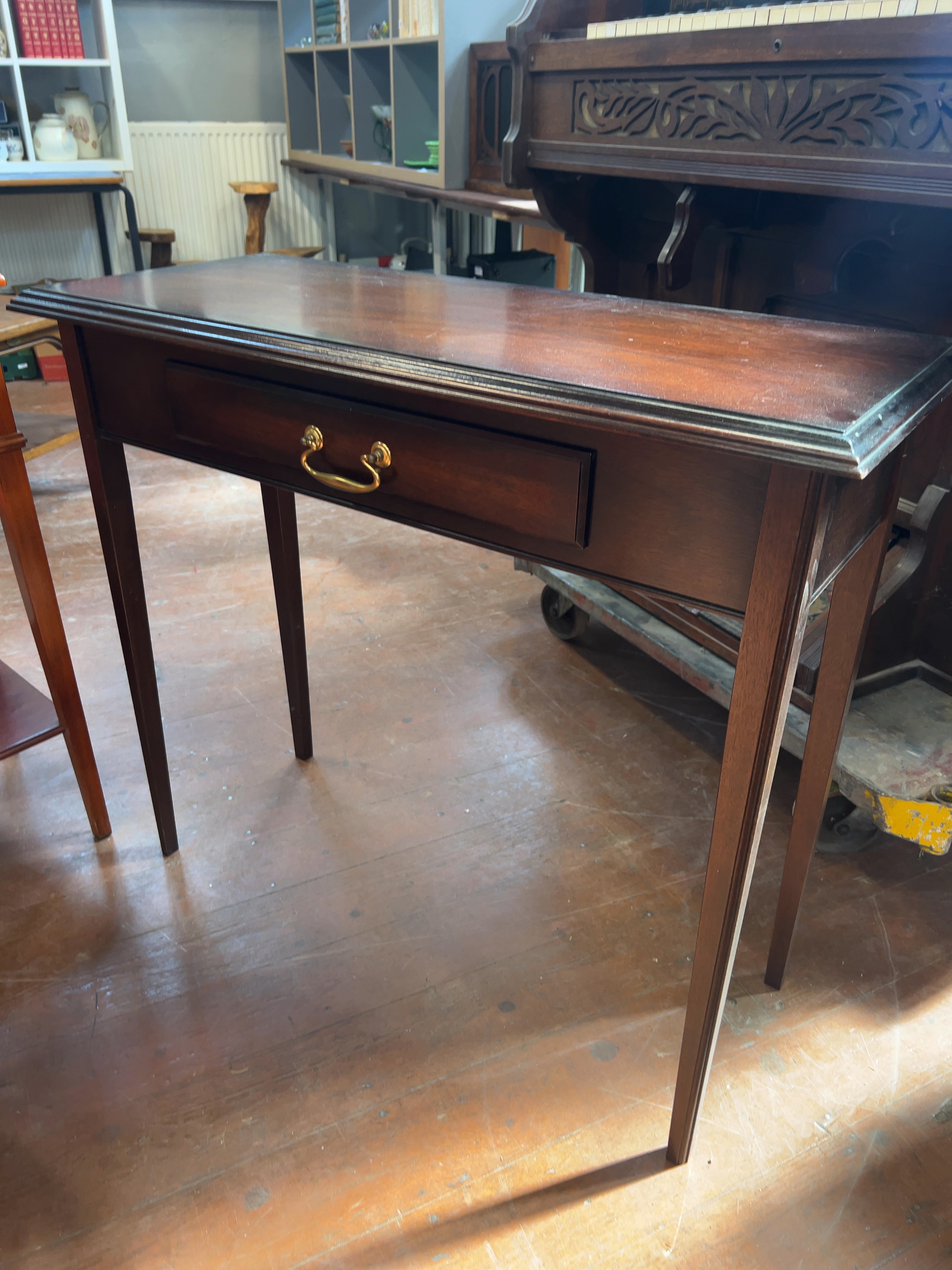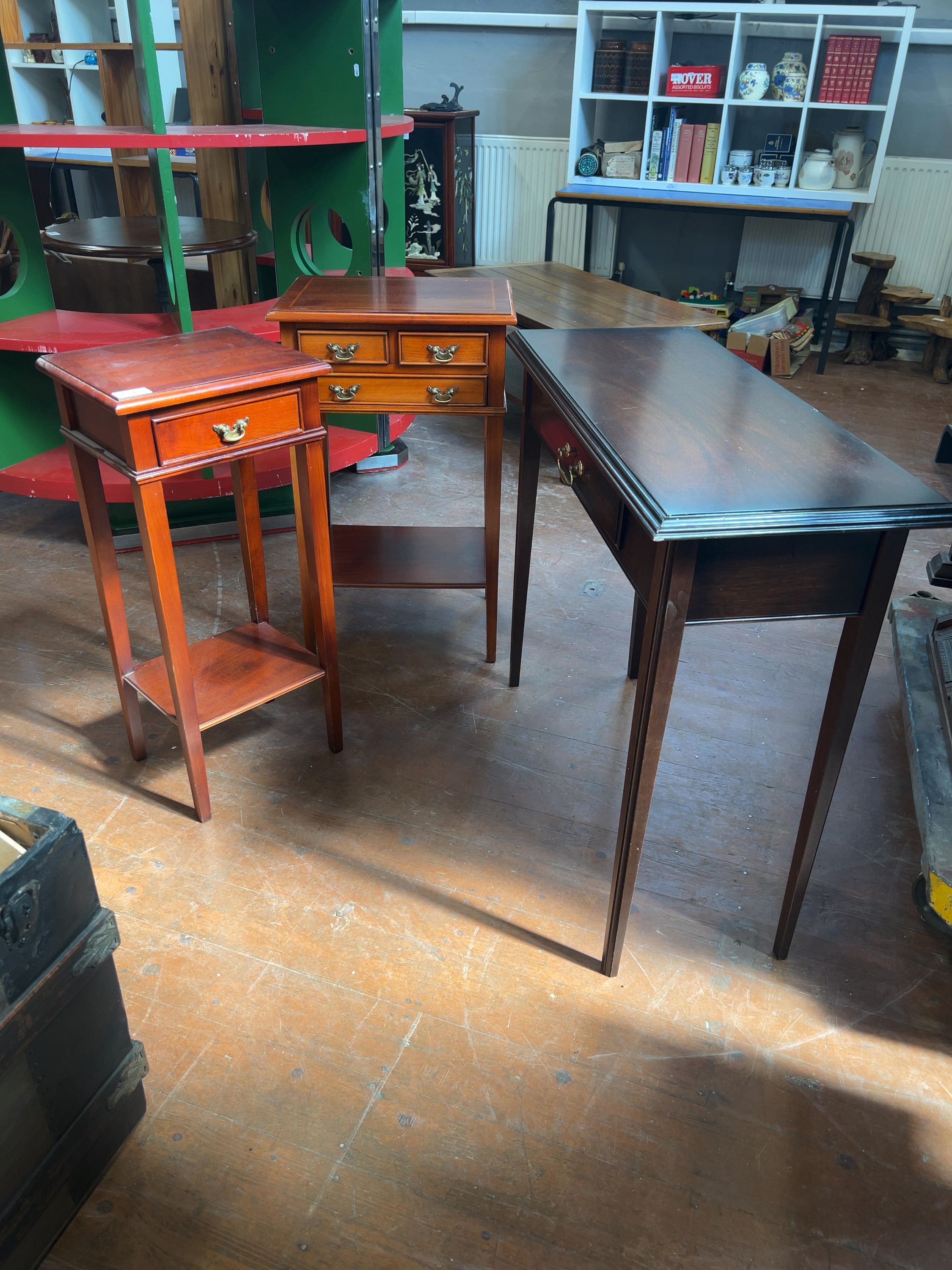 A trio of mahogany-stained hardwood side tables in the Georgian revival style, dating from the late 20th century. – a single-drawer lamp table; a three-drawer occasional table,and a console or small dressing table. No maker’s marks are visible.