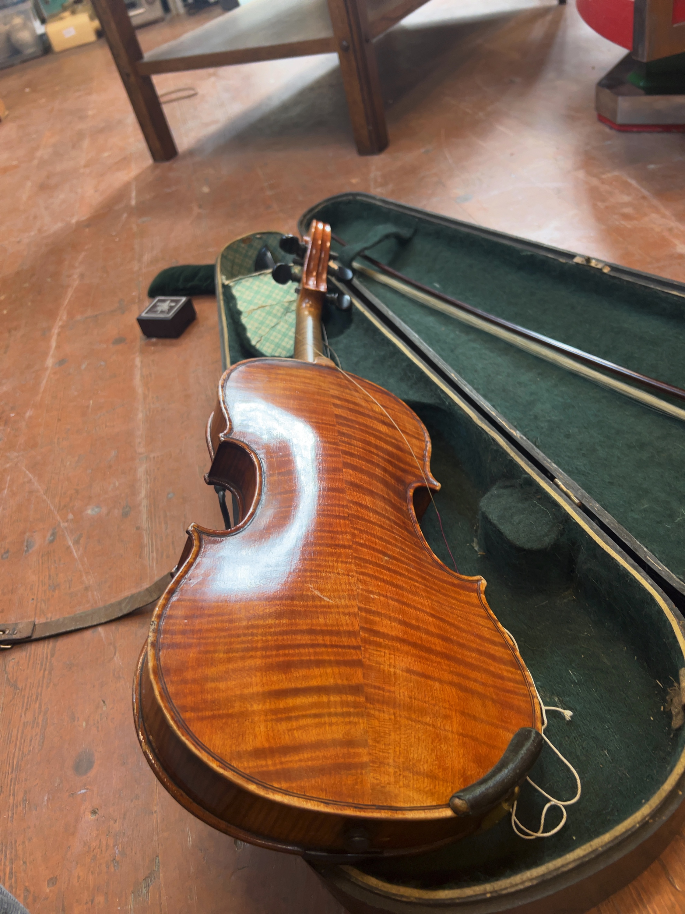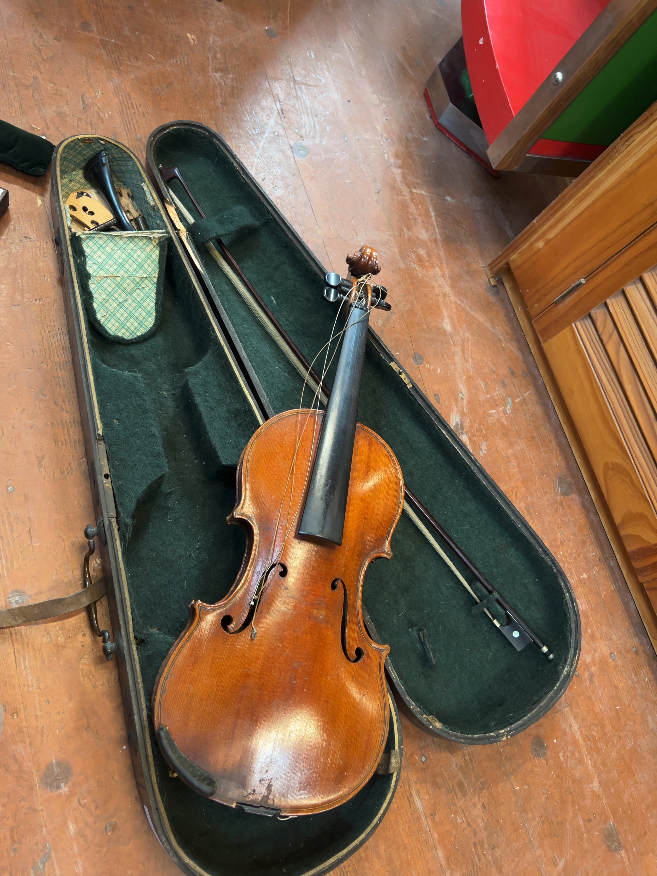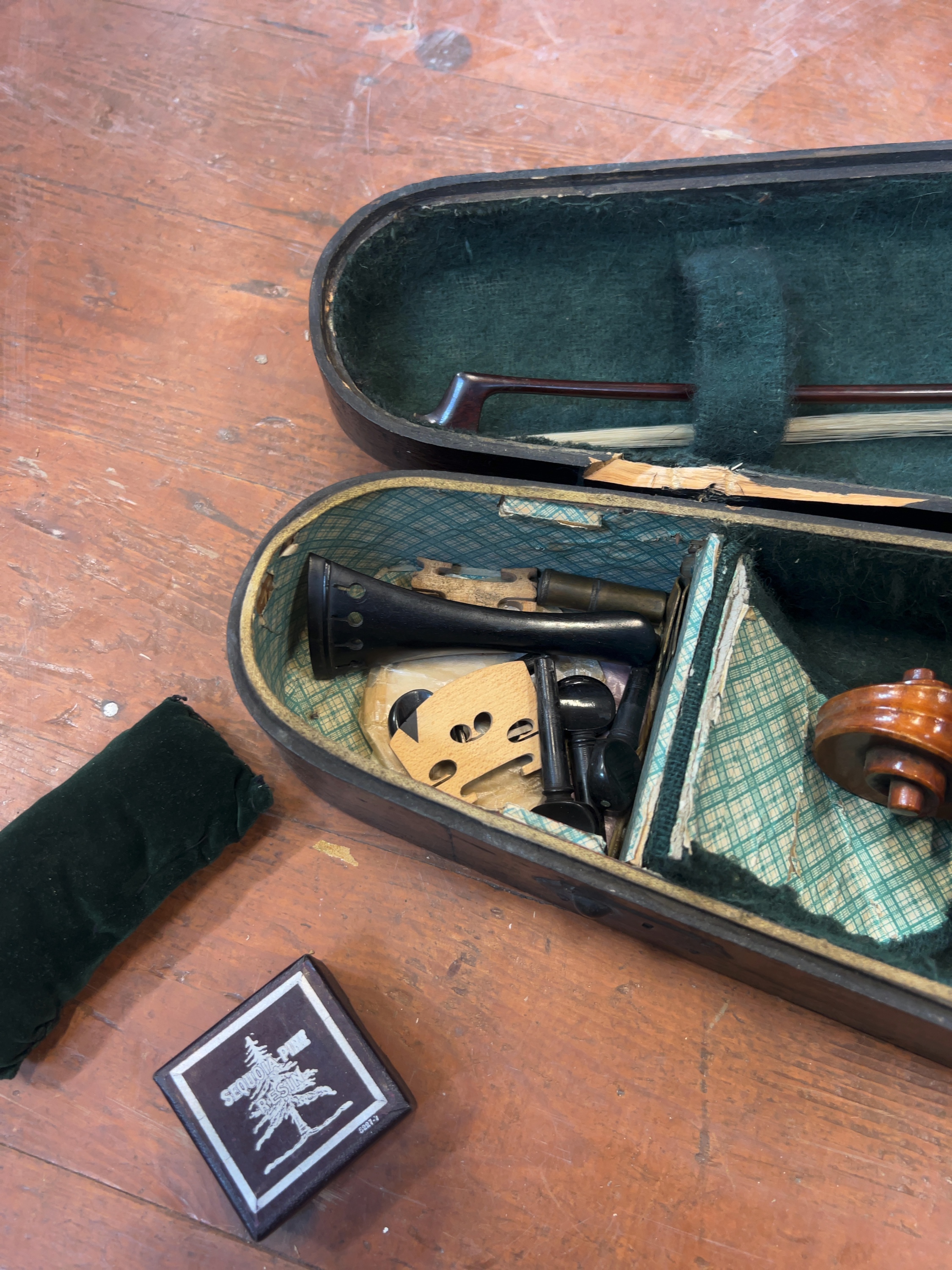 The instrument is offered in as found condition and requires professional restoration and setup. It is currently disassembled; the bridge, tailpiece, and pegs are detached but present. The strings are loose and tangled. The varnish exhibits general age-related surface wear, scratches, and minor chipping to the edges. No significant cracks are immediately apparent. The bow hair is loose and requires replacement. The wooden case shows significant exterior wear and paint loss, and includes a worn leather securing strap.