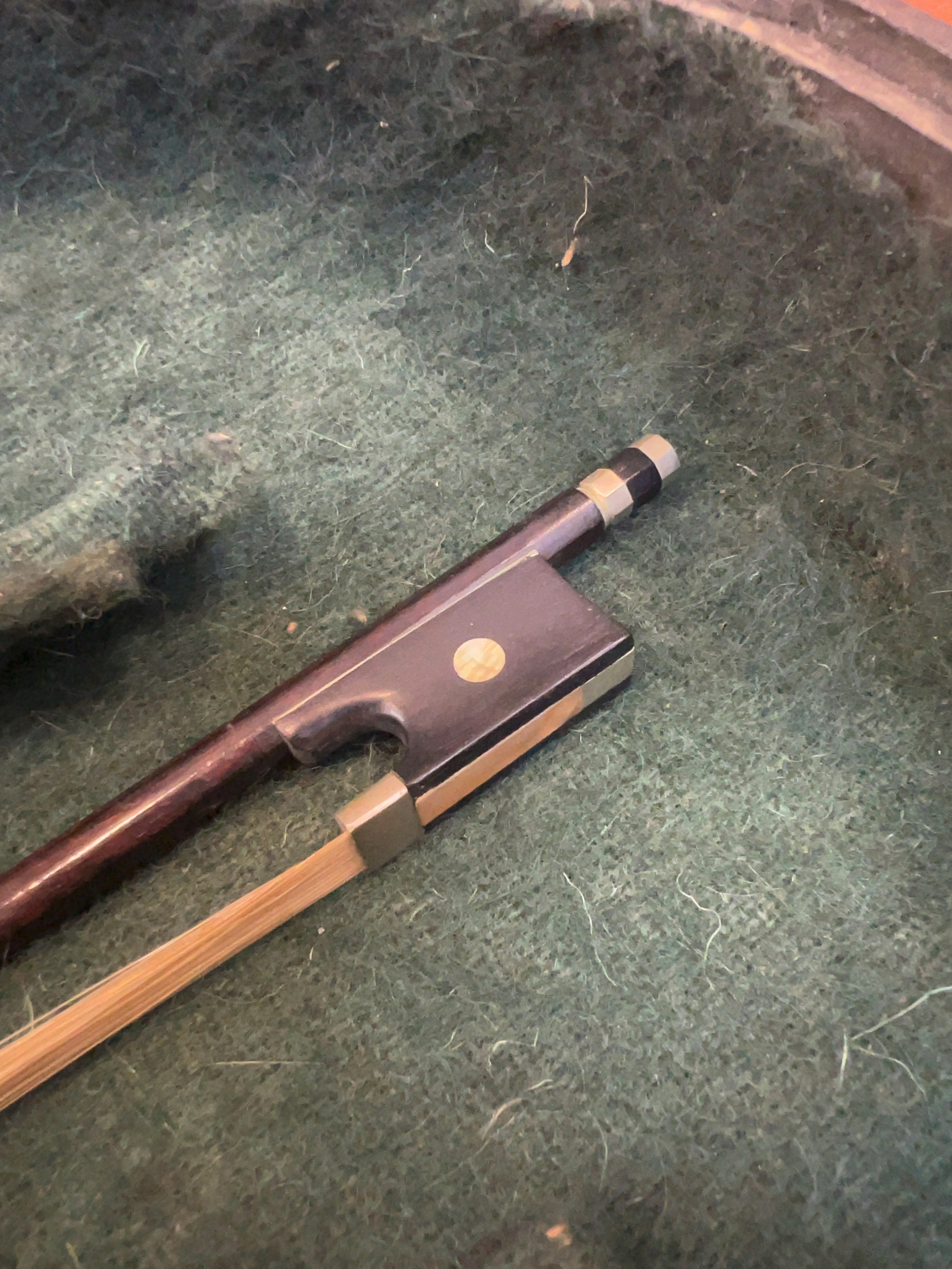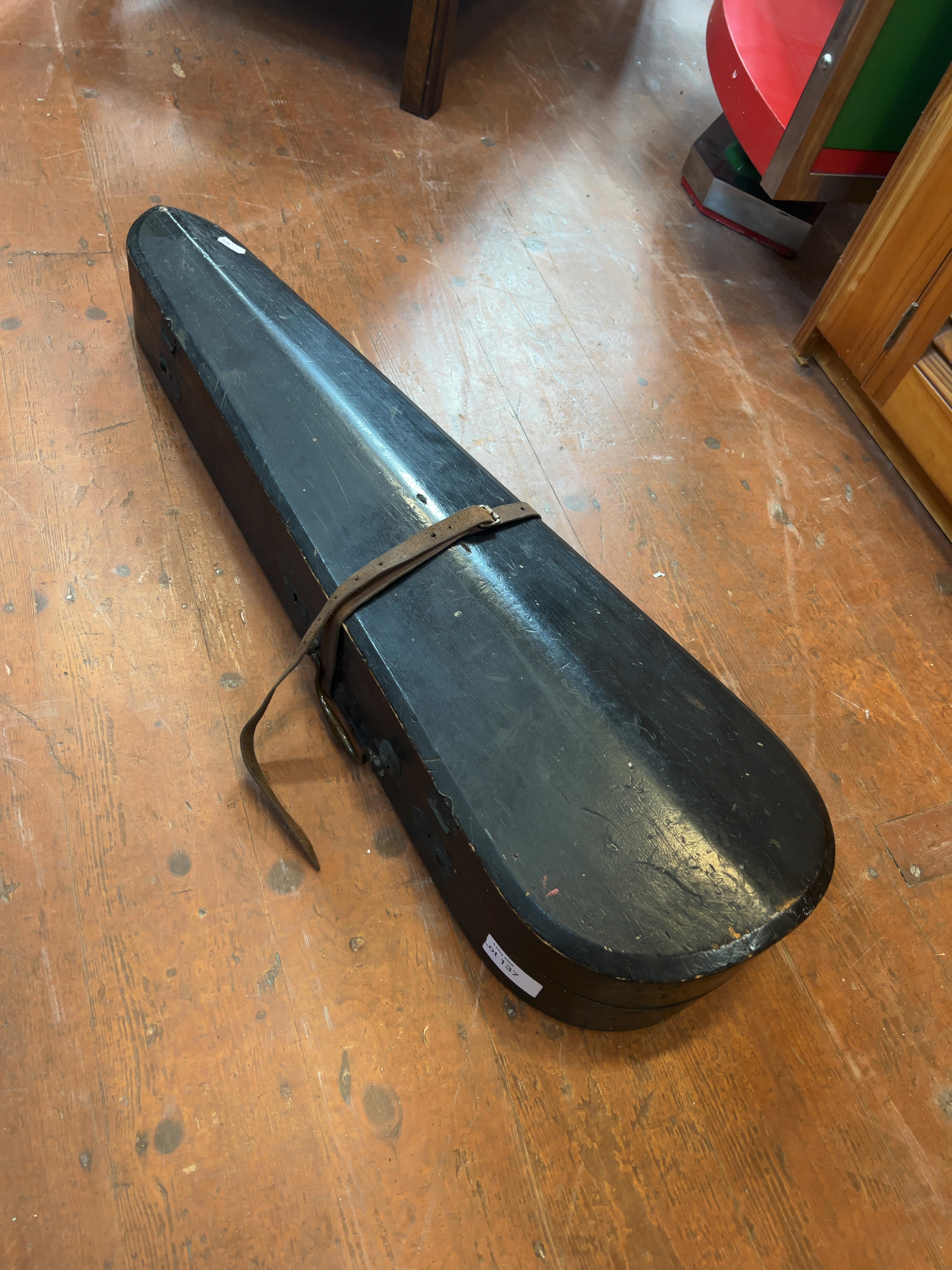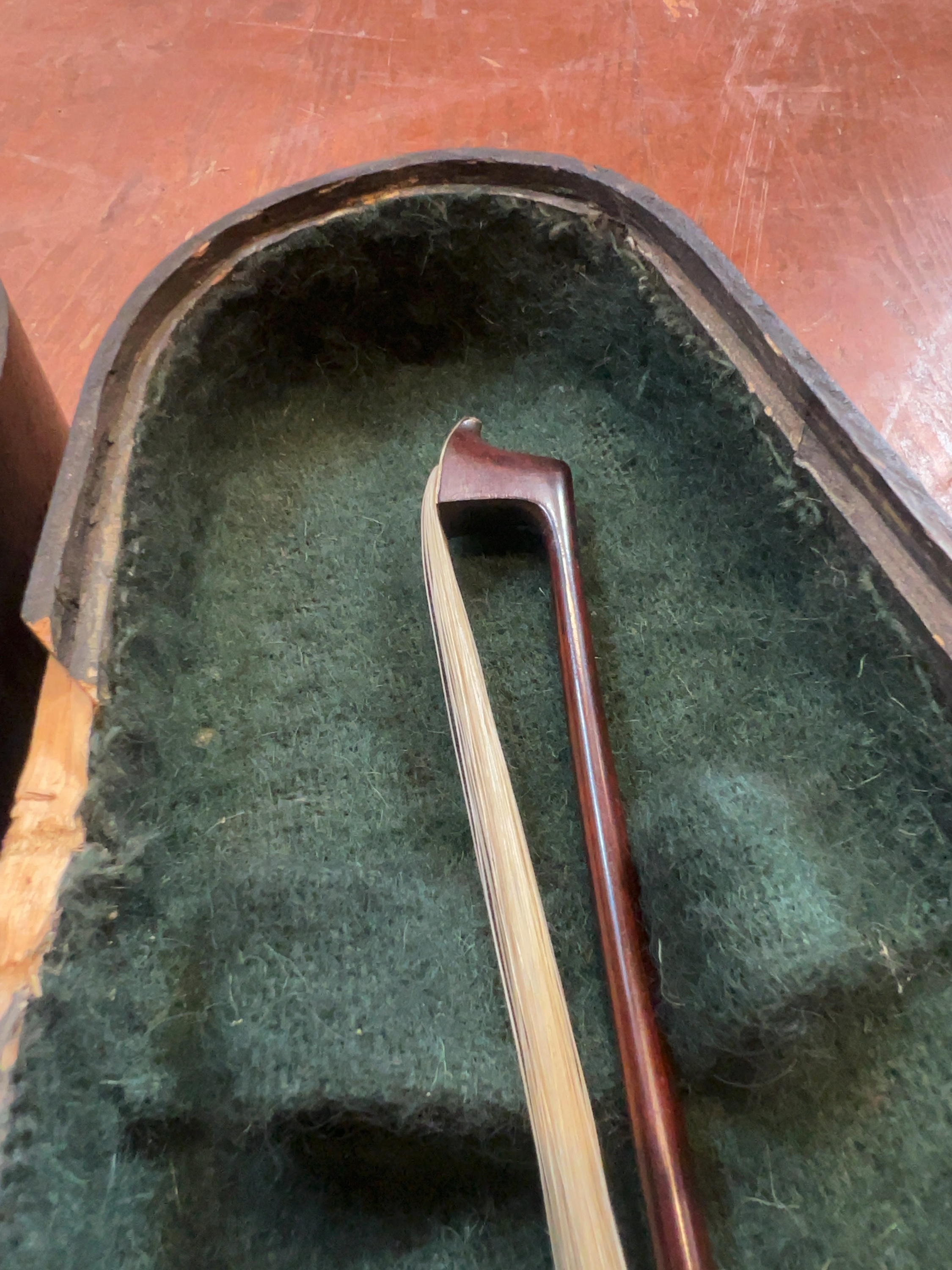 The instrument is offered in as found condition and requires professional restoration and setup. It is currently disassembled; the bridge, tailpiece, and pegs are detached but present. The strings are loose and tangled. The varnish exhibits general age-related surface wear, scratches, and minor chipping to the edges. No significant cracks are immediately apparent. The bow hair is loose and requires replacement. The wooden case shows significant exterior wear and paint loss, and includes a worn leather securing strap.