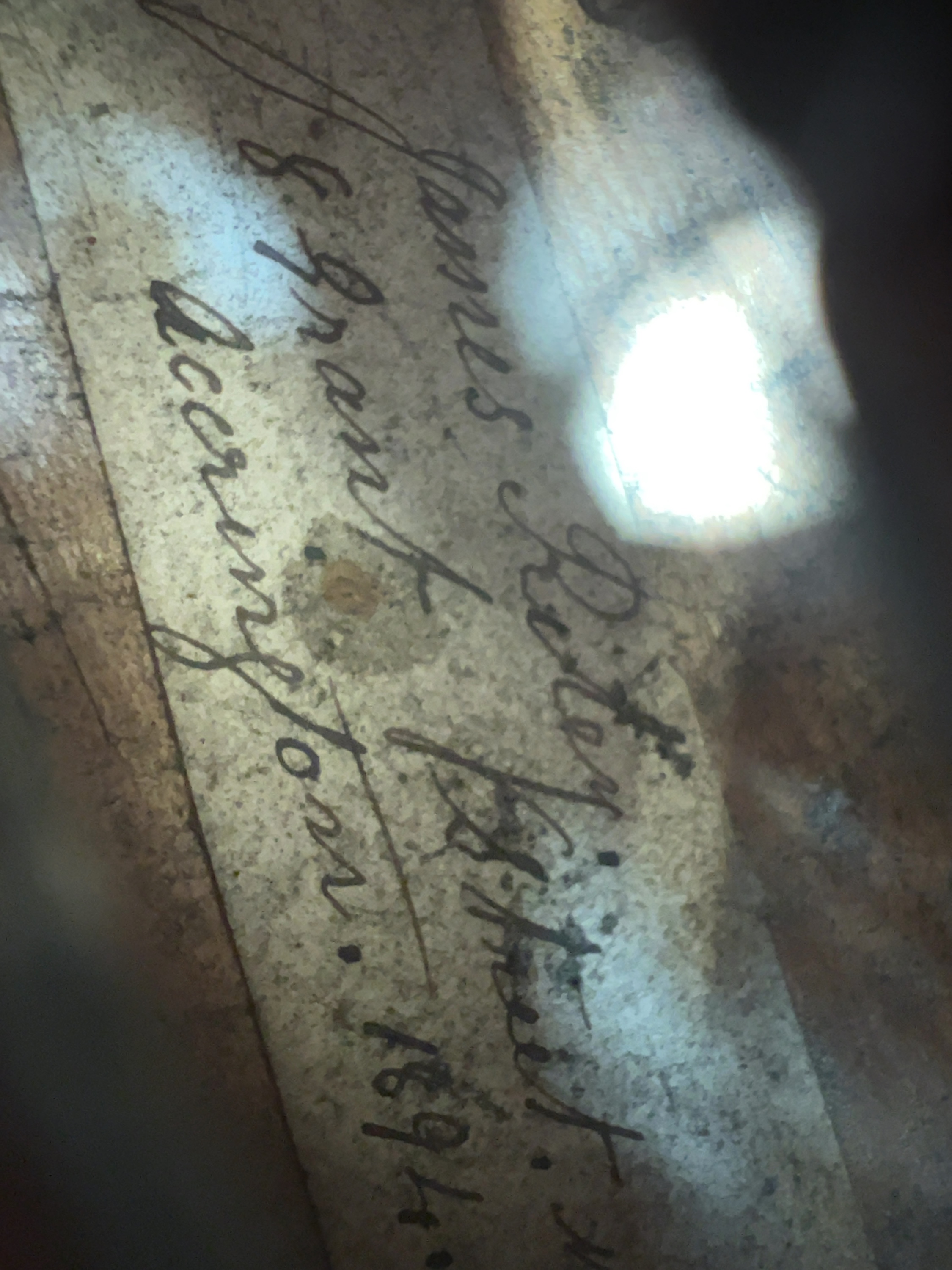 A late 19th-century English violin by the maker James Riley of Accrington, Lancashire. A handwritten interior label is visible through the f-hole, which reads: James Riley, 8 Grant Street, Accrington, 1894. The bow and antique black-painted wooden coffin-style case, the bridge, tailpiece, and pegs are currently detached and stored in the accessory pocket.