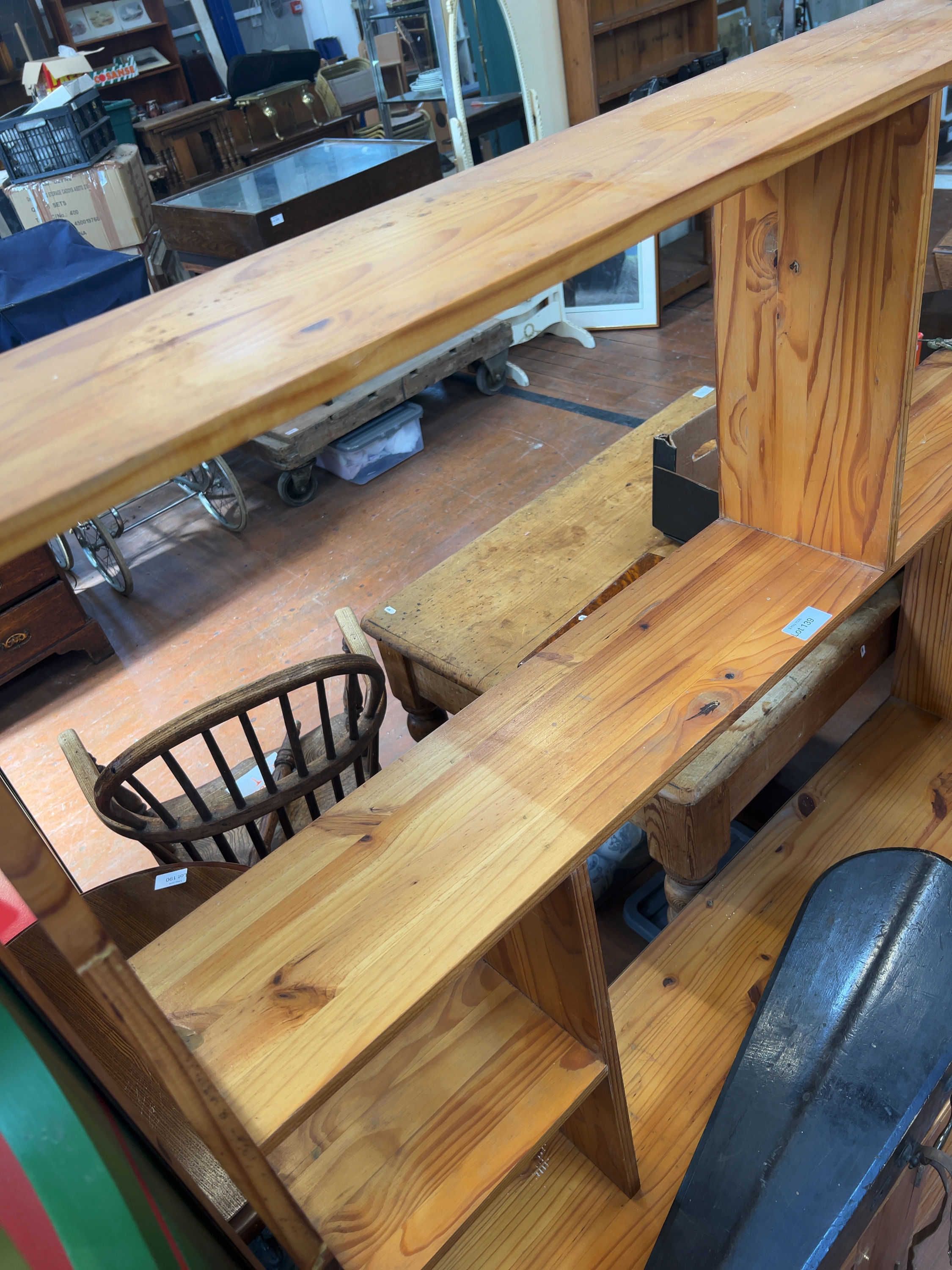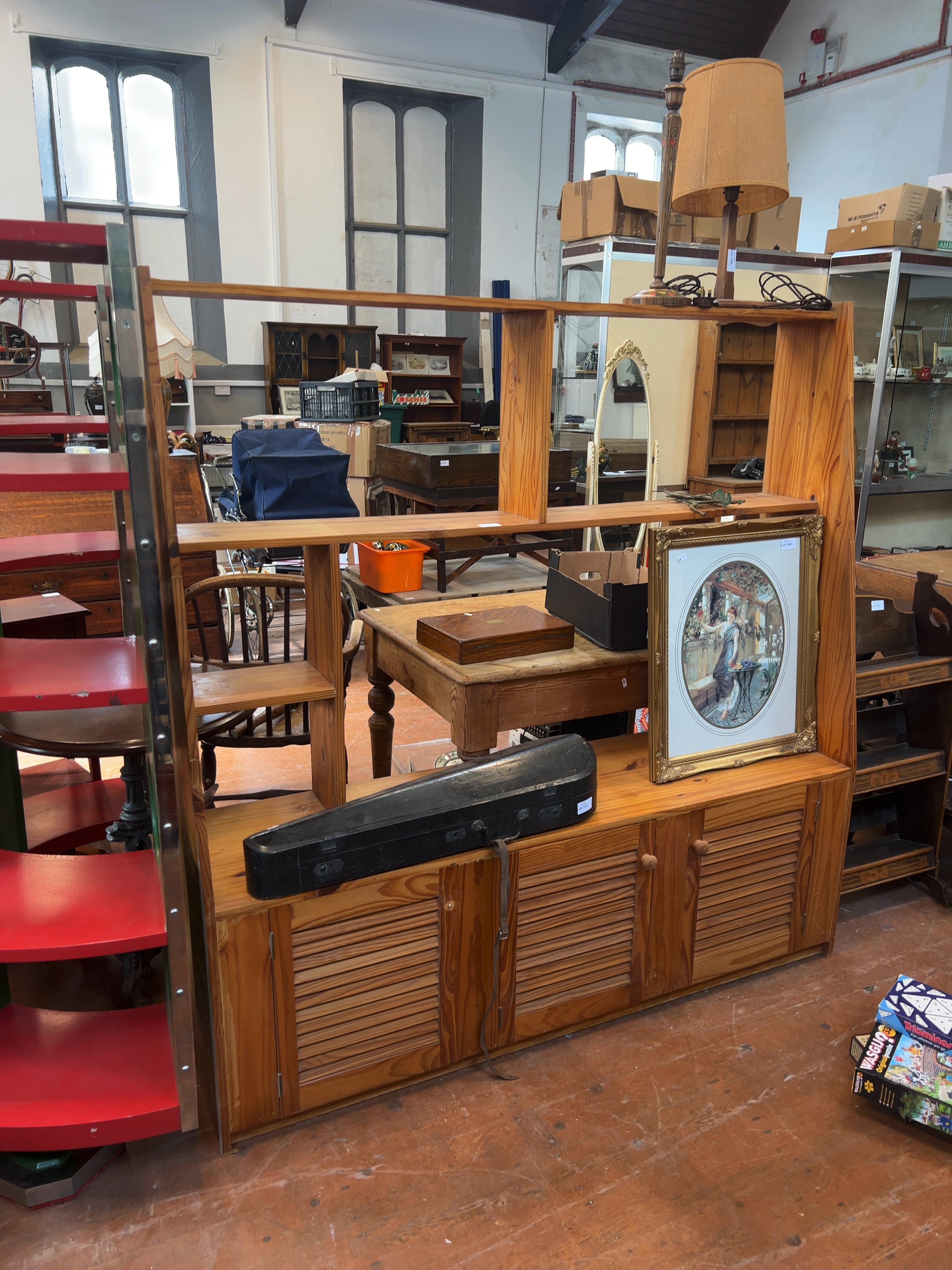 This late 20th-century storage unit is constructed from knotty pine and designed as a room divider, featuring an open-back construction to allow visibility from both sides. A small white rectangular label is present on the interior of the far-right cupboard door, though the characters are not clearly legible.