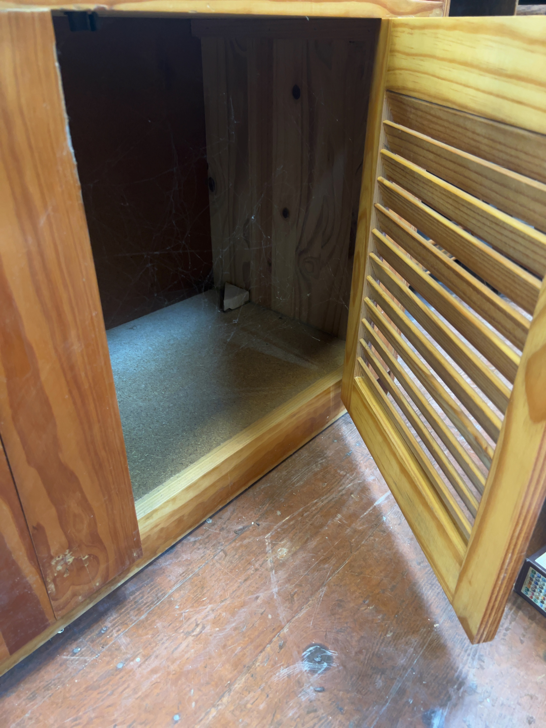 The unit is in used condition, exhibiting surface dust and minor wear consistent with age and environment. Cobwebs are present within the interior cupboard spaces.