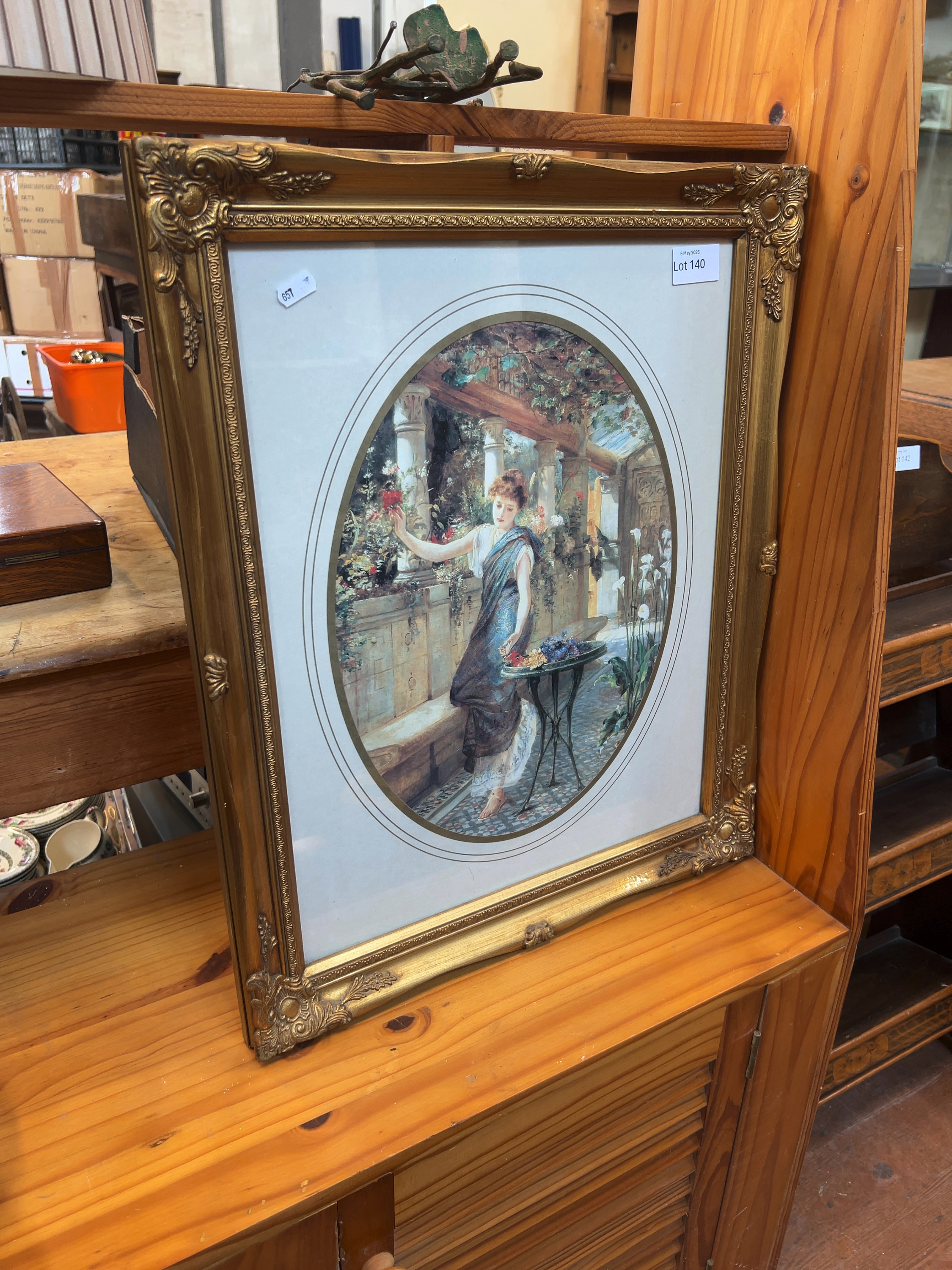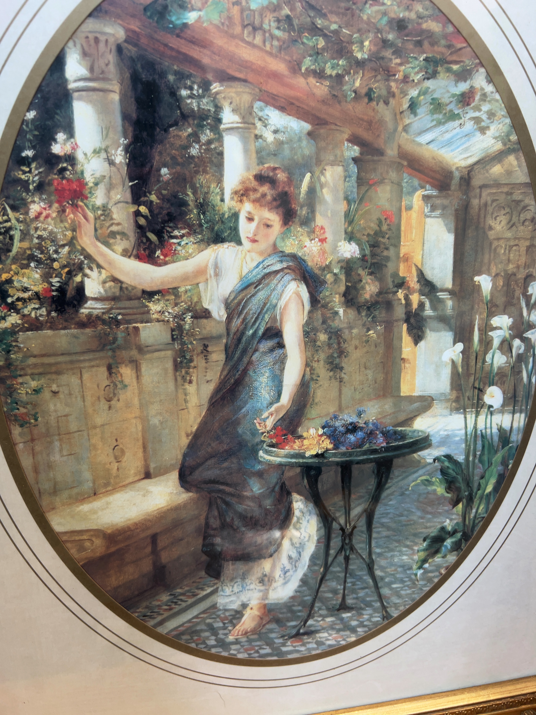 A framed print on paper after a Victorian Neoclassical painting. Presented within an oval mount and housed in a rectangular gilt-finished wood and composition frame. The frame features ornate acanthus leaf corner mouldings and a beaded inner border.