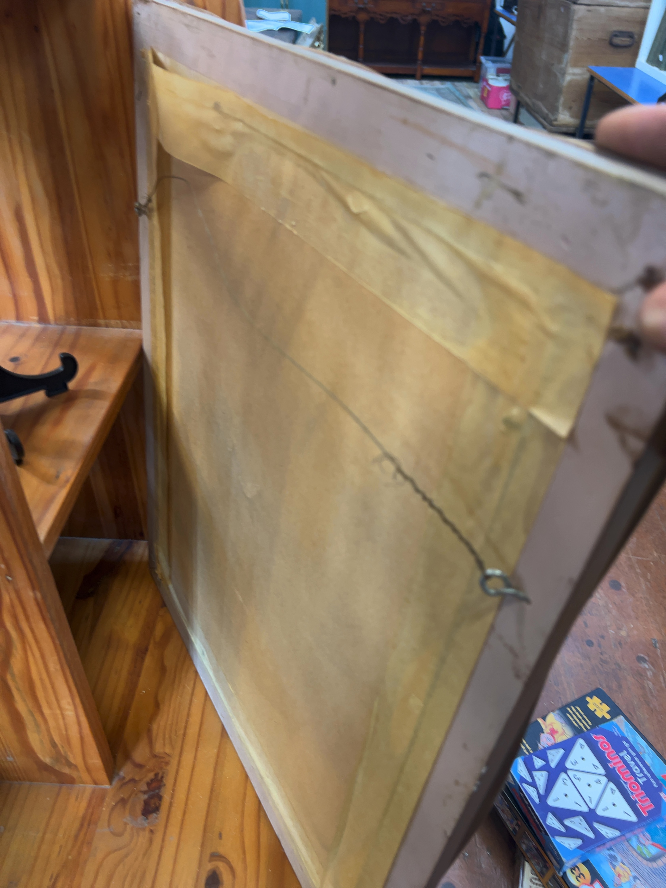 The frame shows minor age-appropriate wear, including small chips and losses to the gilded composition at the corners and edges. The print and mount appear stable behind the glass, though the paper backing on the reverse is brittle and shows some tearing.