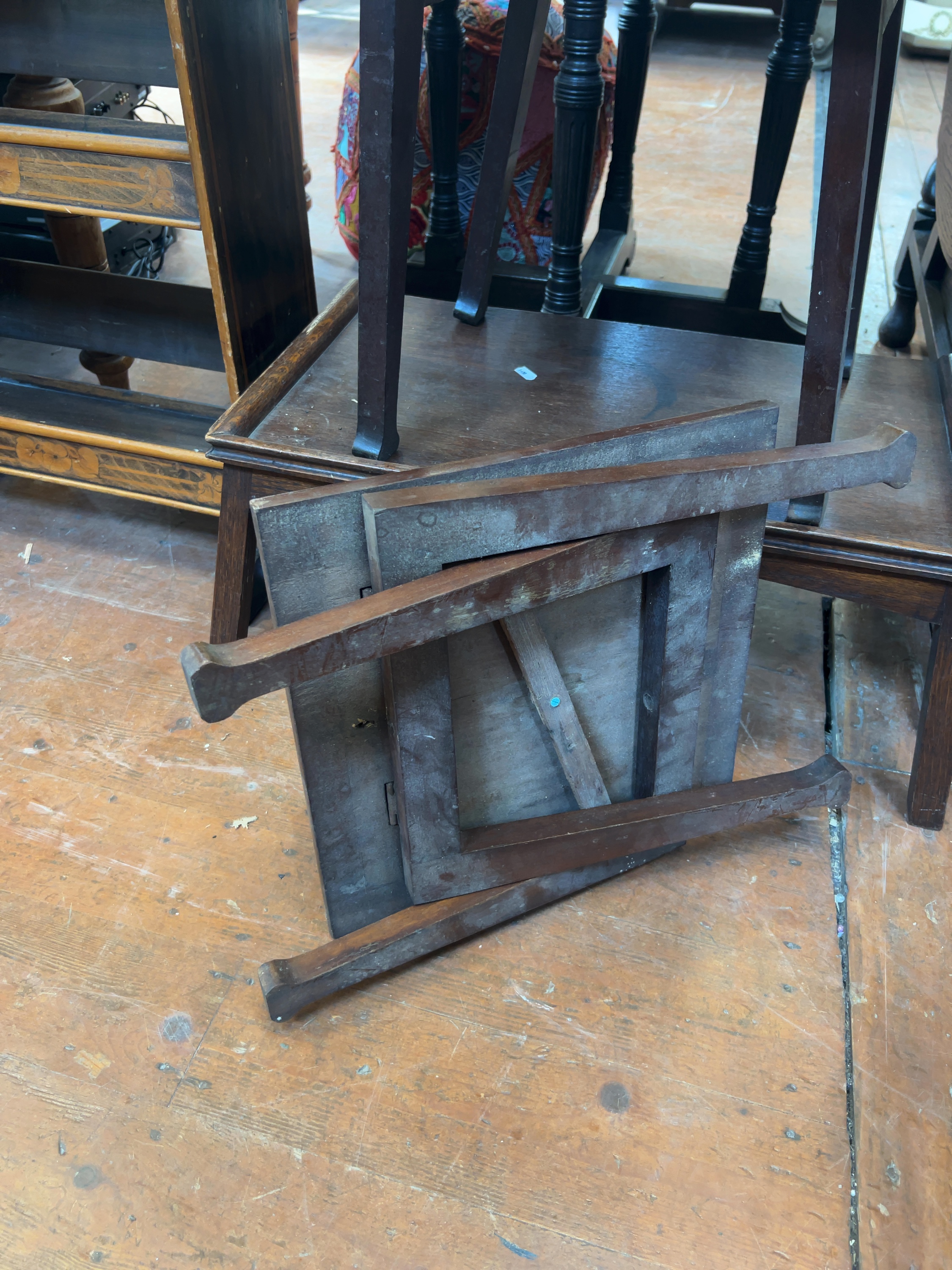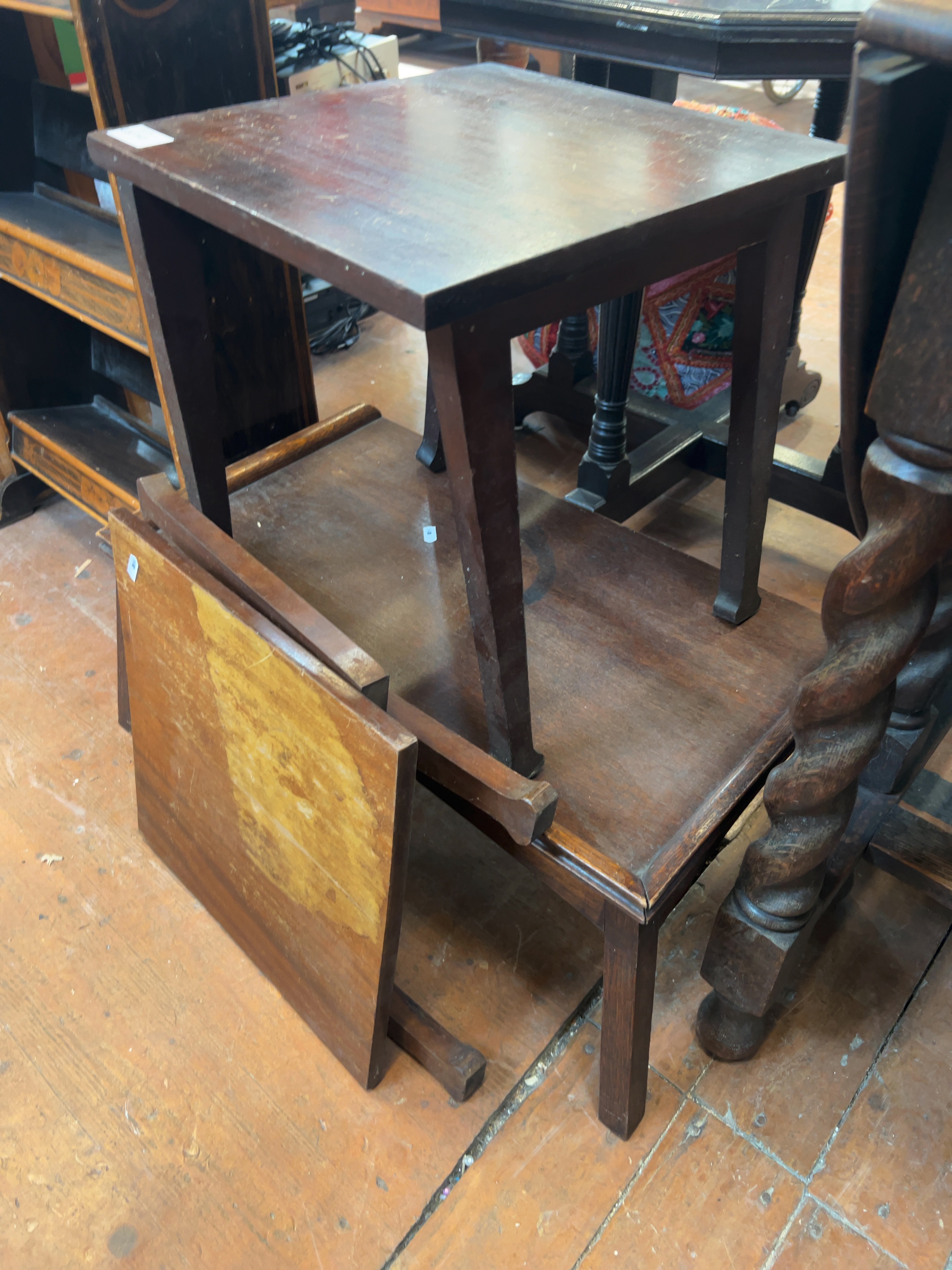 The tables are in a used, as found condition. Evidence of age and use includes surface scratches, minor scuffs to the legs, and various water or ring marks on the tops. The smallest table displays a notable area of fading and finish loss to the centre of its top. One table is currently disassembled or separate from the set.