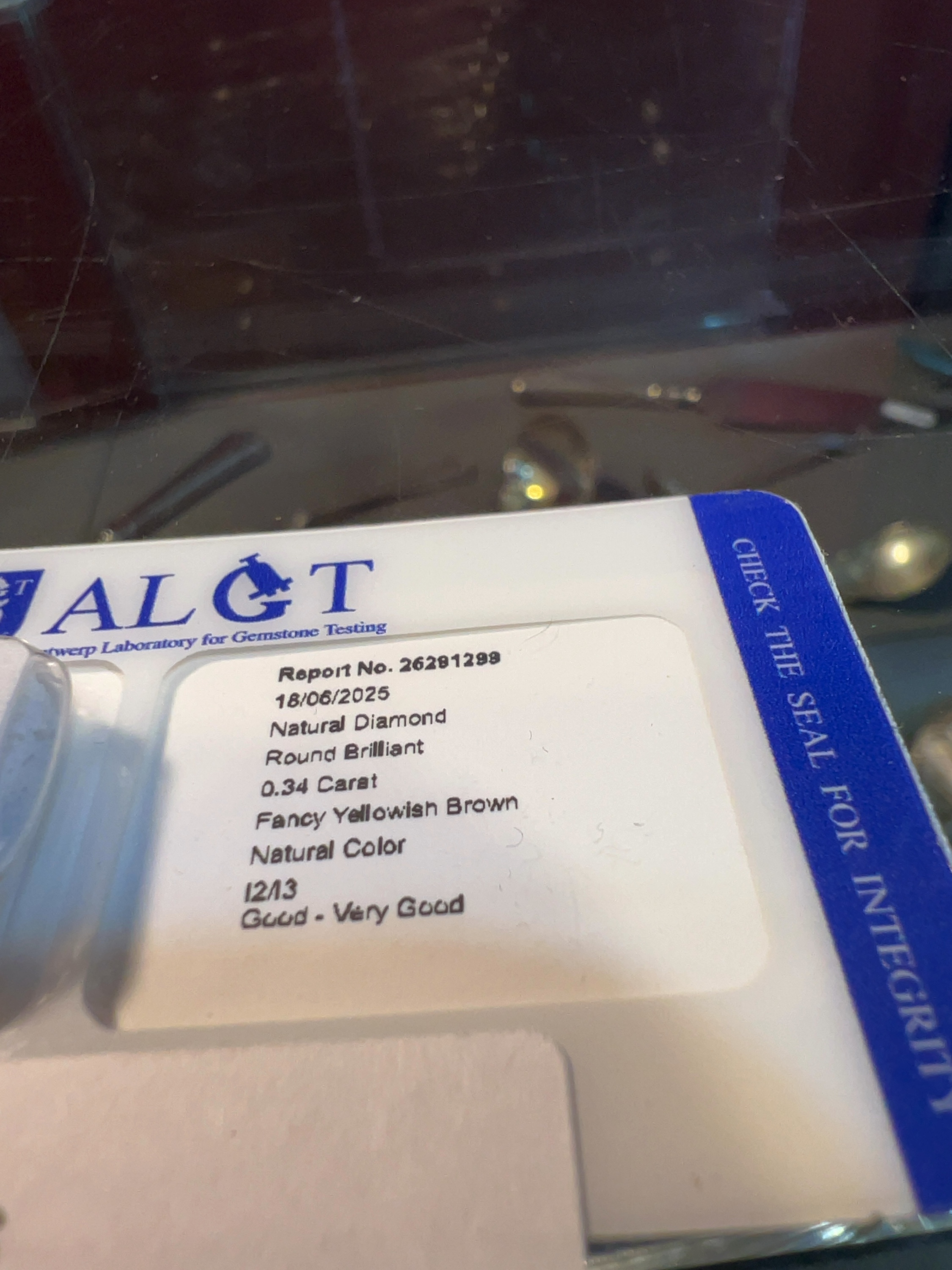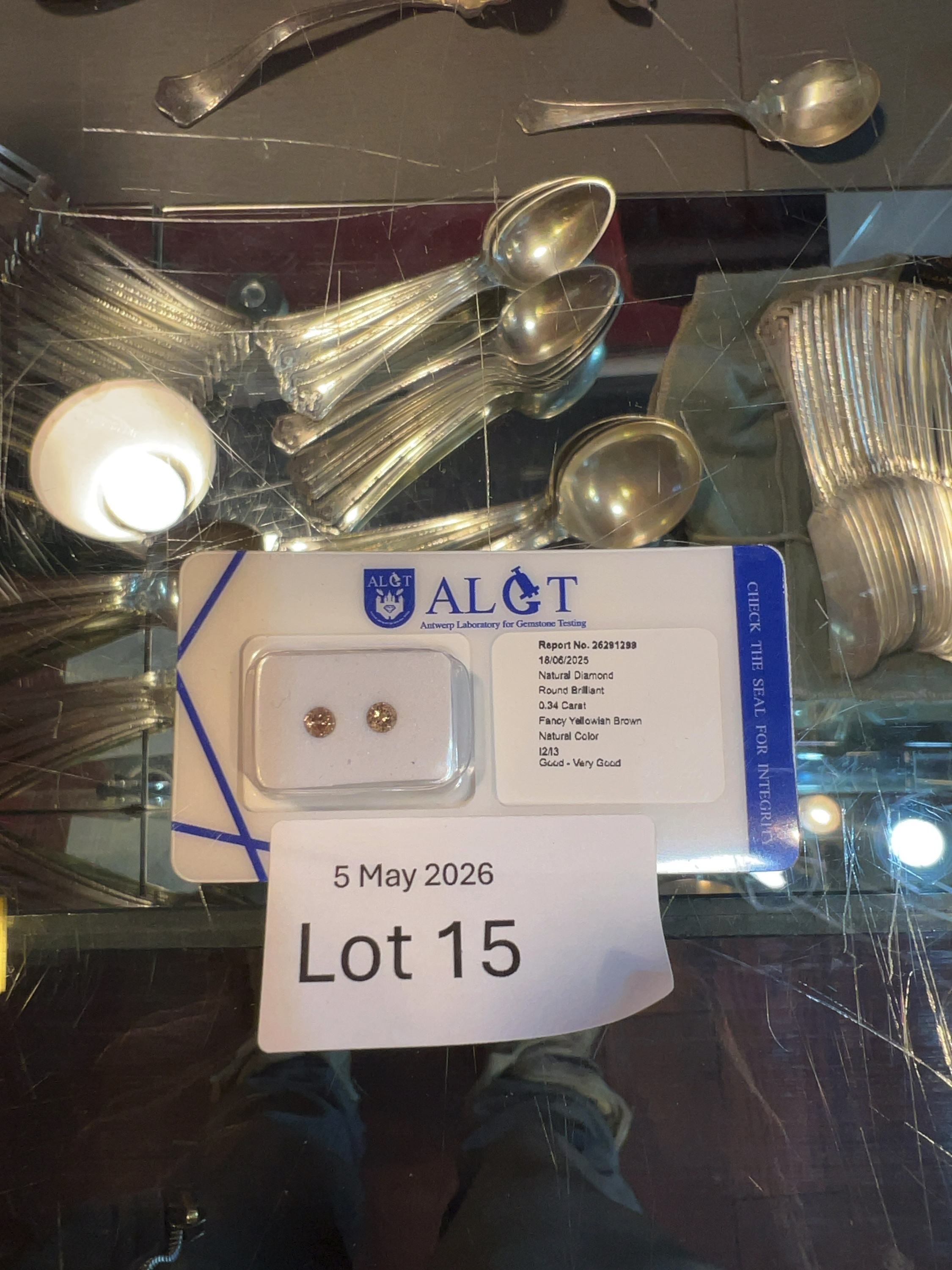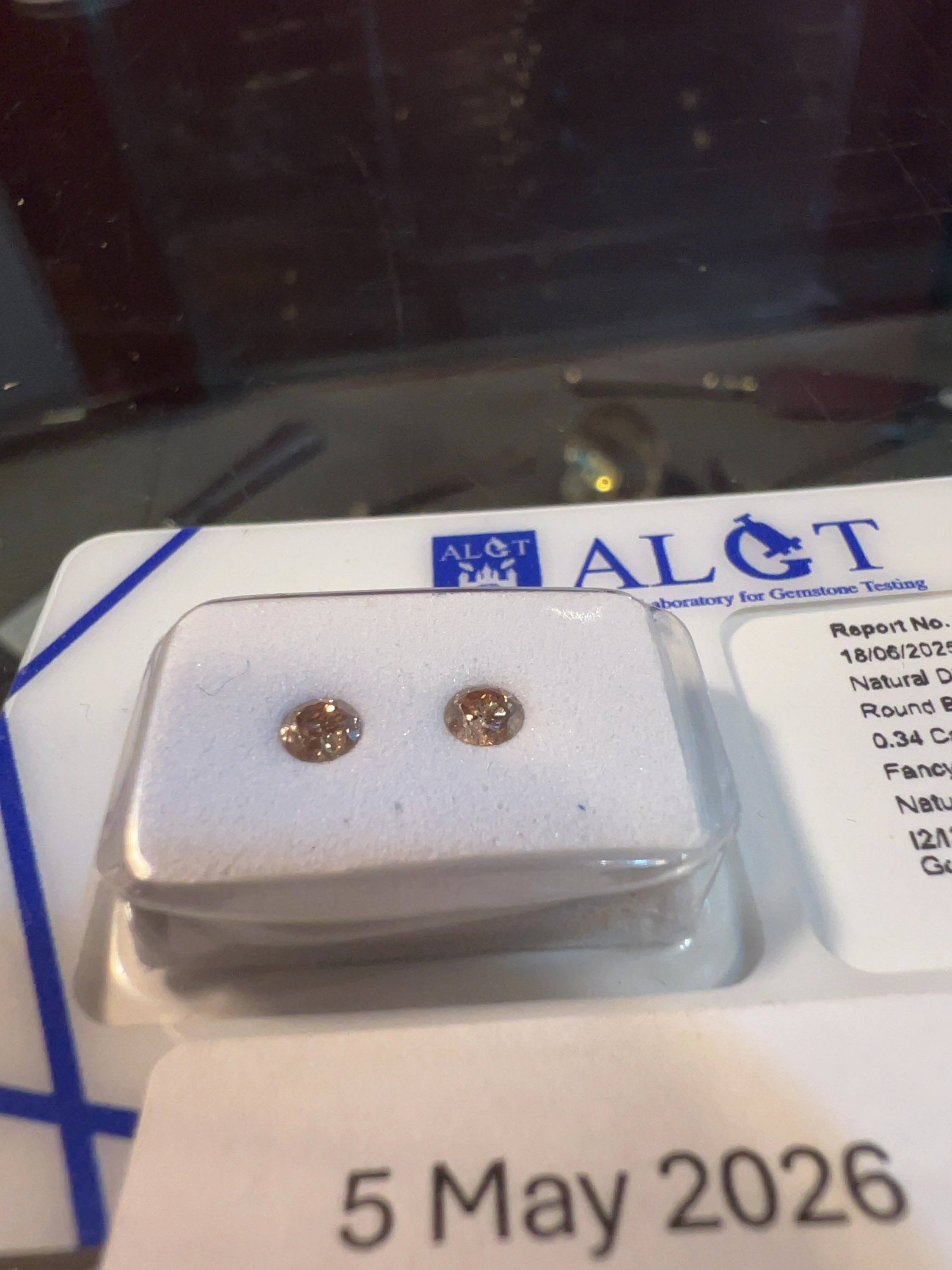 This lot comprises a pair of loose natural diamonds presented in a sealed Antwerp Laboratory for Gemstone Testing (ALGT) grading card. According to the included certification, both stones are round brilliant cut with a combined carat weight of 0.34 carats. The diamonds are graded as Fancy Yellowish Brown with a natural colour origin. Clarity for the pair is graded as I2/I3, and the cut grade is recorded as Good to Very Good. The stones are housed within a transparent blister pack. The laboratory card features the ALGT logo and report number 26291299, dated 18/06/2025.