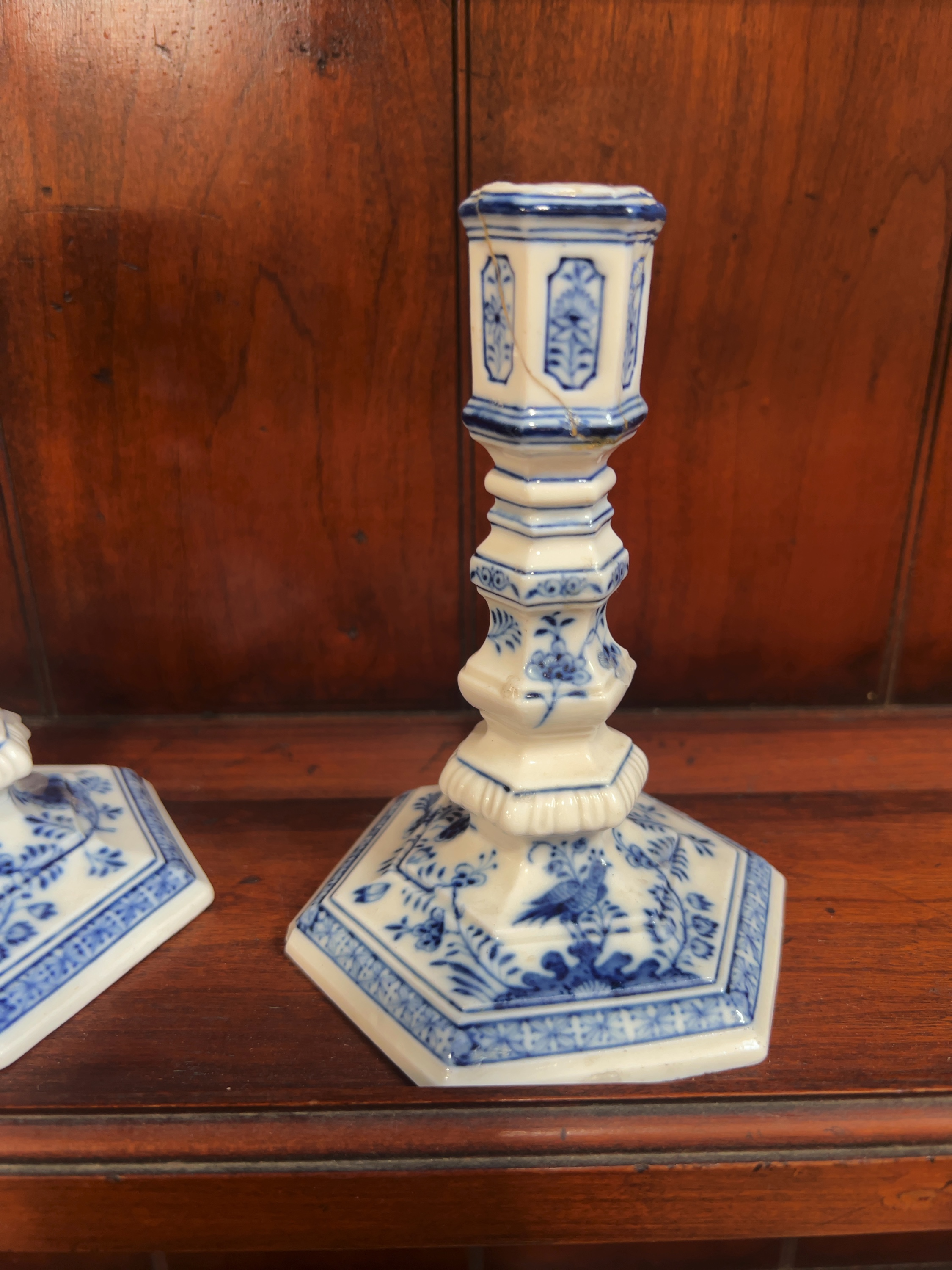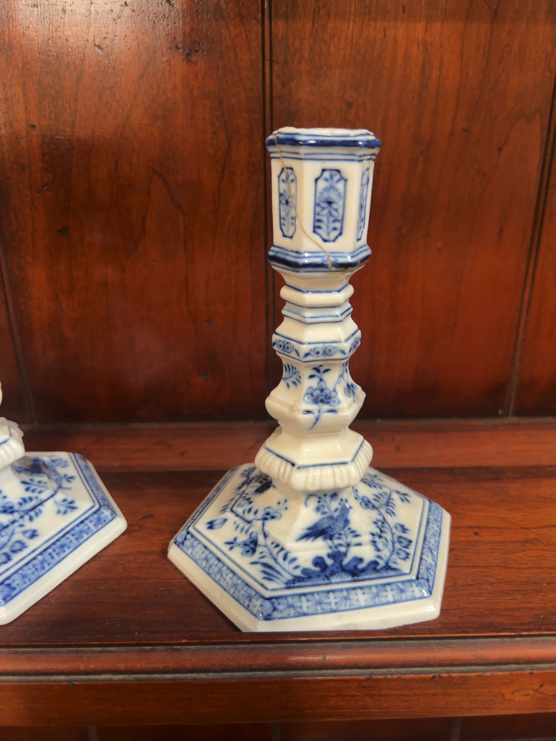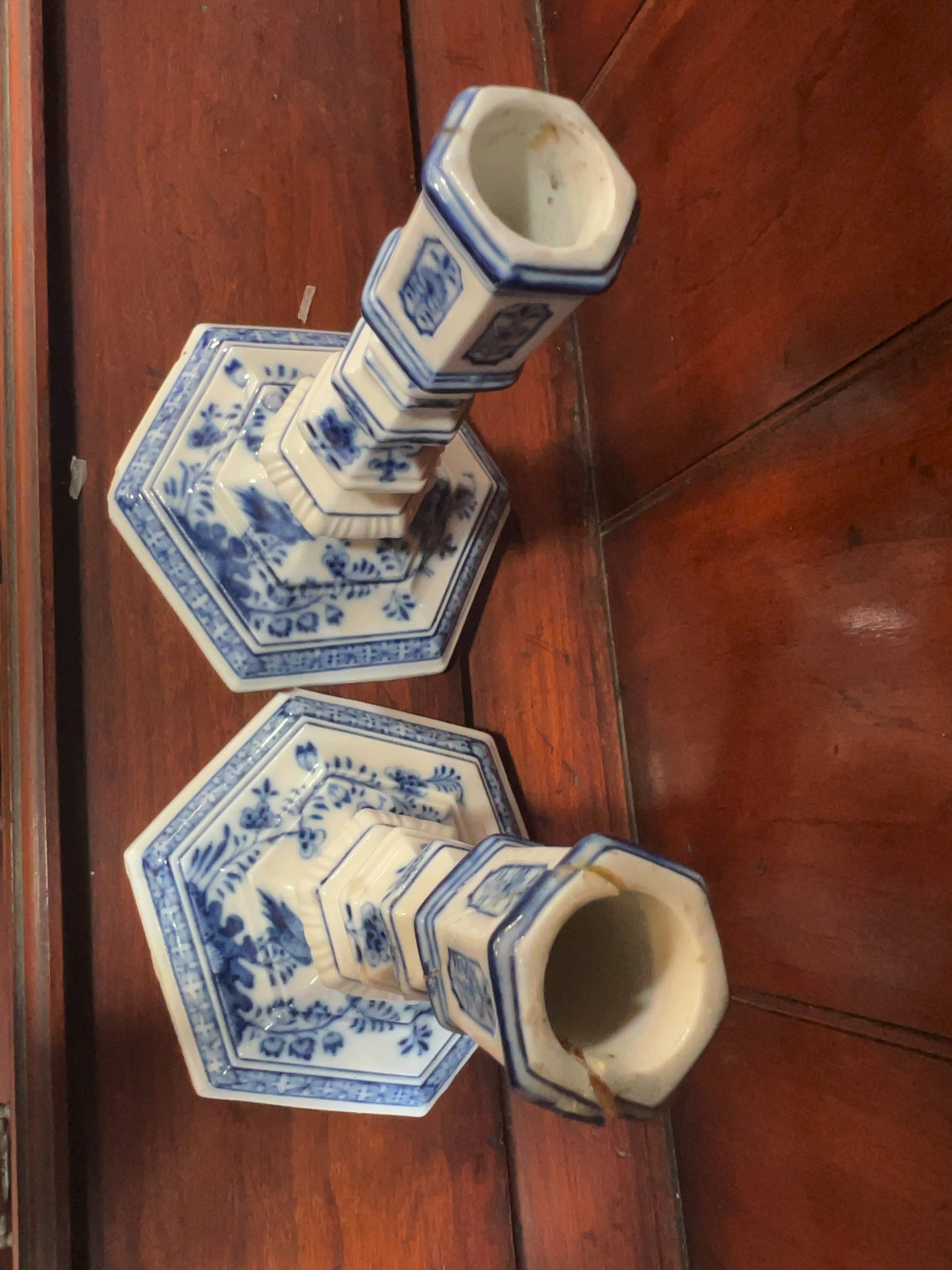 One candlestick has a significant vertical crack through the top hexagonal nozzle which shows signs of an old glue repair. Both candlesticks exhibit small chips and nibbles to the sharp edges of the hexagonal bases. There is general surface wear throughout, and the unglazed footrims show an accumulation of dirt and minor kiln grit from the firing process.
