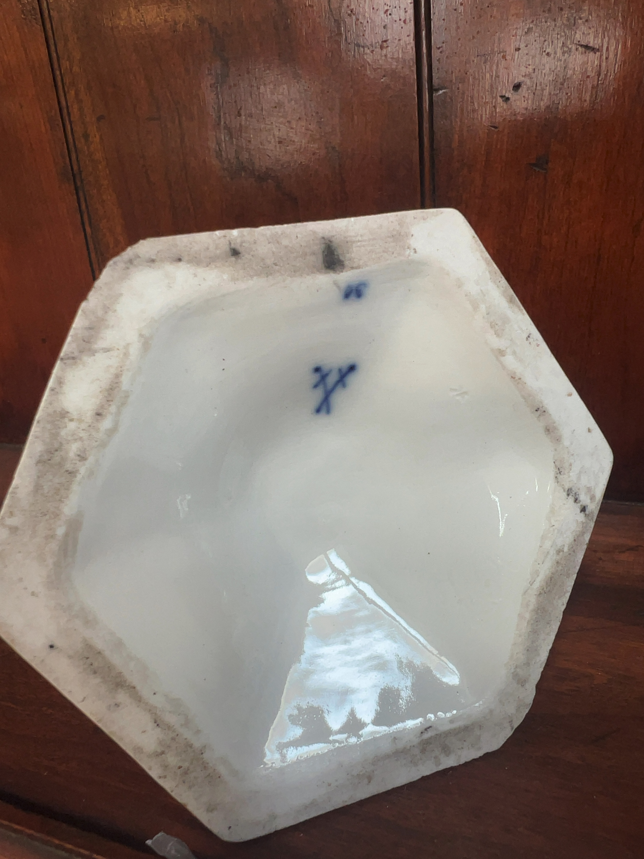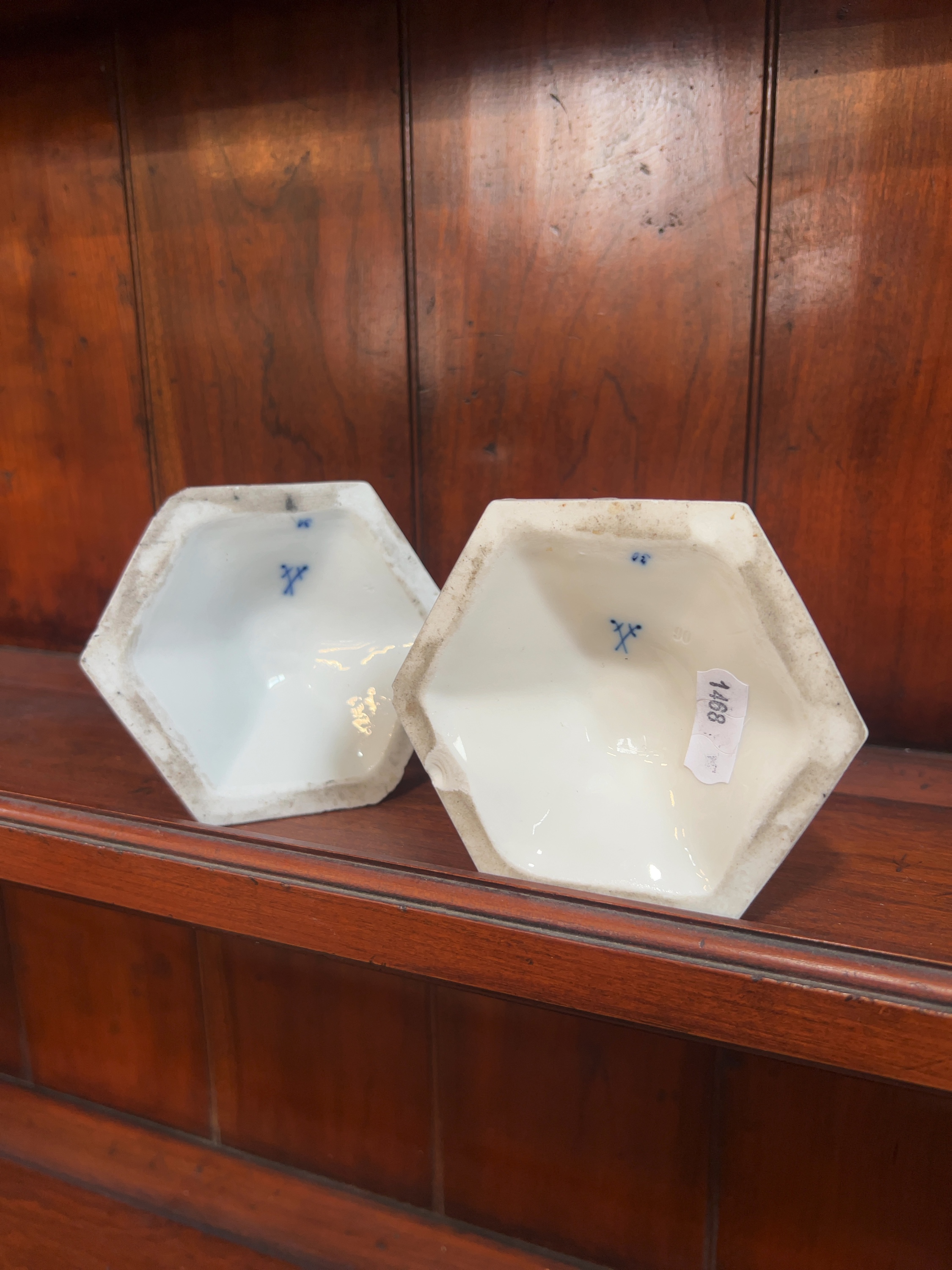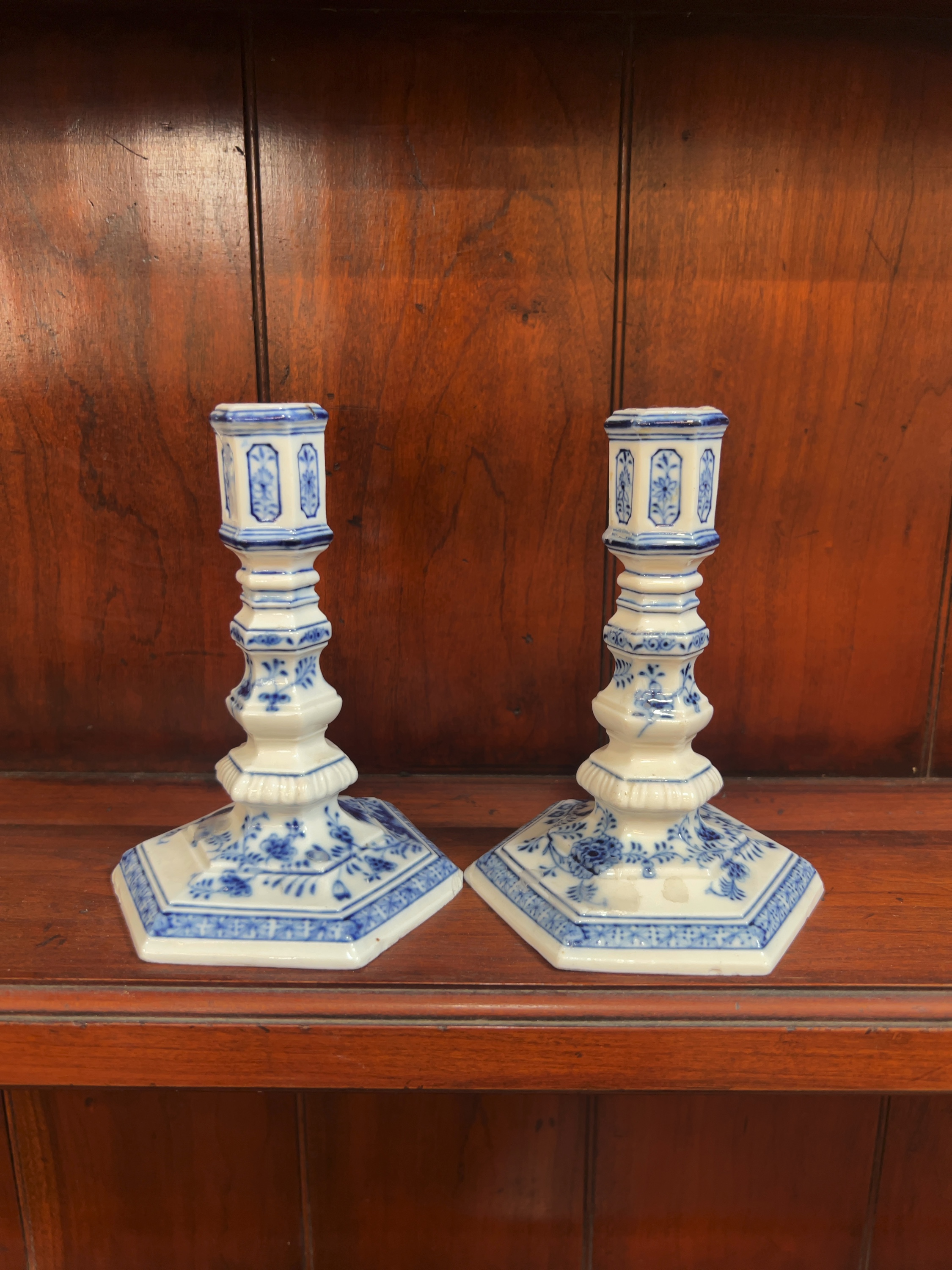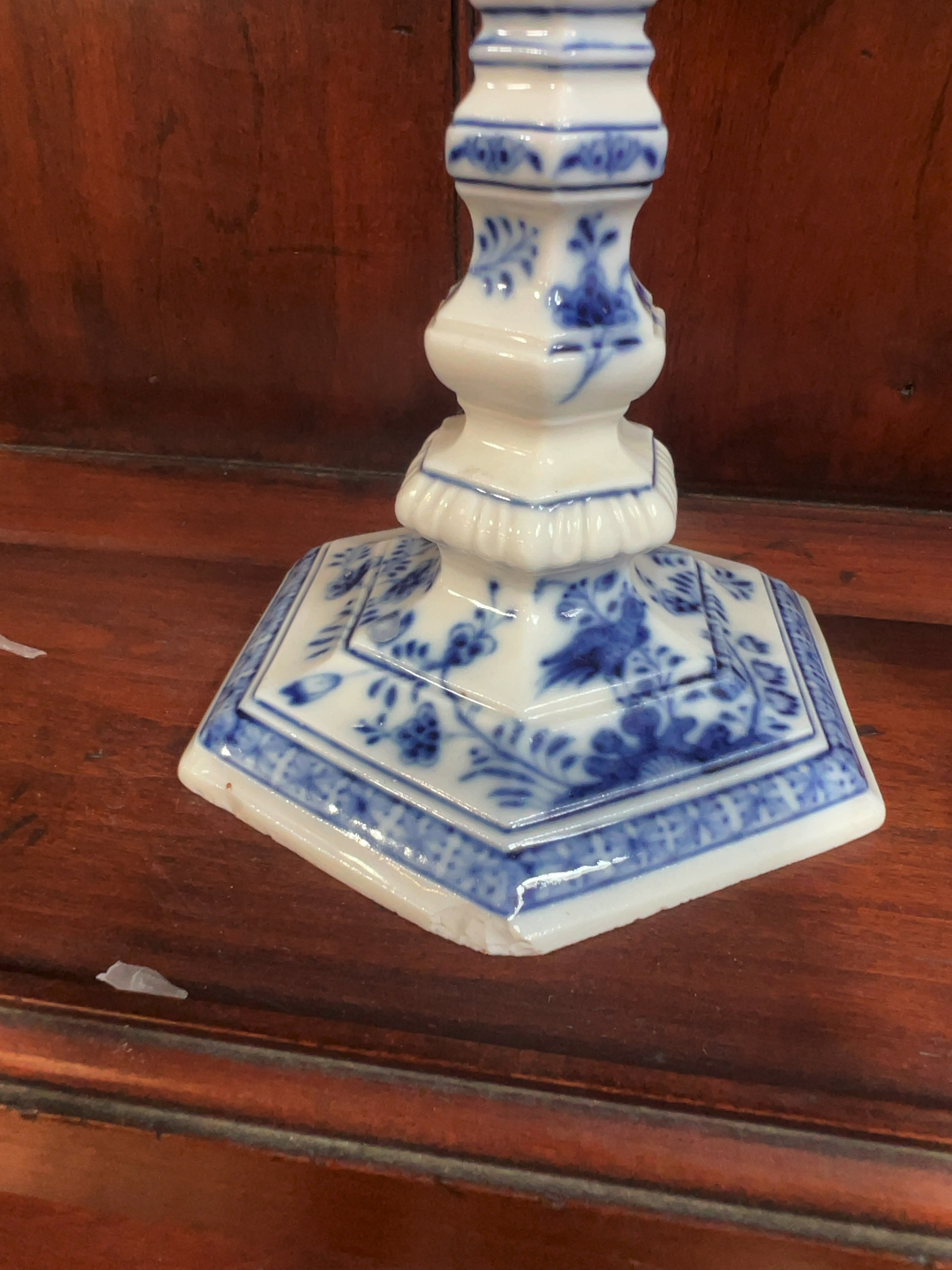 One candlestick has a significant vertical crack through the top hexagonal nozzle which shows signs of an old glue repair. Both candlesticks exhibit small chips and nibbles to the sharp edges of the hexagonal bases. There is general surface wear throughout, and the unglazed footrims show an accumulation of dirt and minor kiln grit from the firing process.