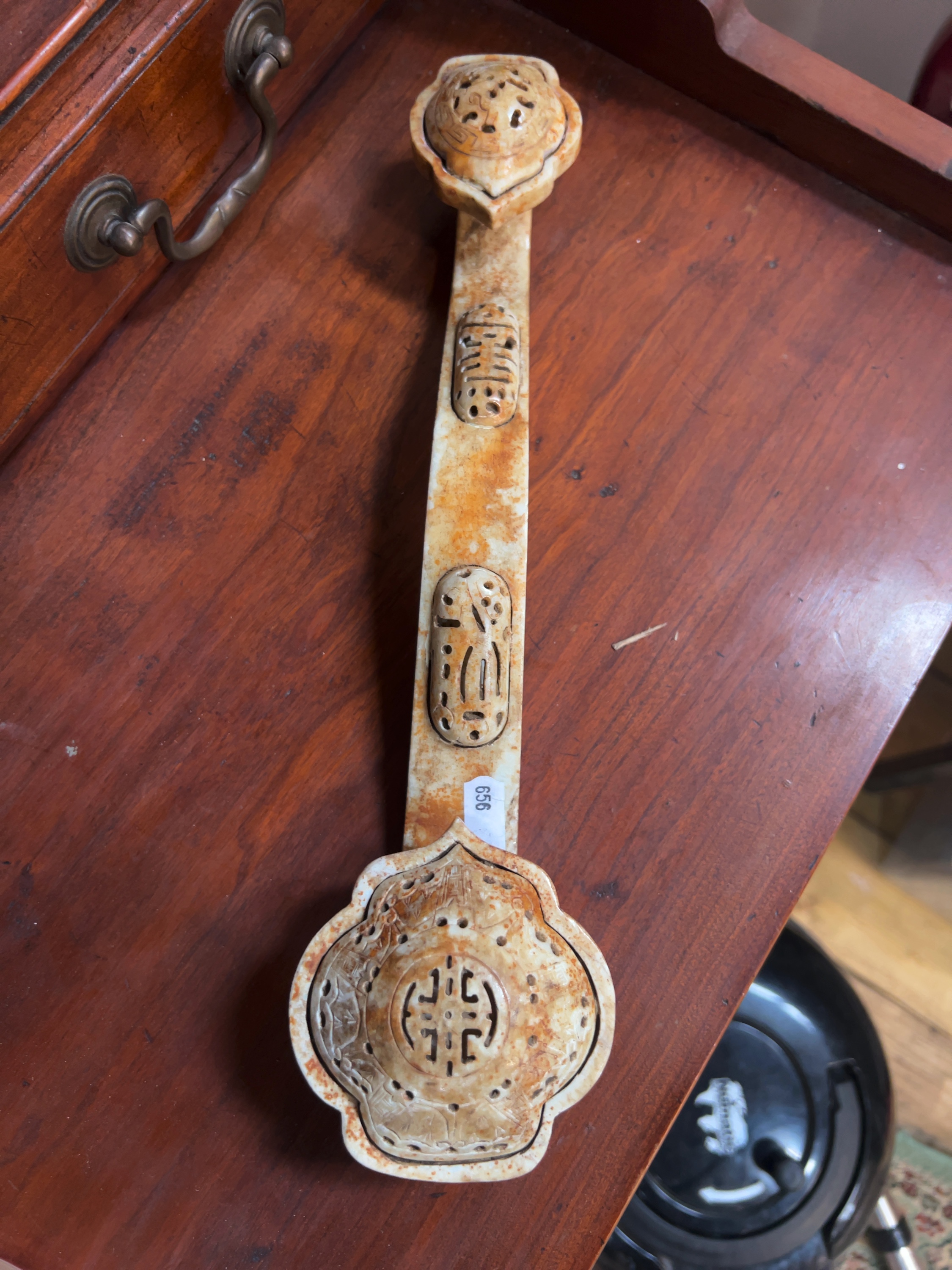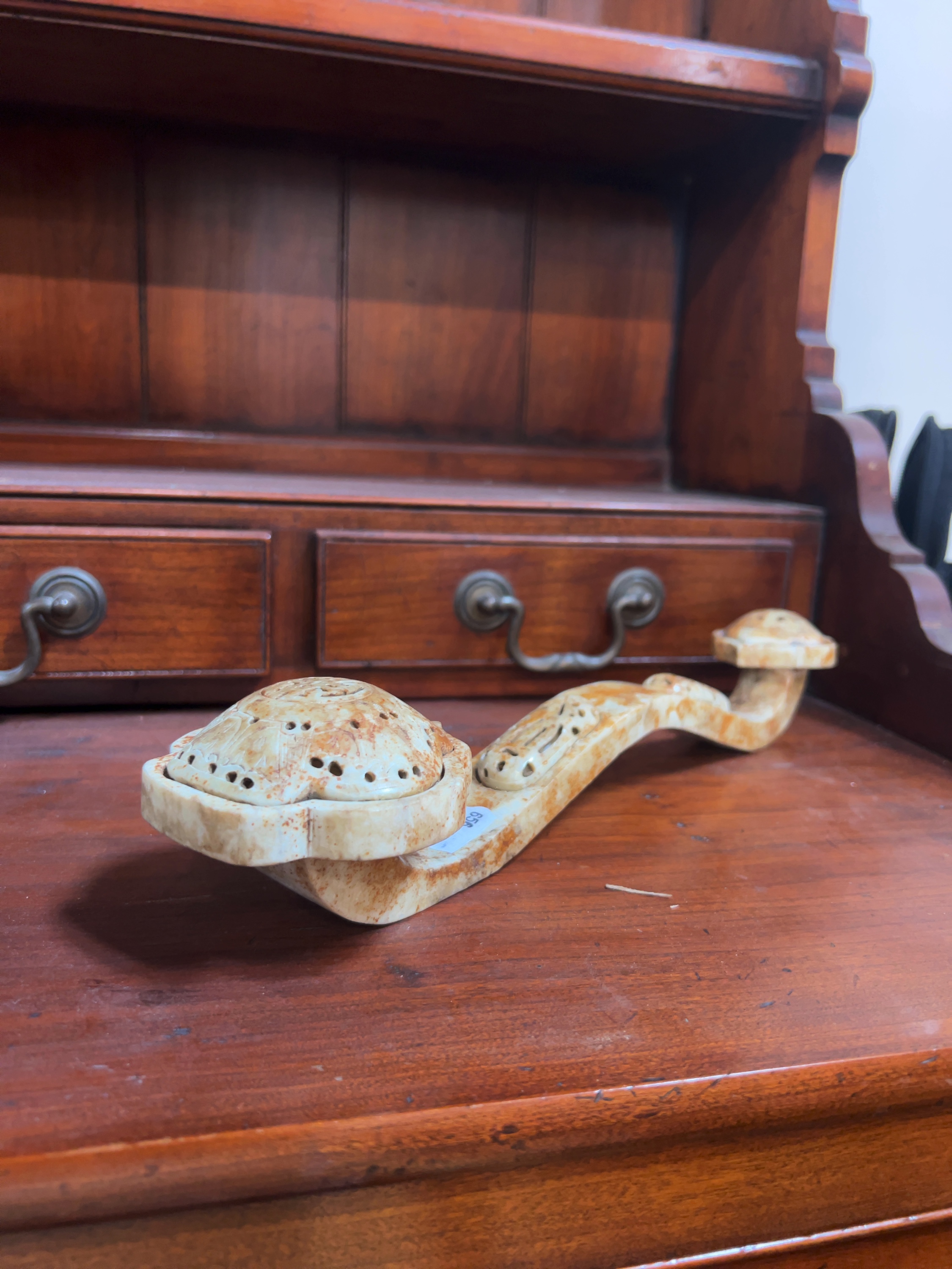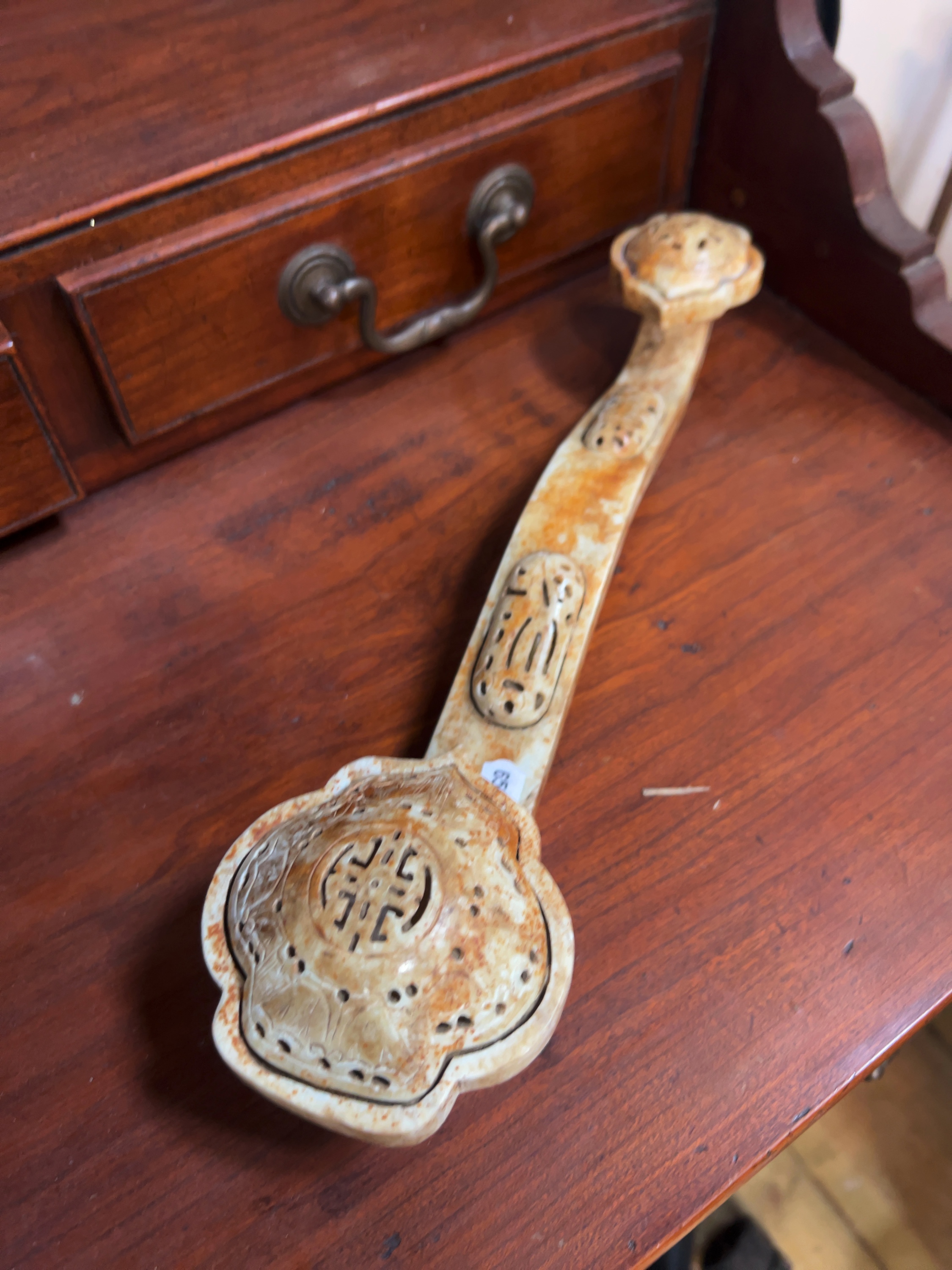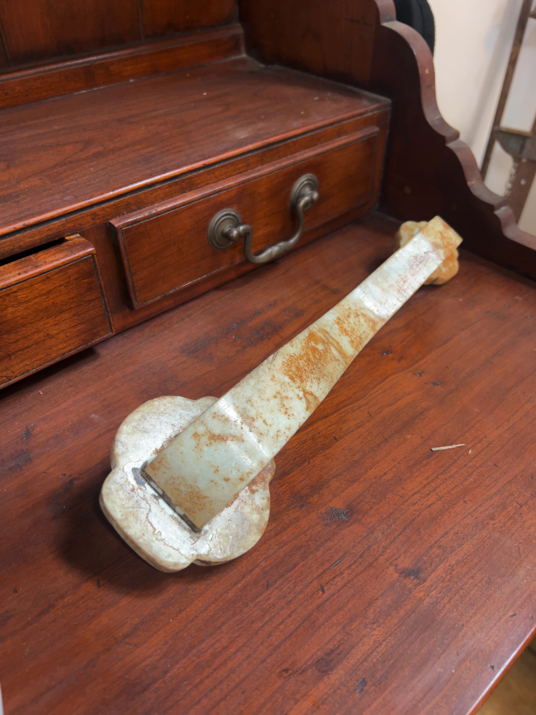 The sceptre appears to be in good overall condition. There are no obvious chips, cracks, or signs of restoration visible. The mottled reddish-brown coloration is a deliberate feature of the archaistic design rather than damage. Minor surface dust is present within the recessed areas of the carving.