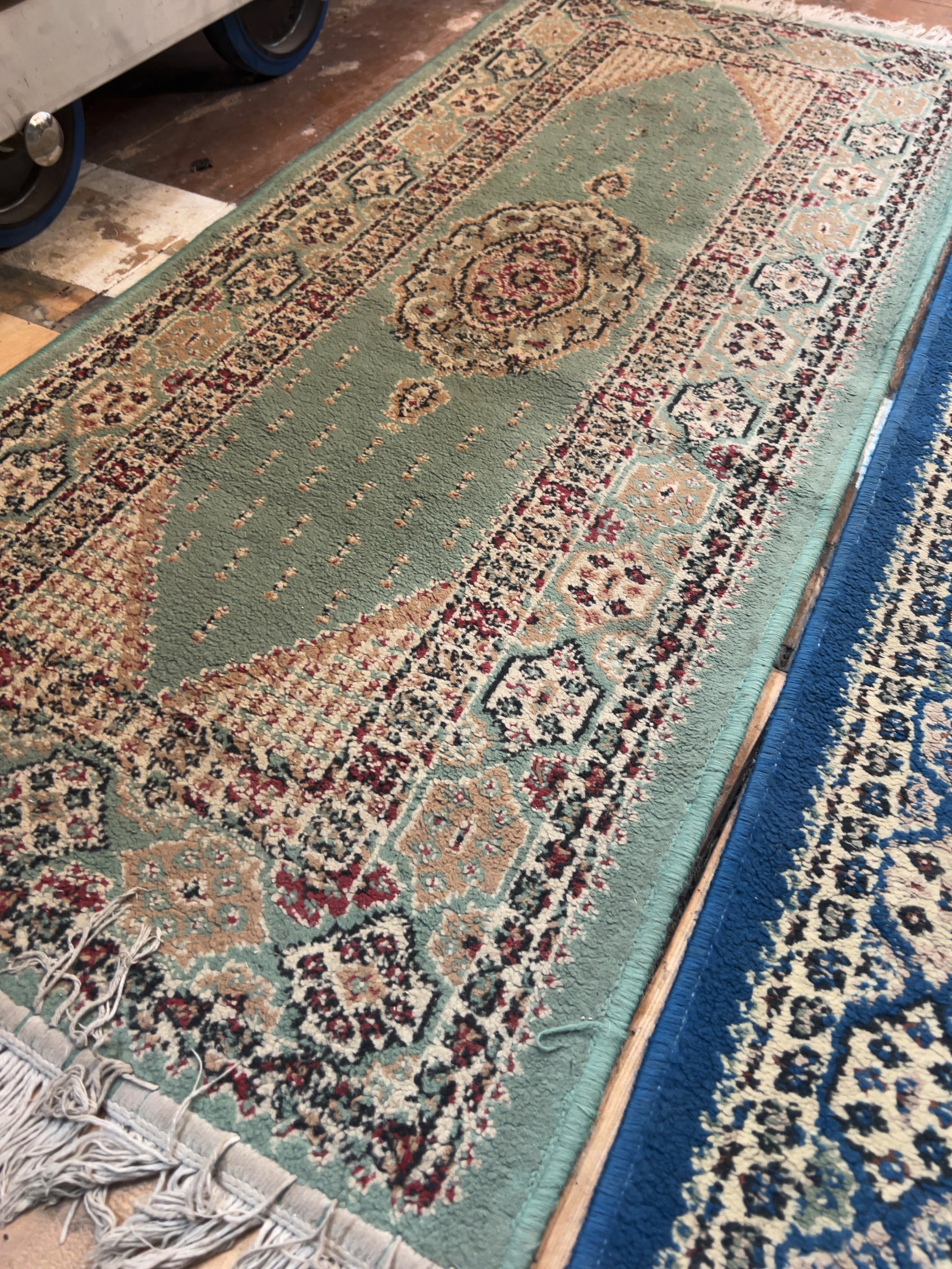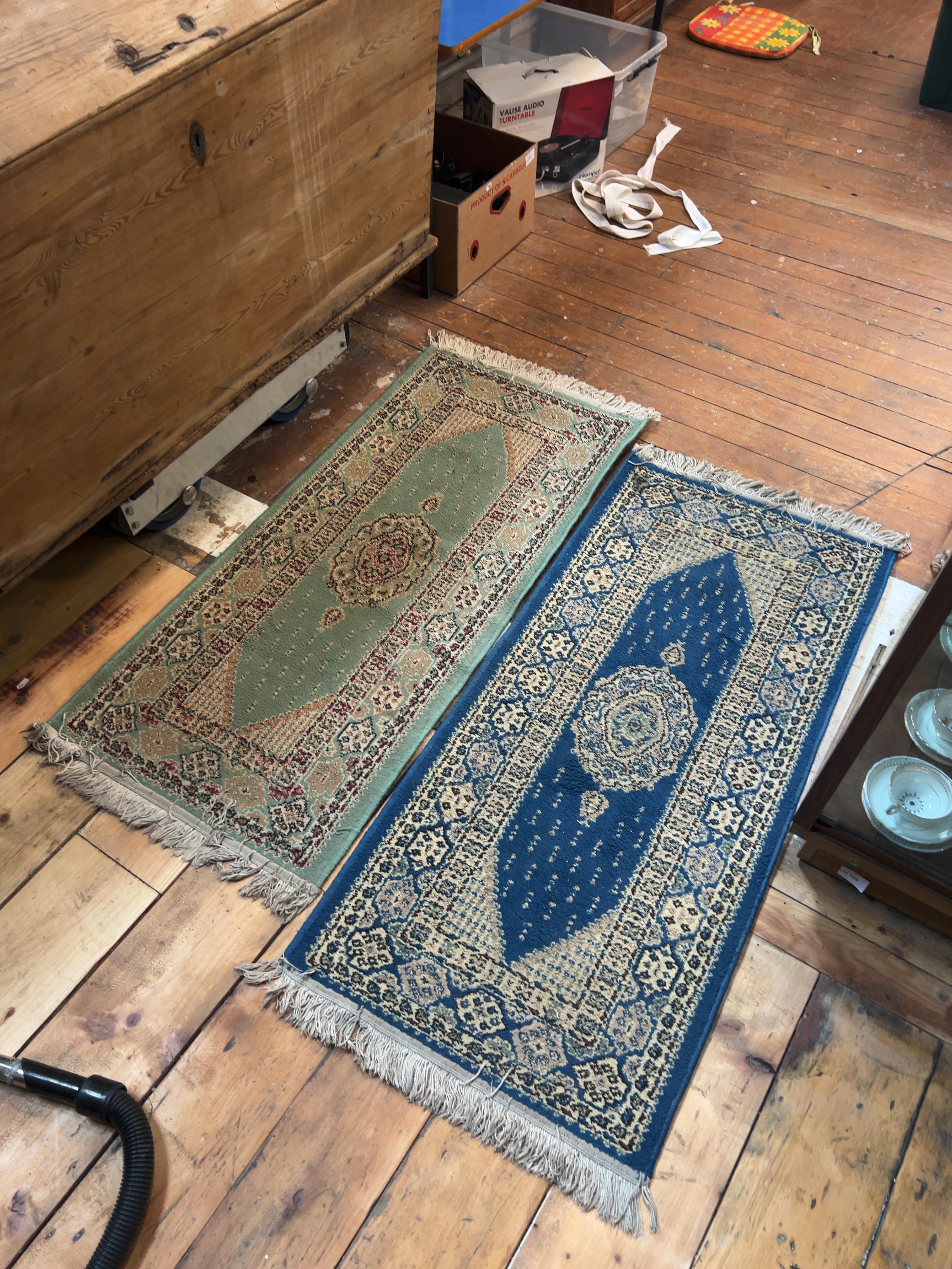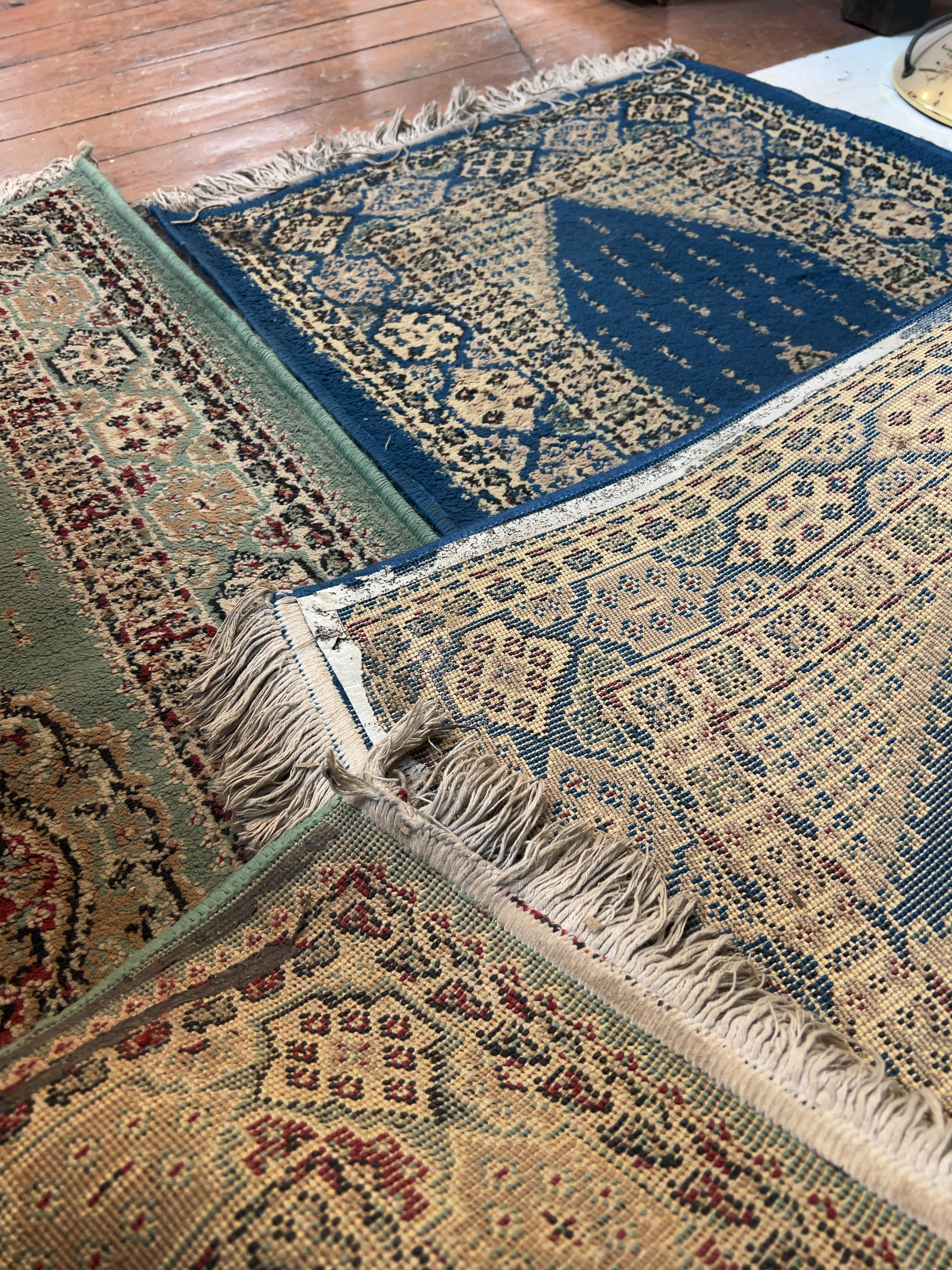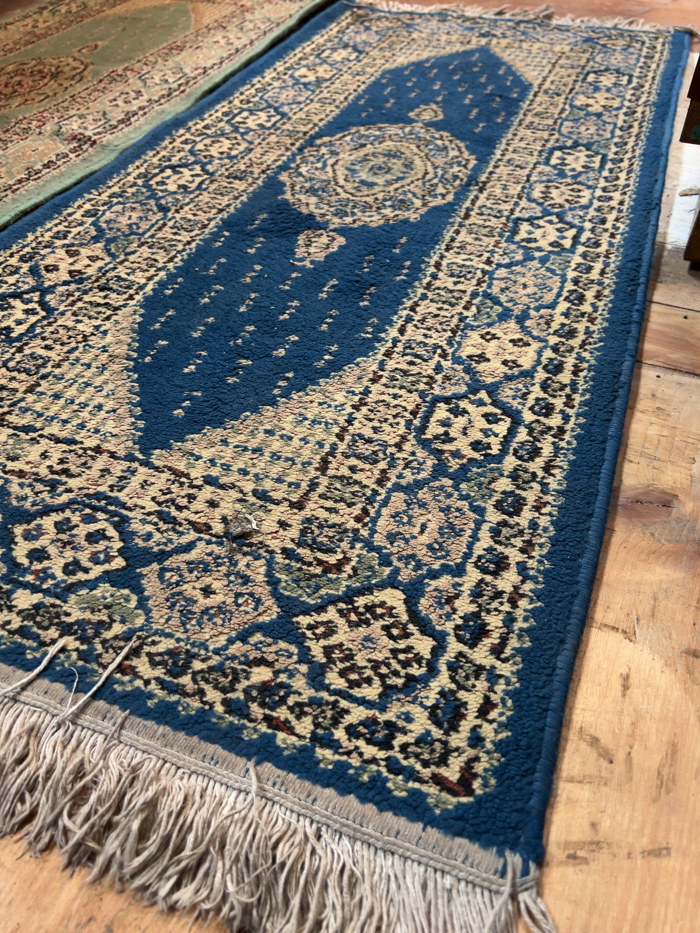Both rugs show signs of use and age. There is general surface wear and light staining throughout. The blue rug has a small pluck or hole in the central blue field. The fringes are discoloured, worn, and tangled in several places.