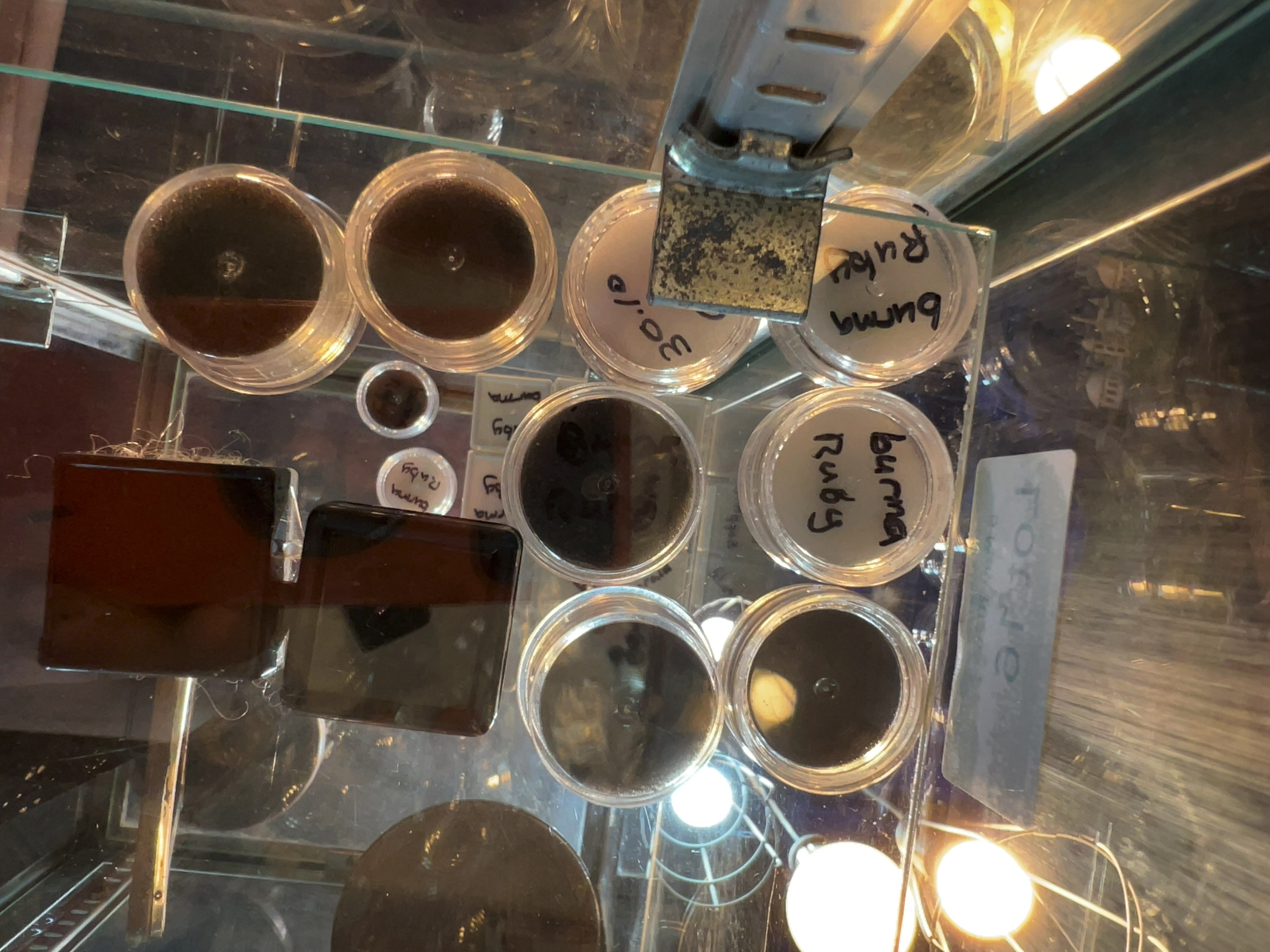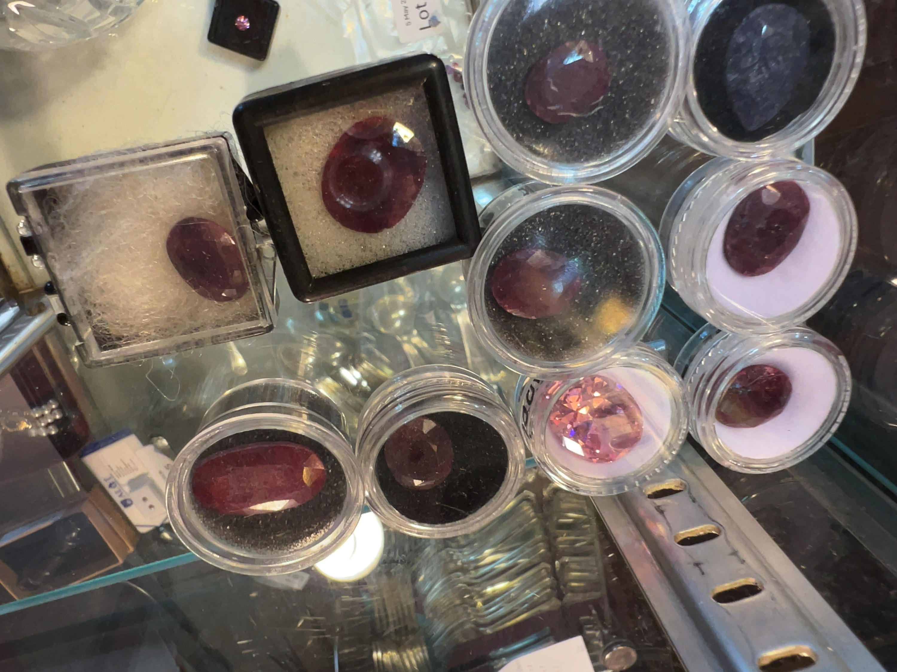 This lot comprises a collection of approximately ten loose faceted gemstones of various sizes, colours, and cuts, presented in individual clear plastic display containers. The collection consists primarily of deep purplish-red stones that appear to be rubies, consistent with handwritten labels present on several containers marked burma Ruby. One notable large specimen is a bright pink colour, appearing to be a pink sapphire, and another is a violet-blue pear-shaped specimen appearing to be a sapphire. The stones are variously cut, featuring oval and cushion brilliant styles in addition to the single pear-shaped stone. Many of the specimens exhibit visible internal inclusions and a translucent, sleepy appearance, while the pink specimen appears to have higher clarity. The gemstones are housed in plastic gem jars with black or white foam inserts and two small square display boxes. Although a business card for the Antwerp Laboratory for Gemstone Testing (ALGT) is visible in the background, no laboratory reports or certificates accompany this lot. One container lid is marked with the numerals 30.15, which may relate to a reference number or weight.
