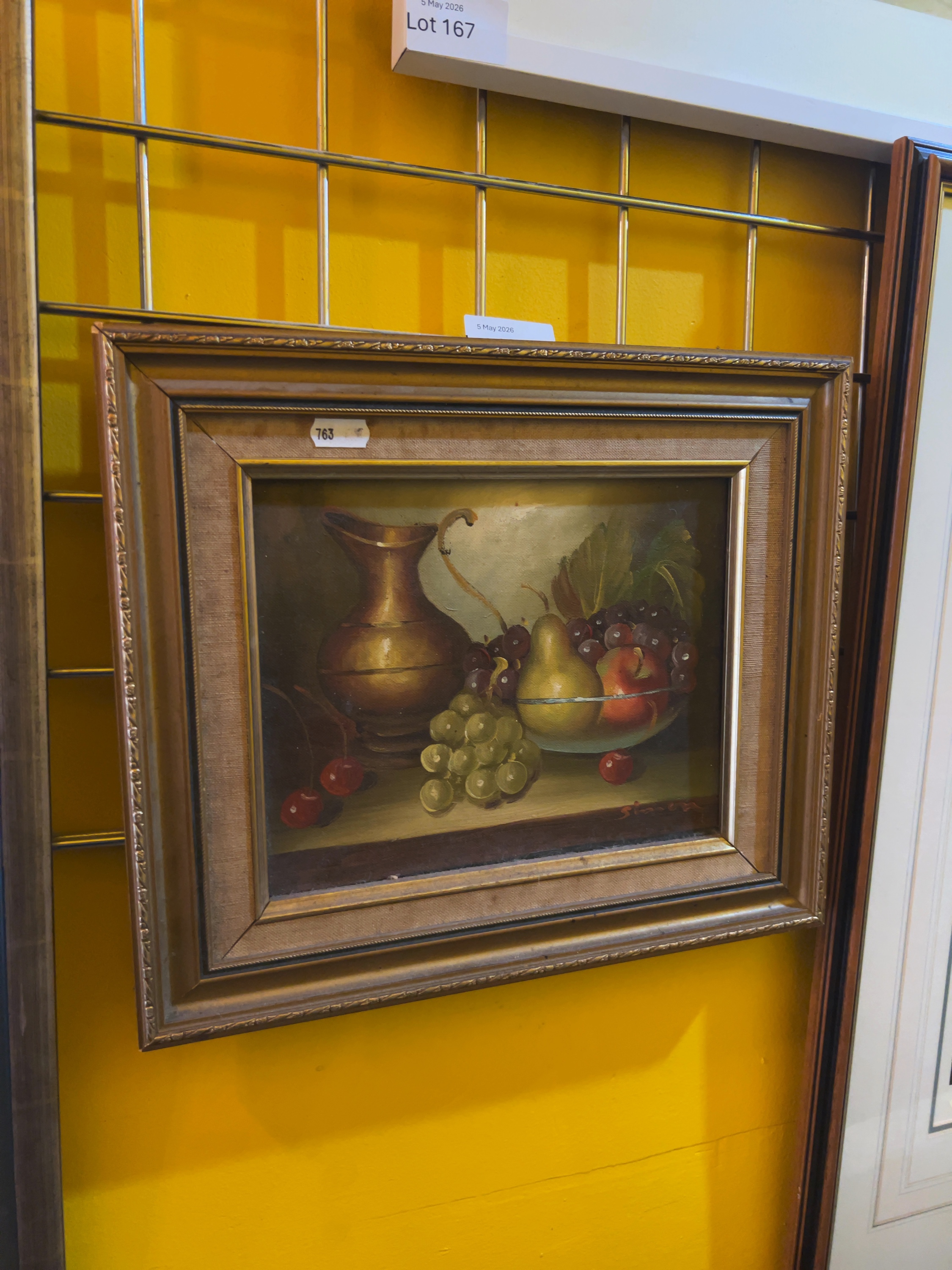 Simon (20th Century). A mid-20th-century still life composition depicting a metallic copper-toned jug positioned next to a glass bowl containing a pear, an apple, and purple grapes. Signed Simon in red paint to the lower right corner.